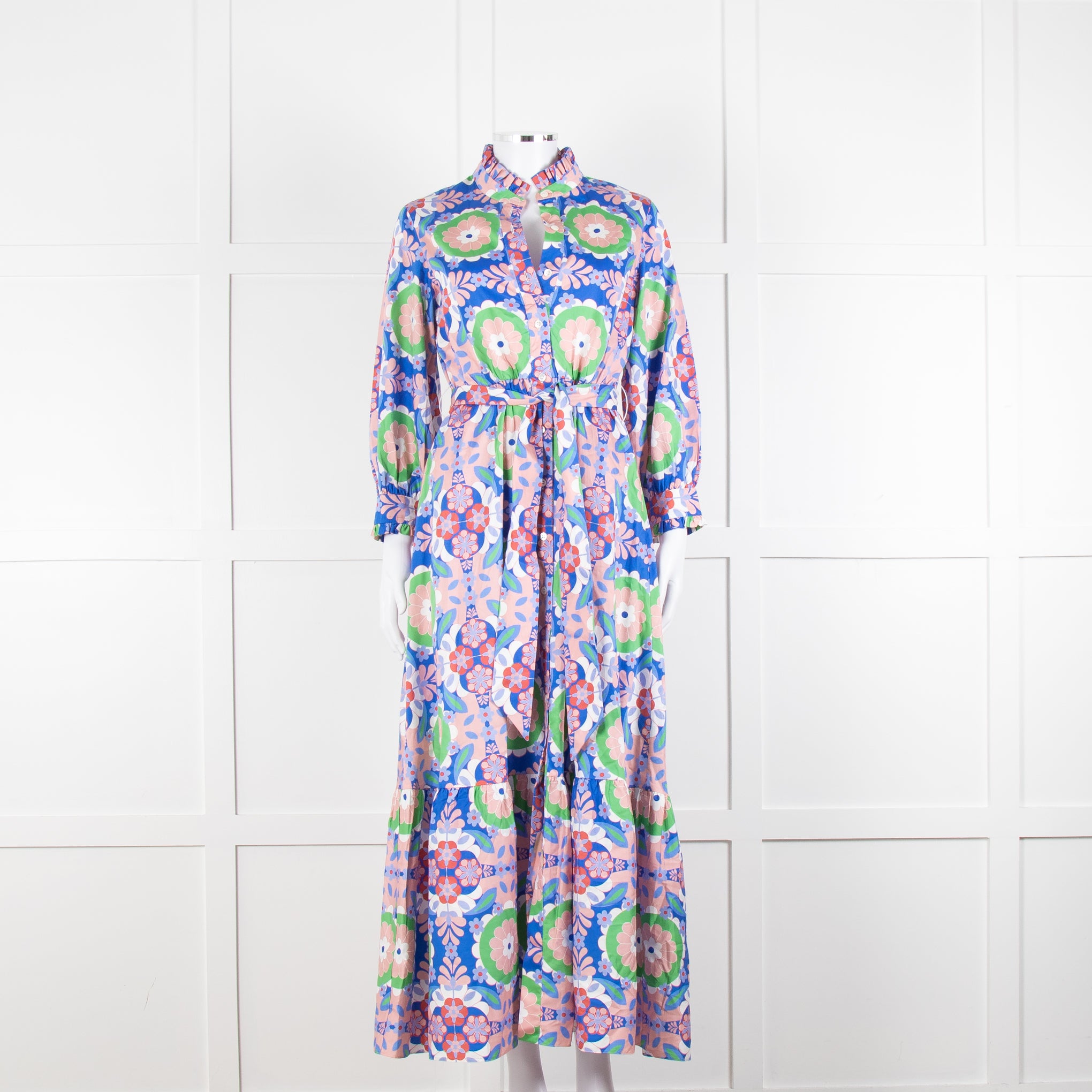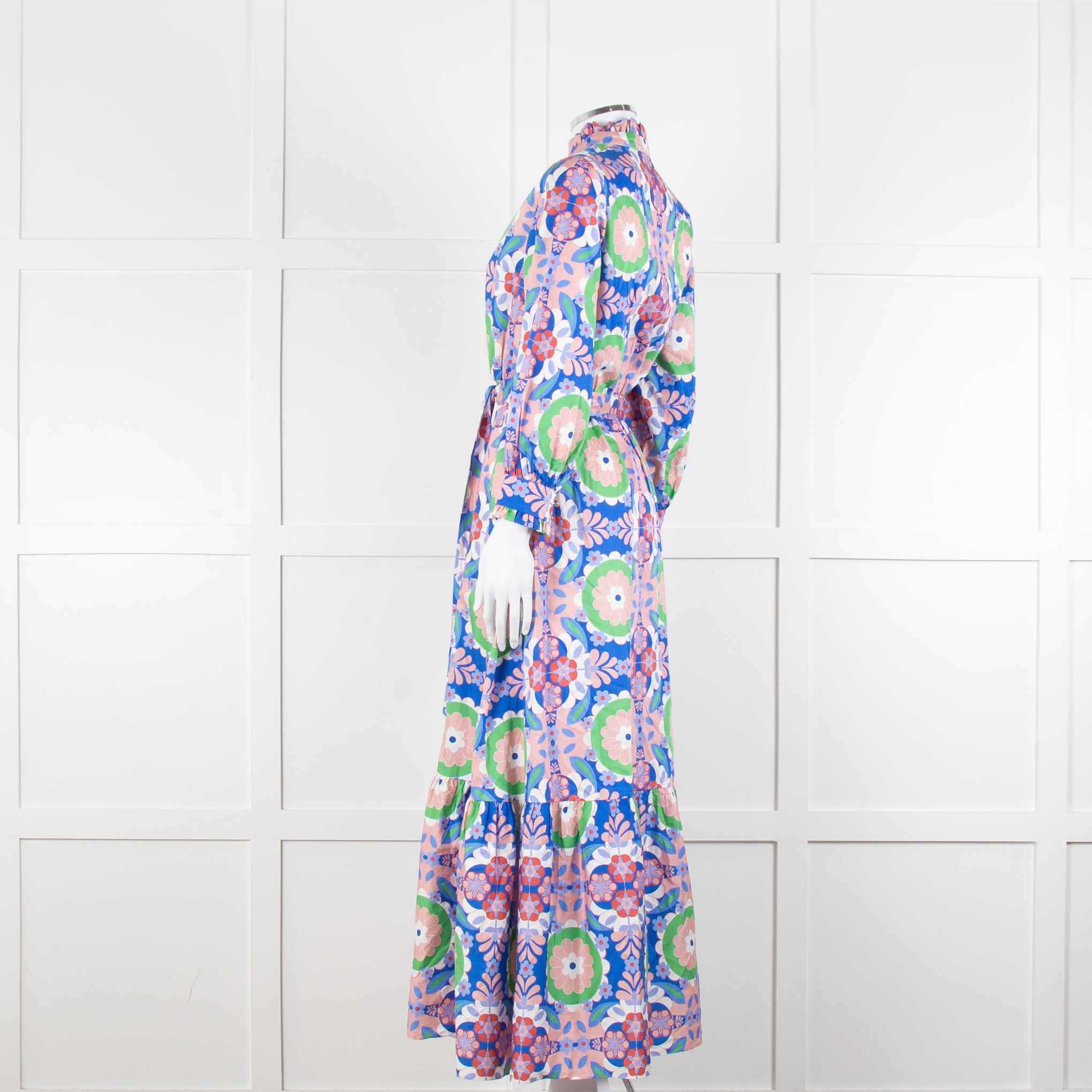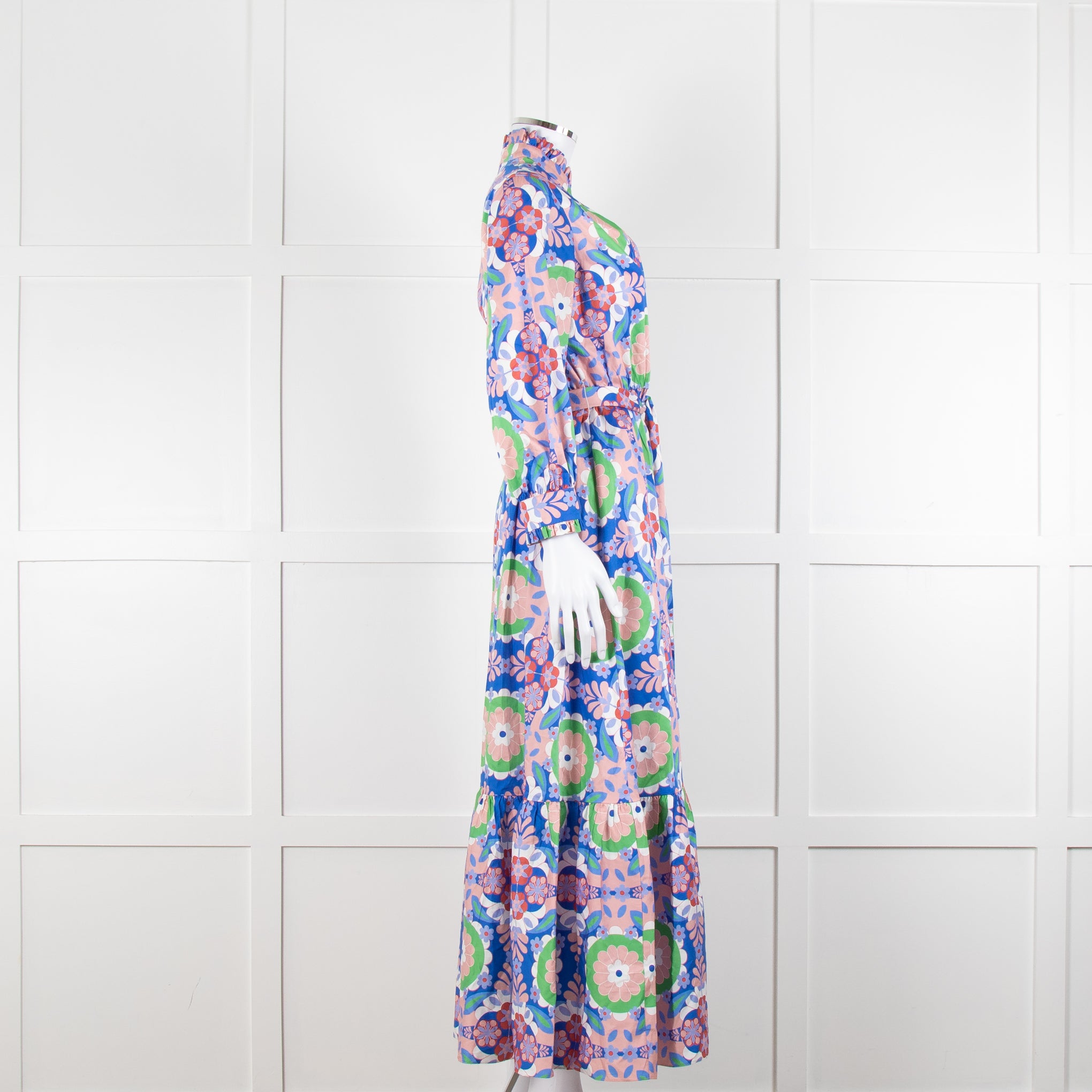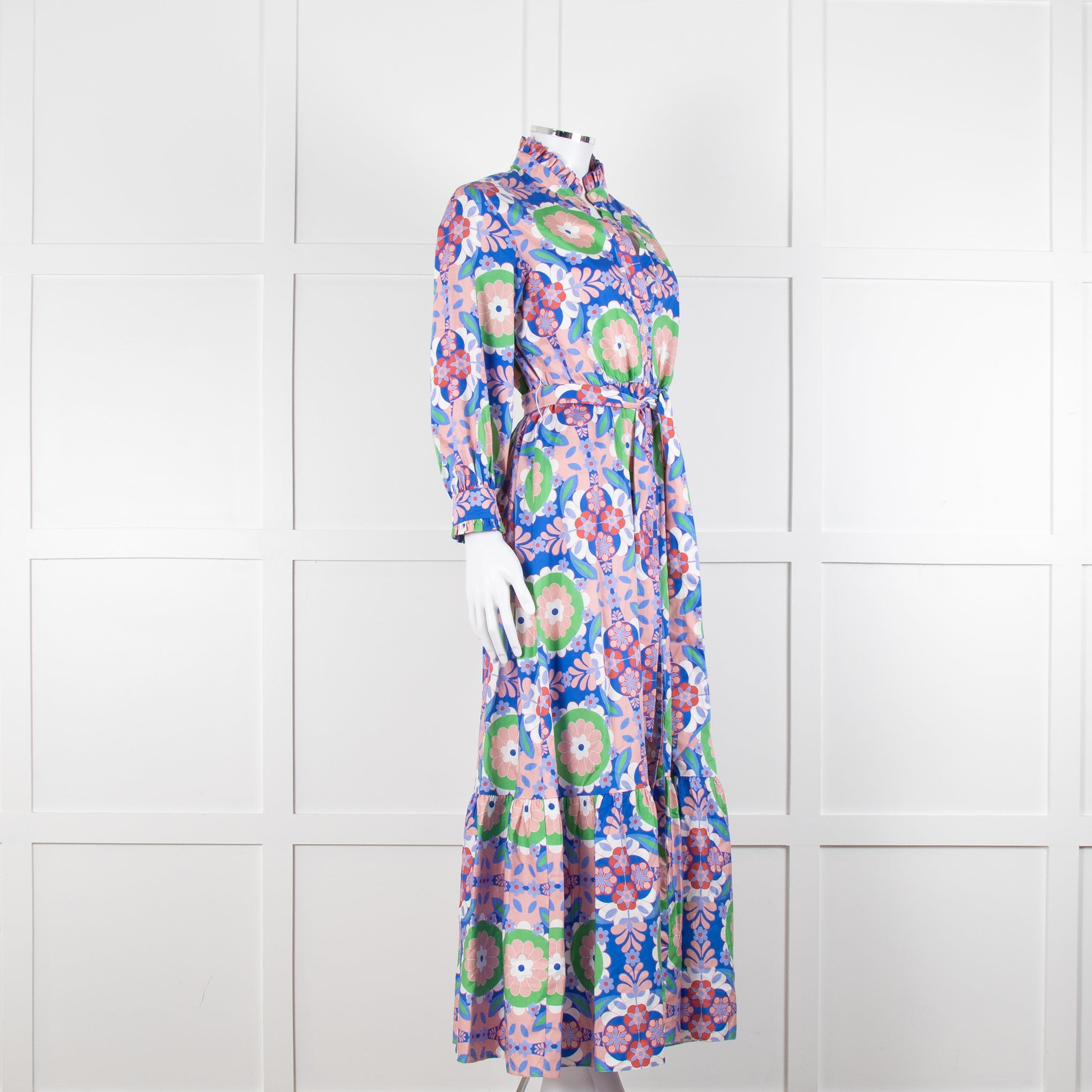 Borgo de Nor blue and pink floral cotton maxi dress with front button closure, a high neck, frilled trims, and a matching waist tie.