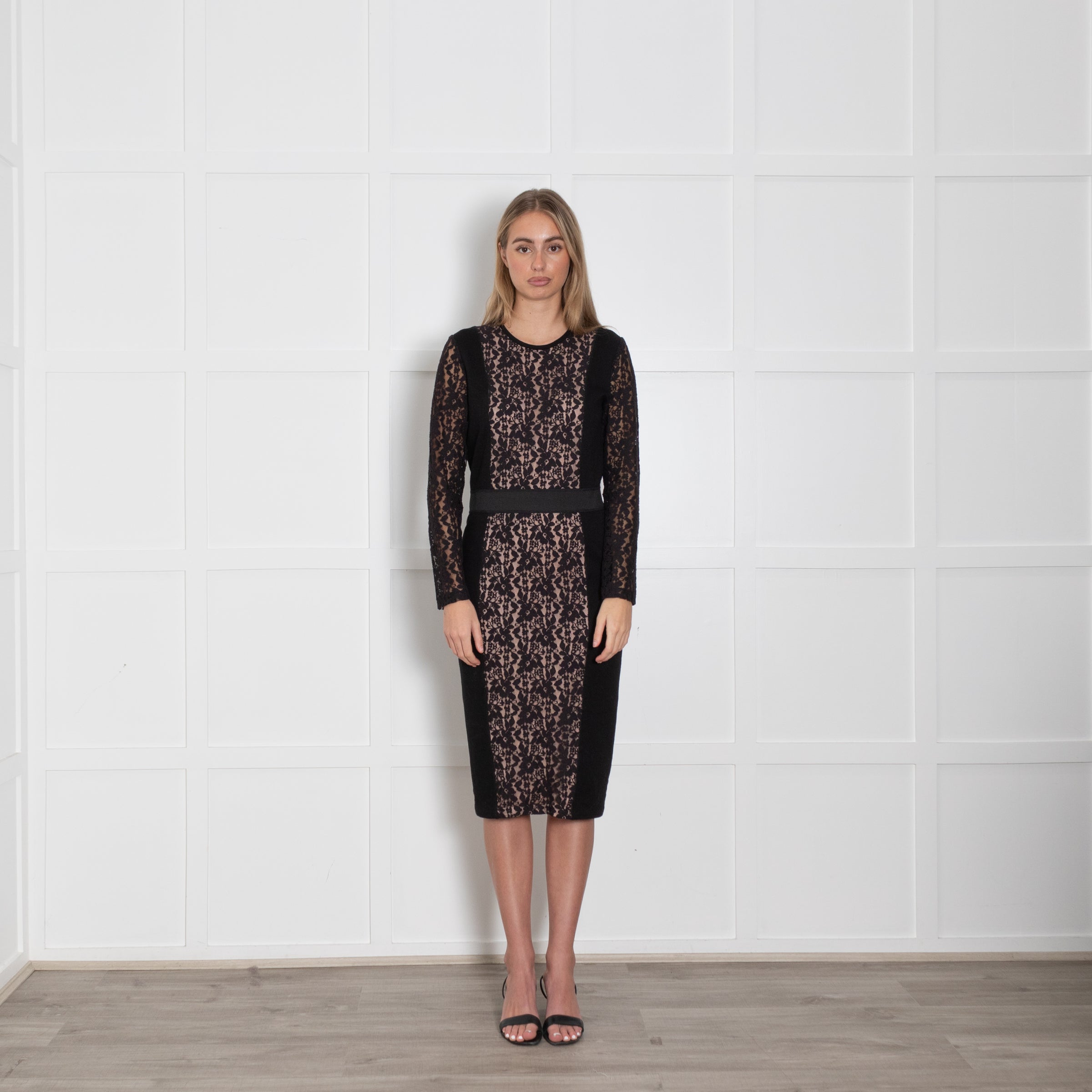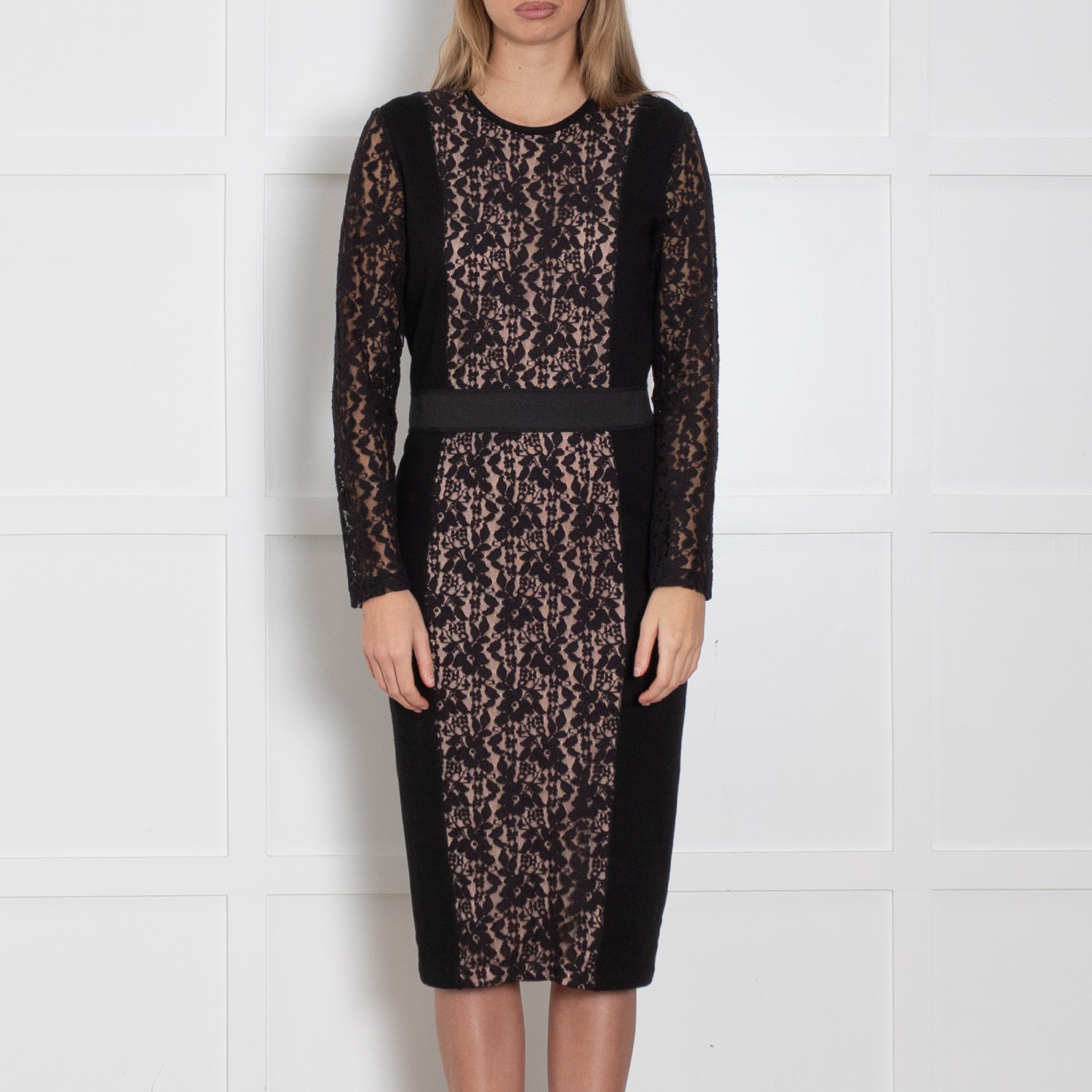 By Malene Birger, black lace long sleeve dress. Sheer lace, full-length arms with a banded waistline. Button-loop fastening to the back. Brand new with tags.