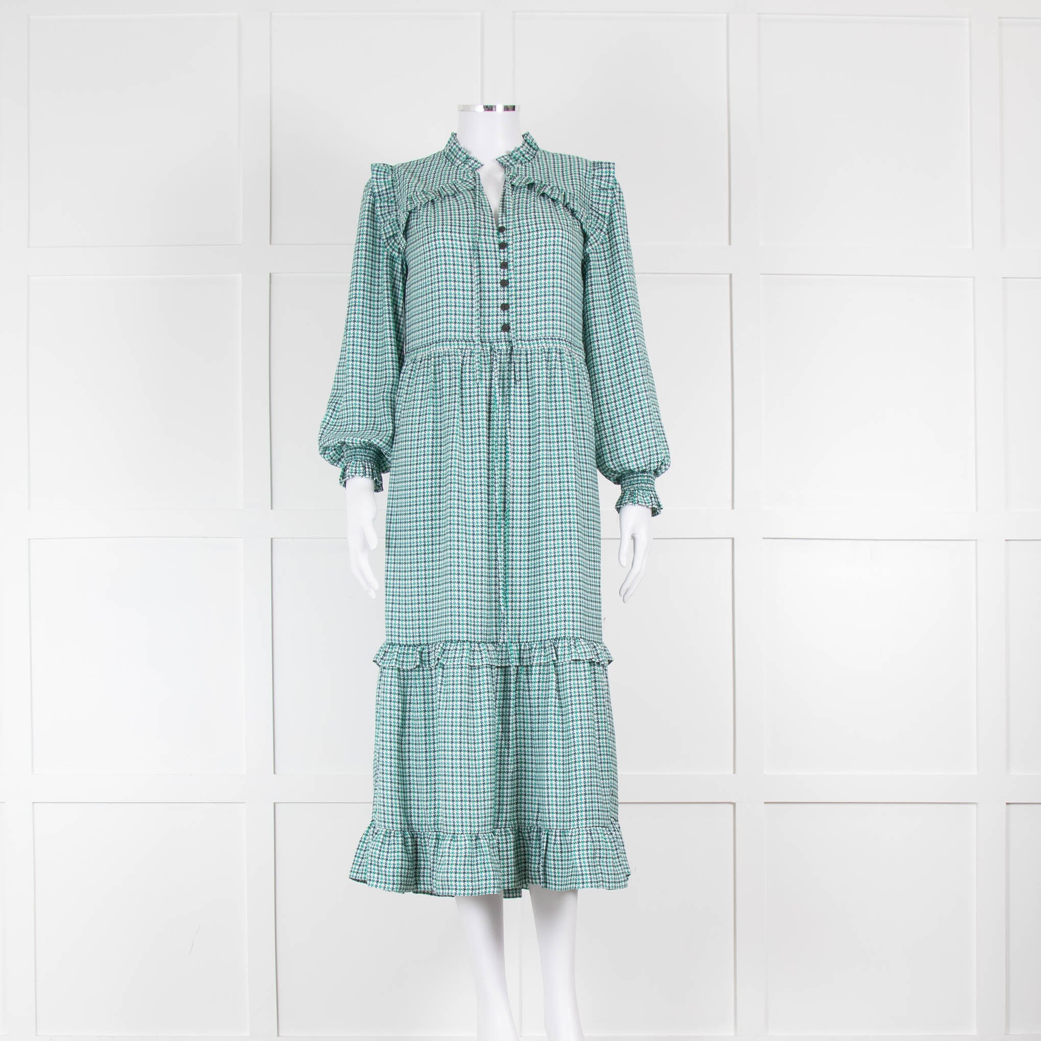 Cefinn green houndstooth print 'Loretta' dress with a tiered skirt, frill trim detailing, long sleeves gathered into smocked cuffs, a drawstring waistband, hand-tied neck strings, buttons down the front of the top, and side slip pockets. Current season new with tags RRP £320.