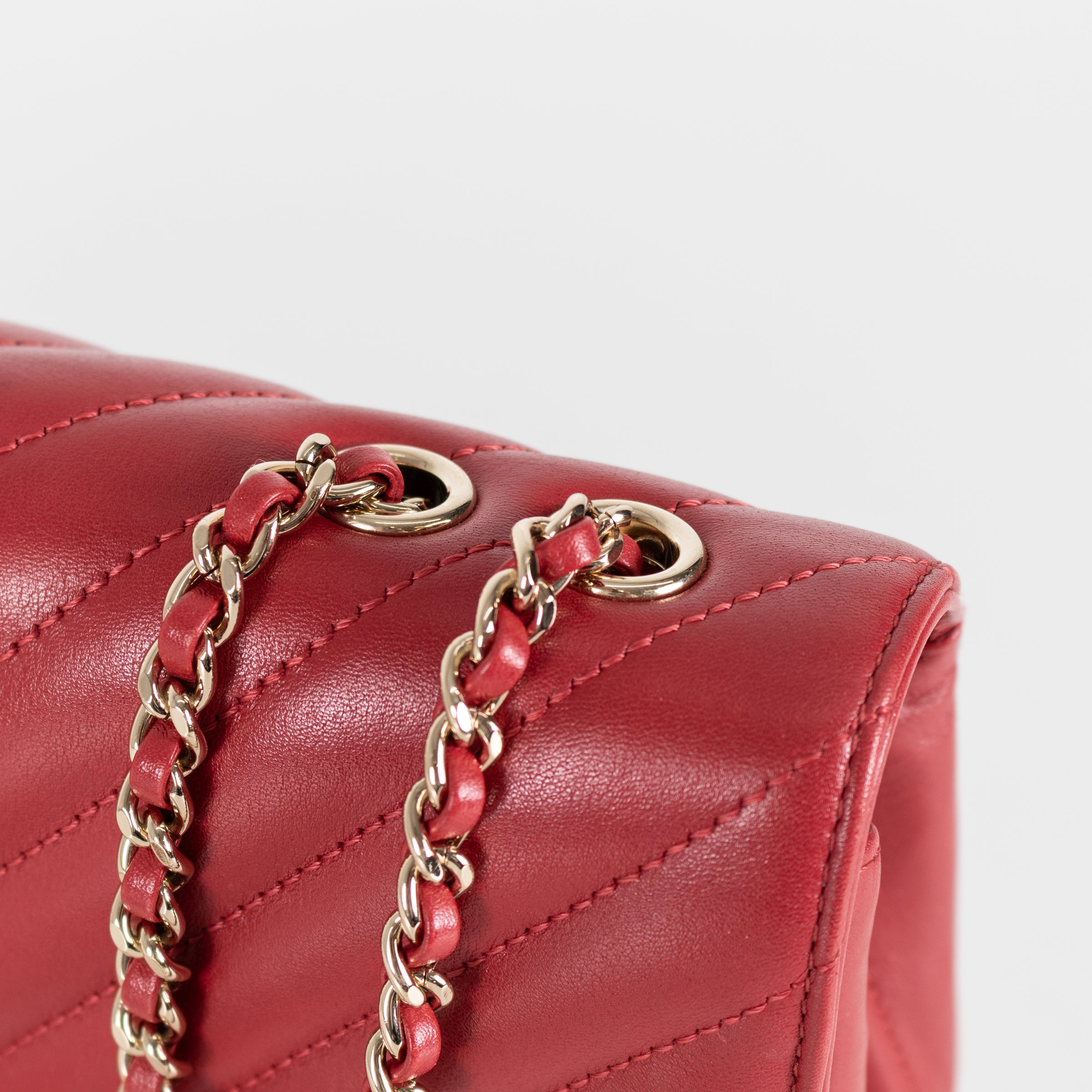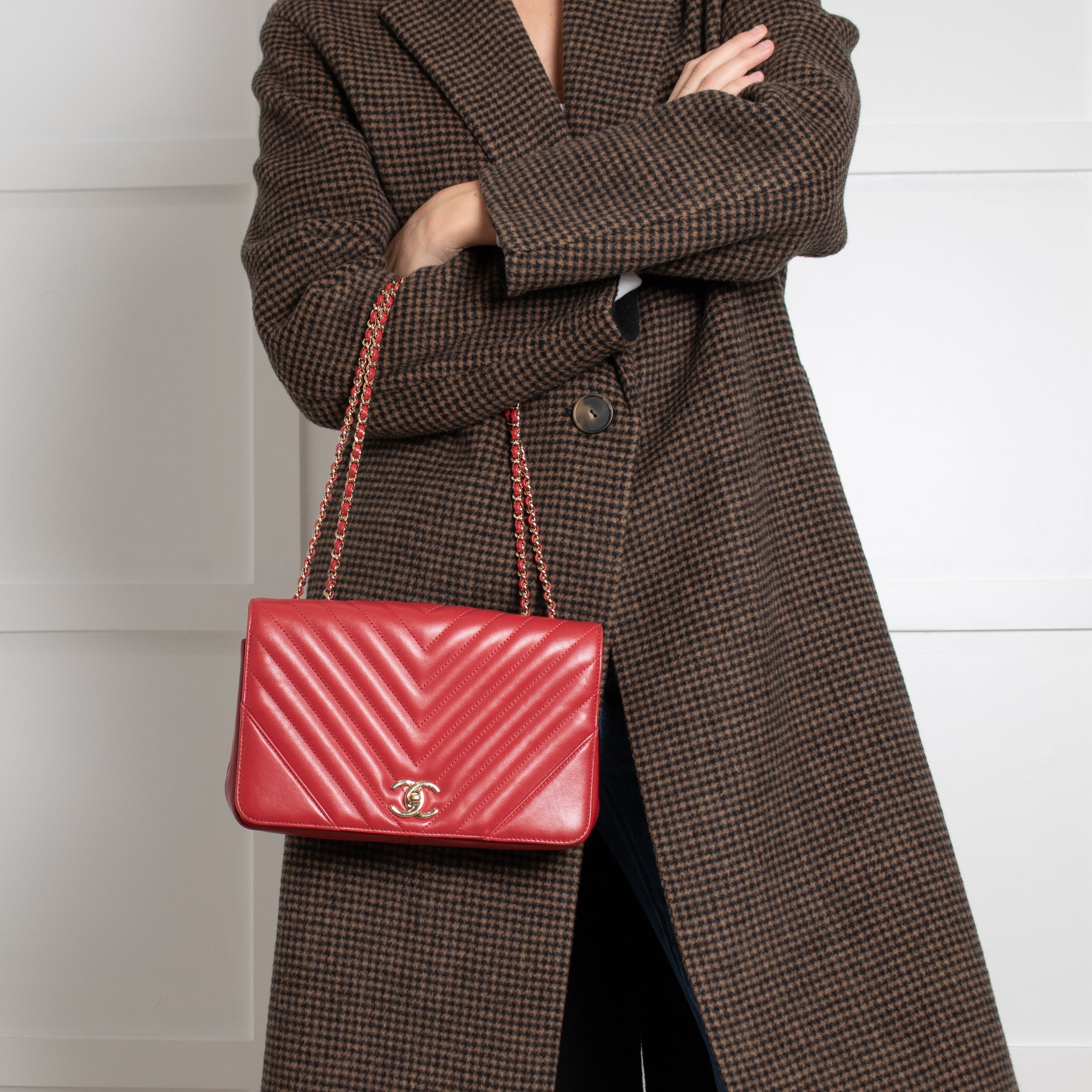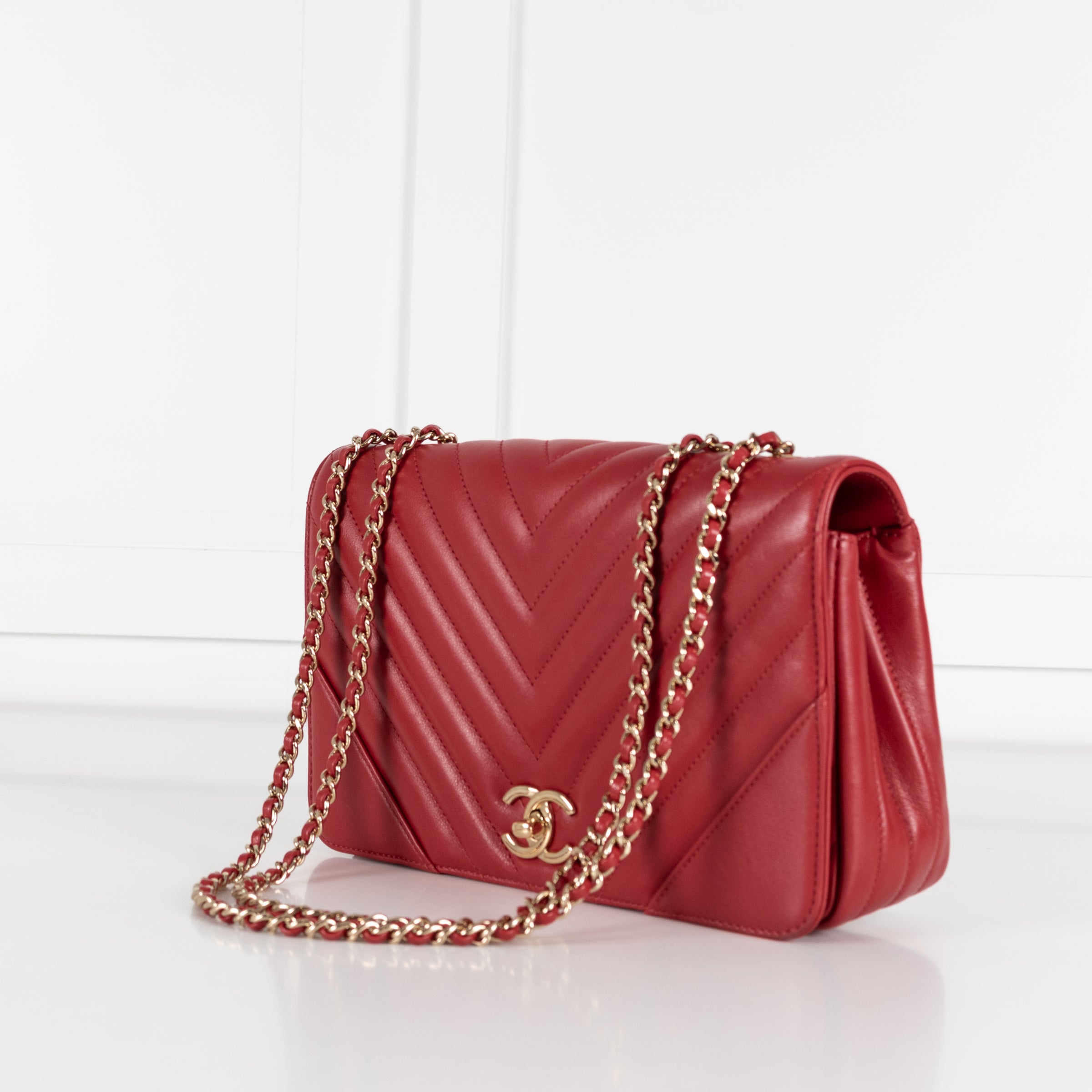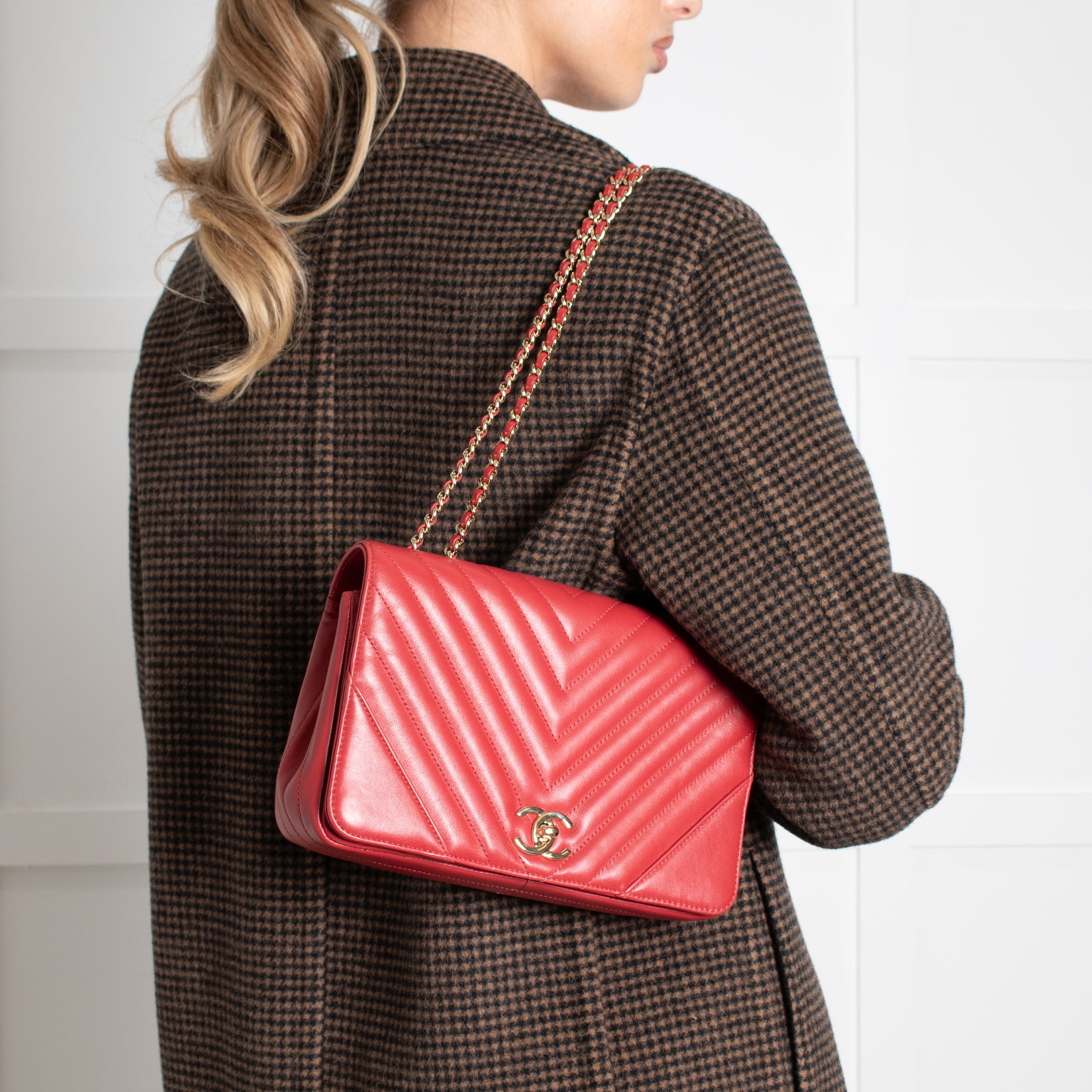 Chanel (2019) red chevron flap bag. Crafted from smooth red structured calfskin and finished with gold hardware. Featuring an interlocking chain and leather strap, and the signature Chanel CC turn-lock closure. This bag has one main internal compartment with one side zipped pocket.