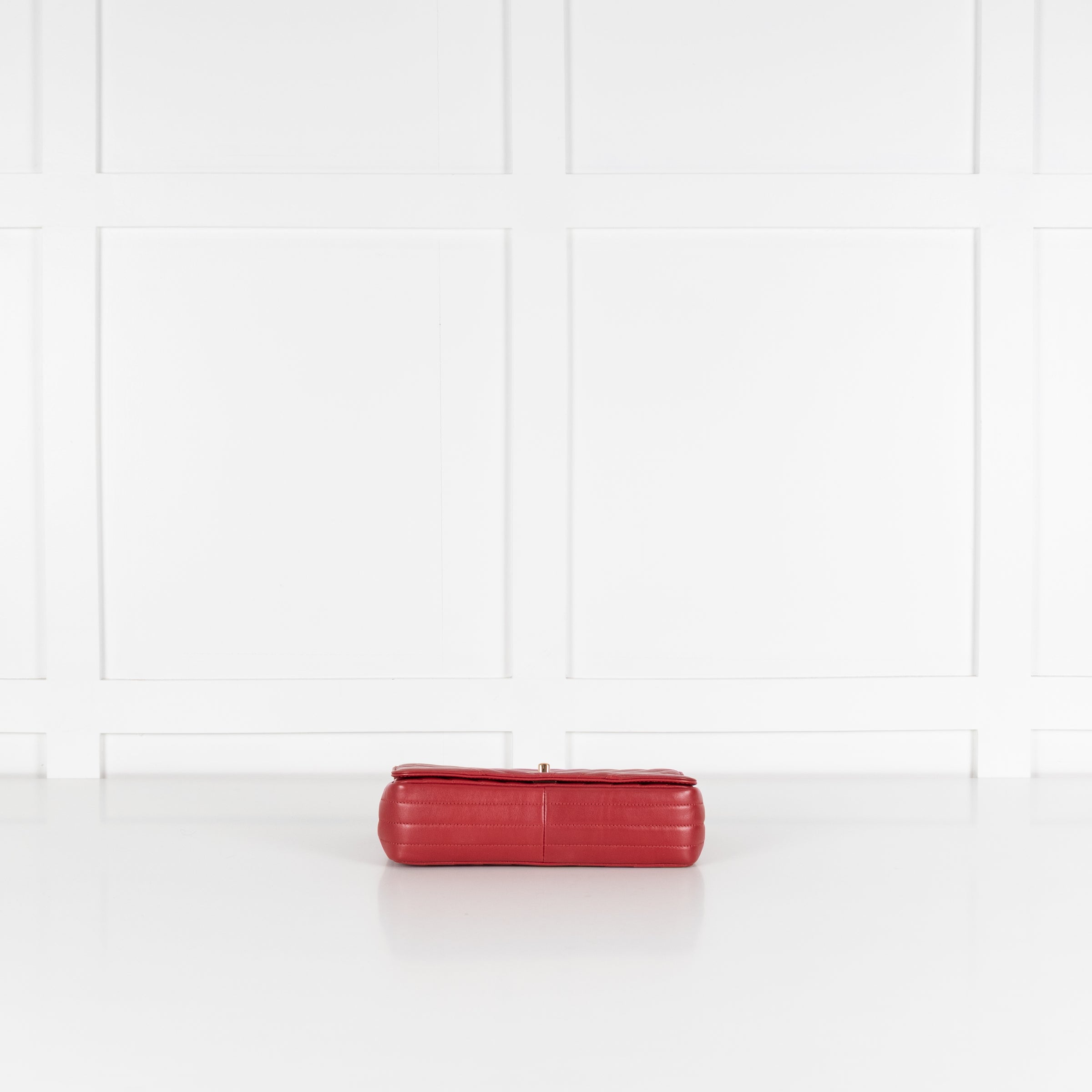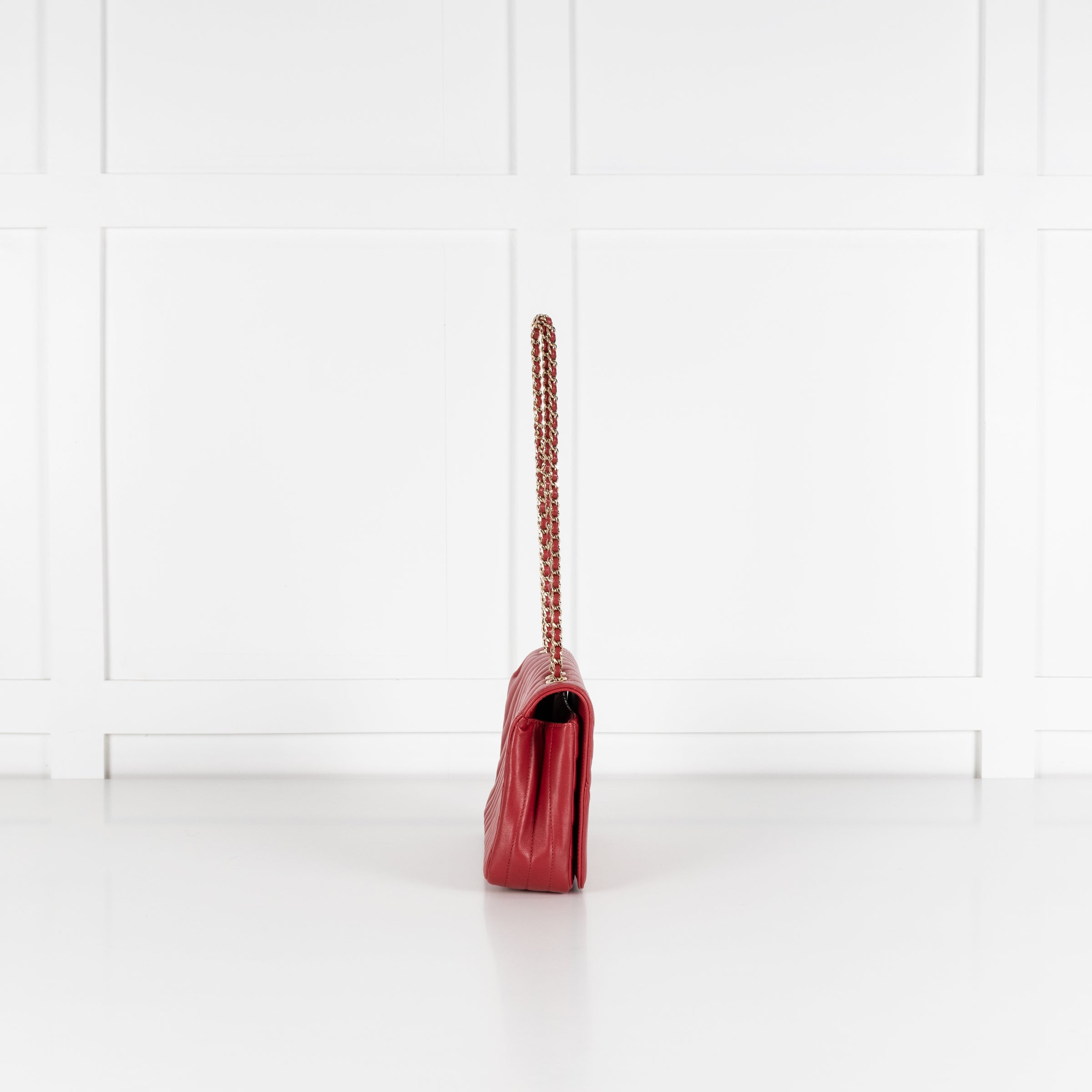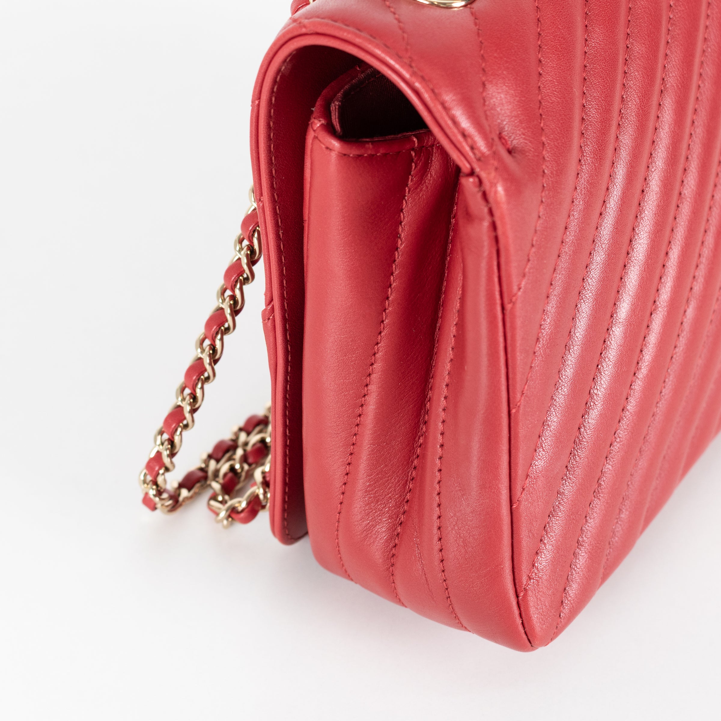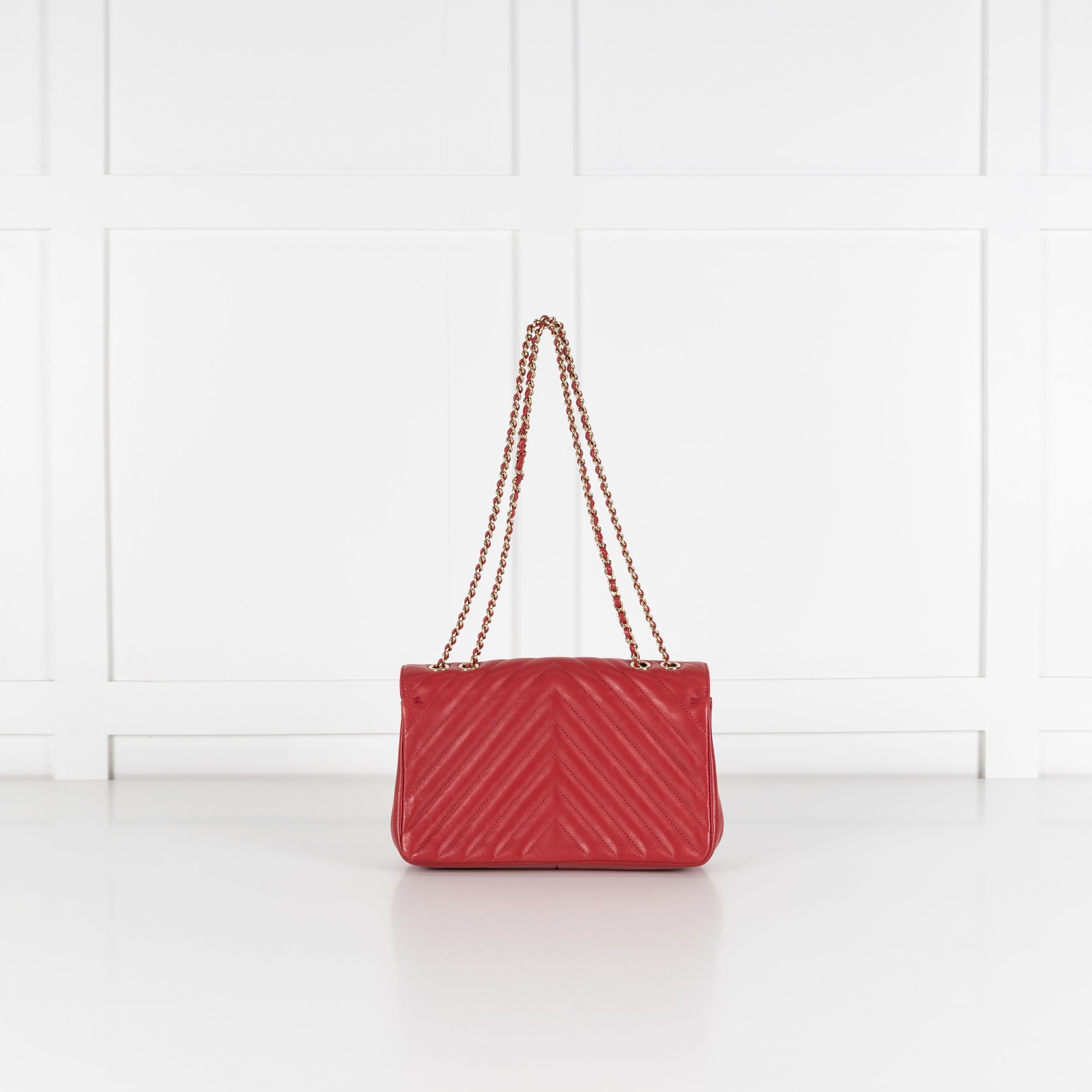 Chanel (2019) red chevron flap bag. Crafted from smooth red structured calfskin and finished with gold hardware. Featuring an interlocking chain and leather strap, and the signature Chanel CC turn-lock closure. This bag has one main internal compartment with one side zipped pocket.