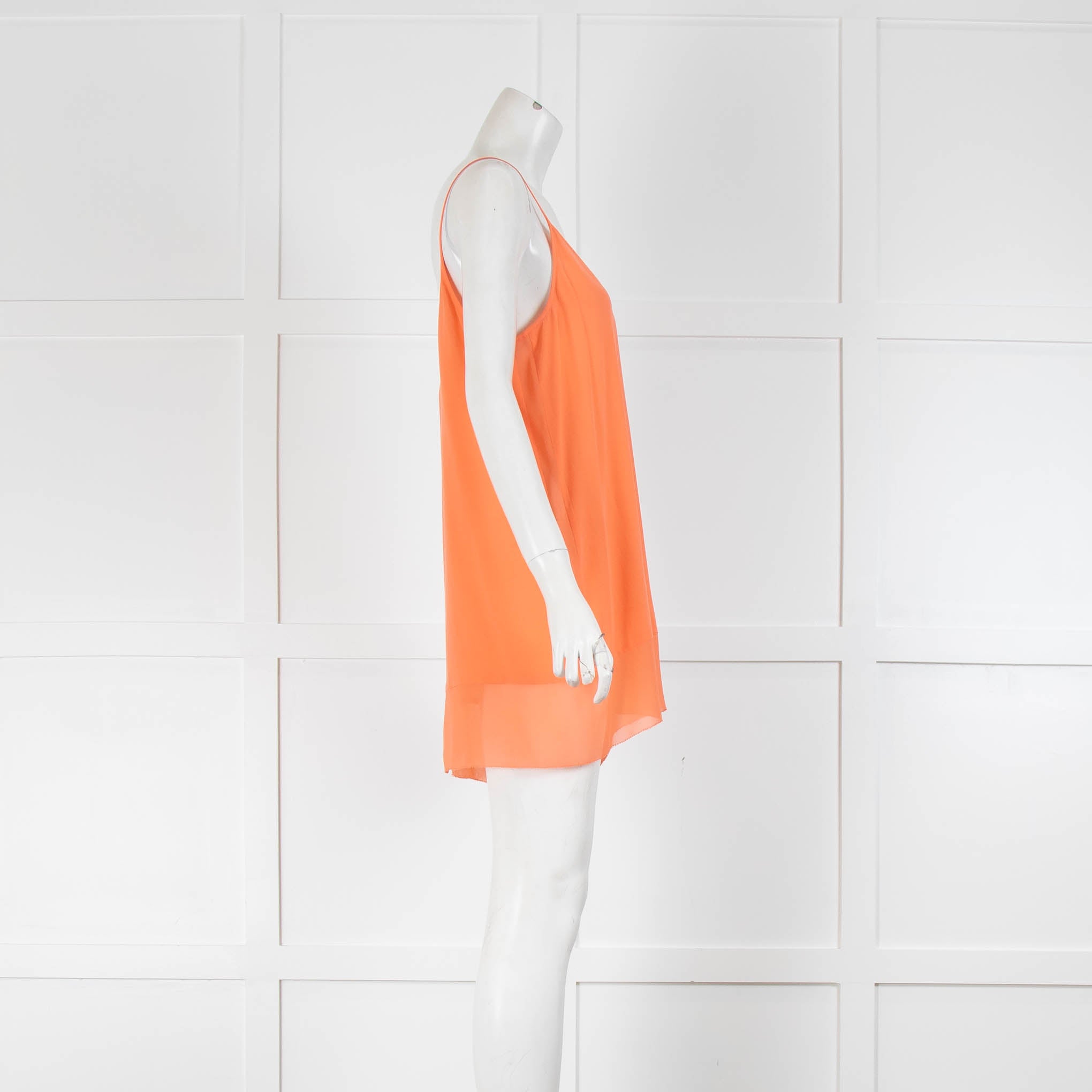 Charli orange silk crepe de chine longline cami, thin spaghetti straps, chiffon panel at the hem, and a round neckline.
