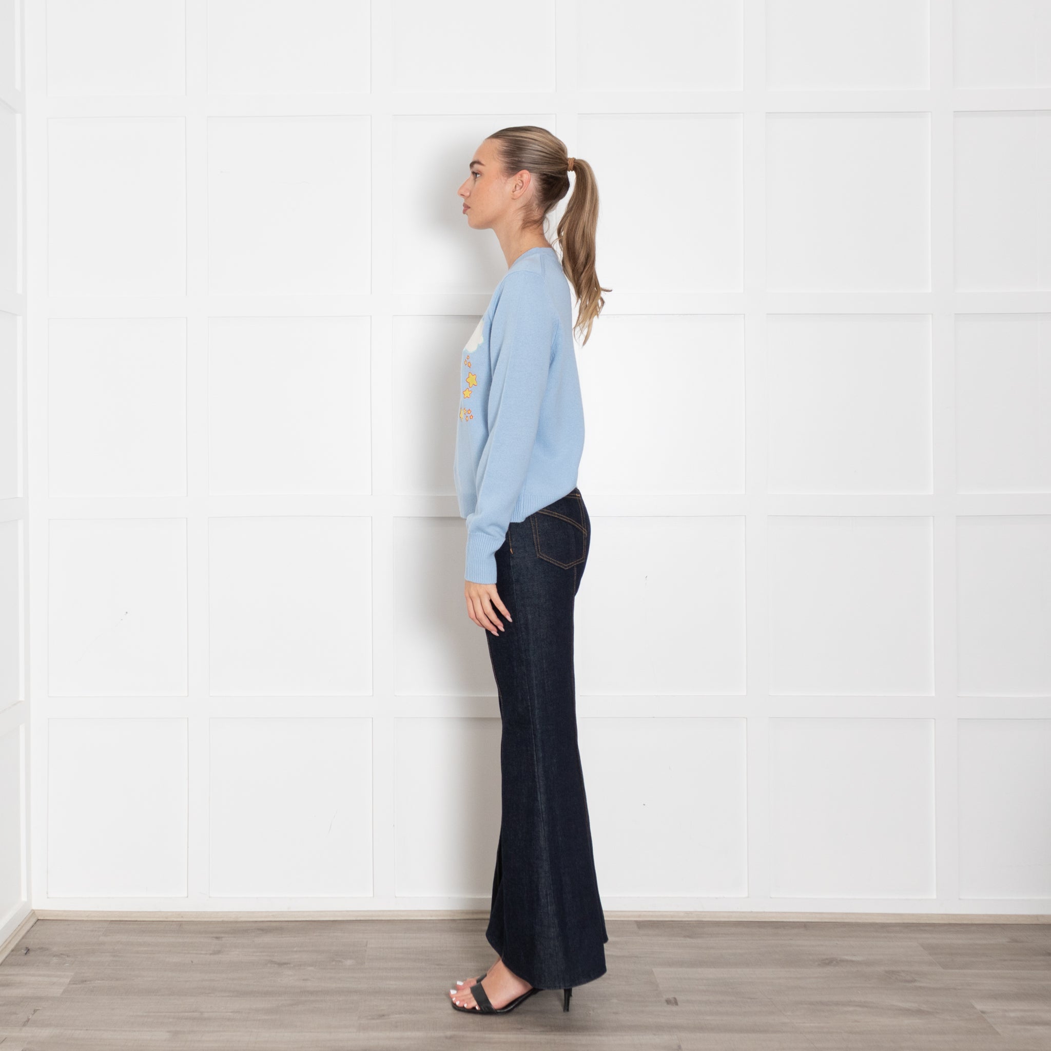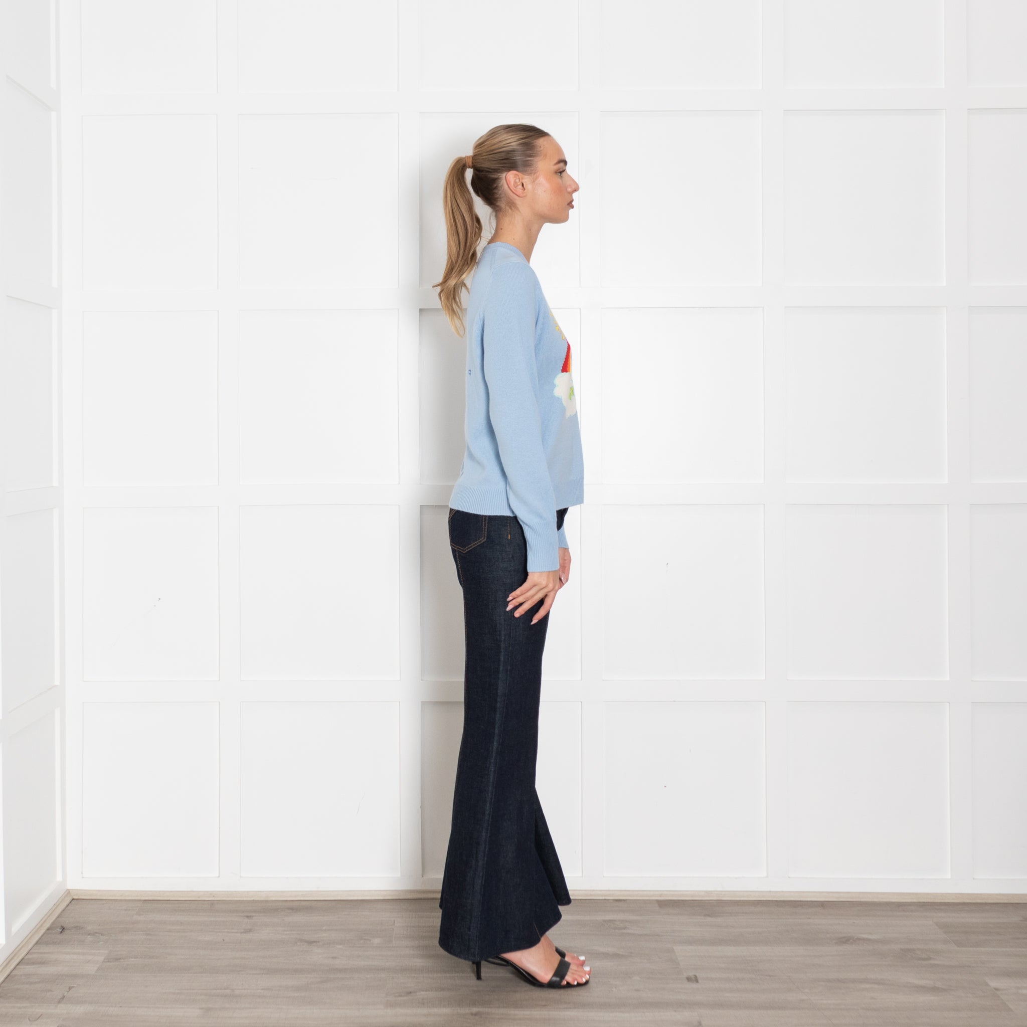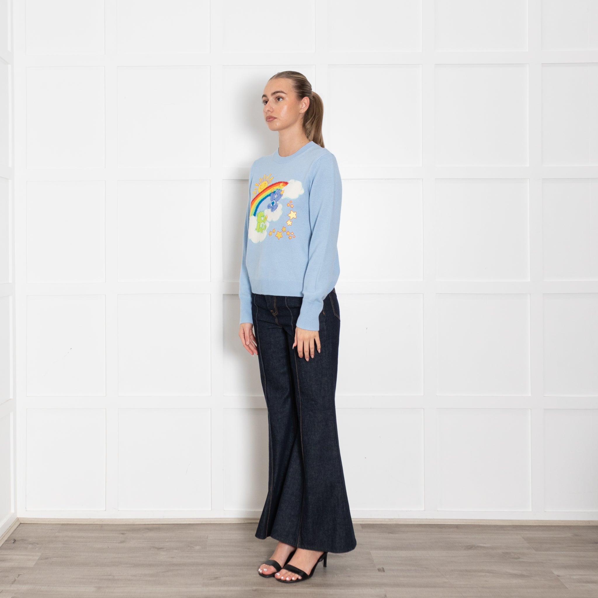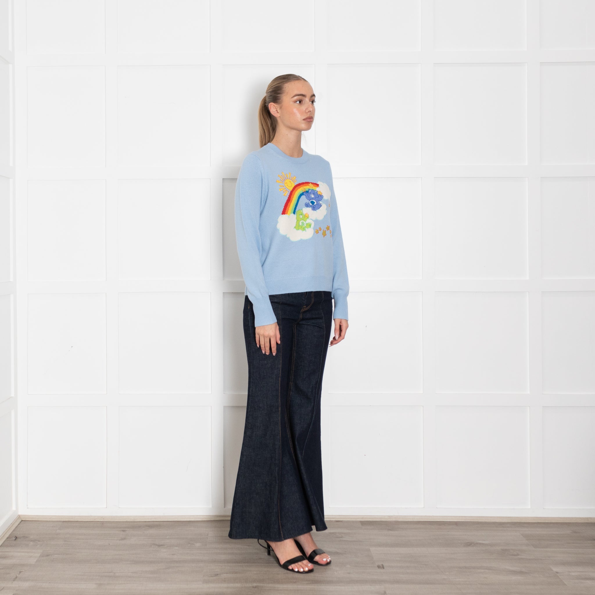 CHINTI & PARKER long-sleeve care bear jumper, crafted with a soft wool and cashmere mixed fabric, with a carebear motif on the front featuring a rainbow, and two bears on clouds, classic and iconic design.