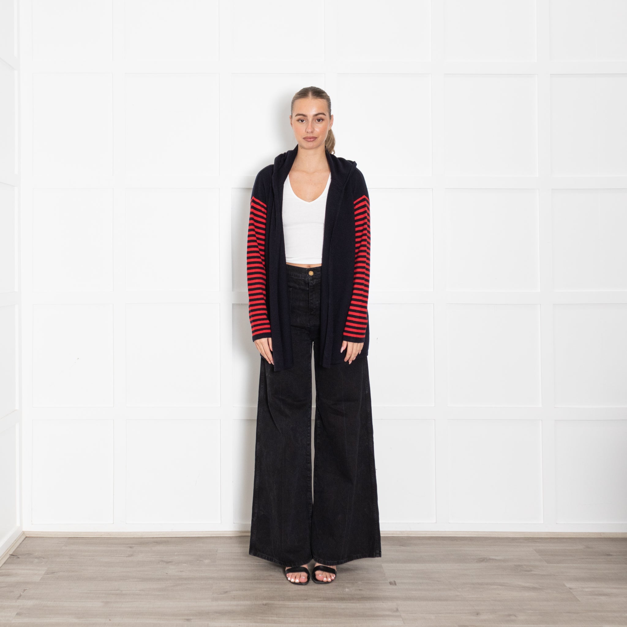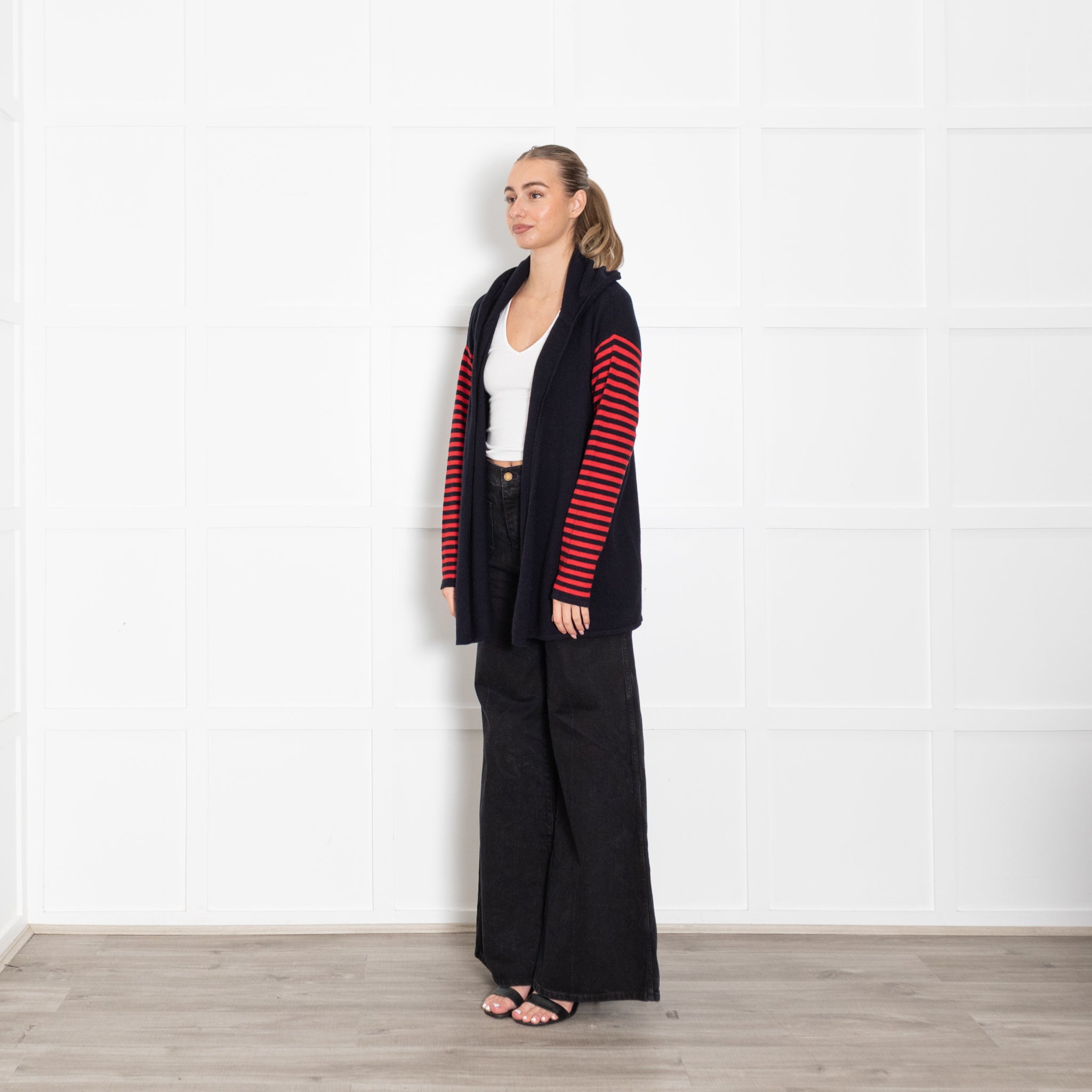 CHINTI & PARKER navy blue cardigan, featuring an open front, a matching navy hood, with a red striped sleeve design, crafted entirely from a soft cashmere fabric.
