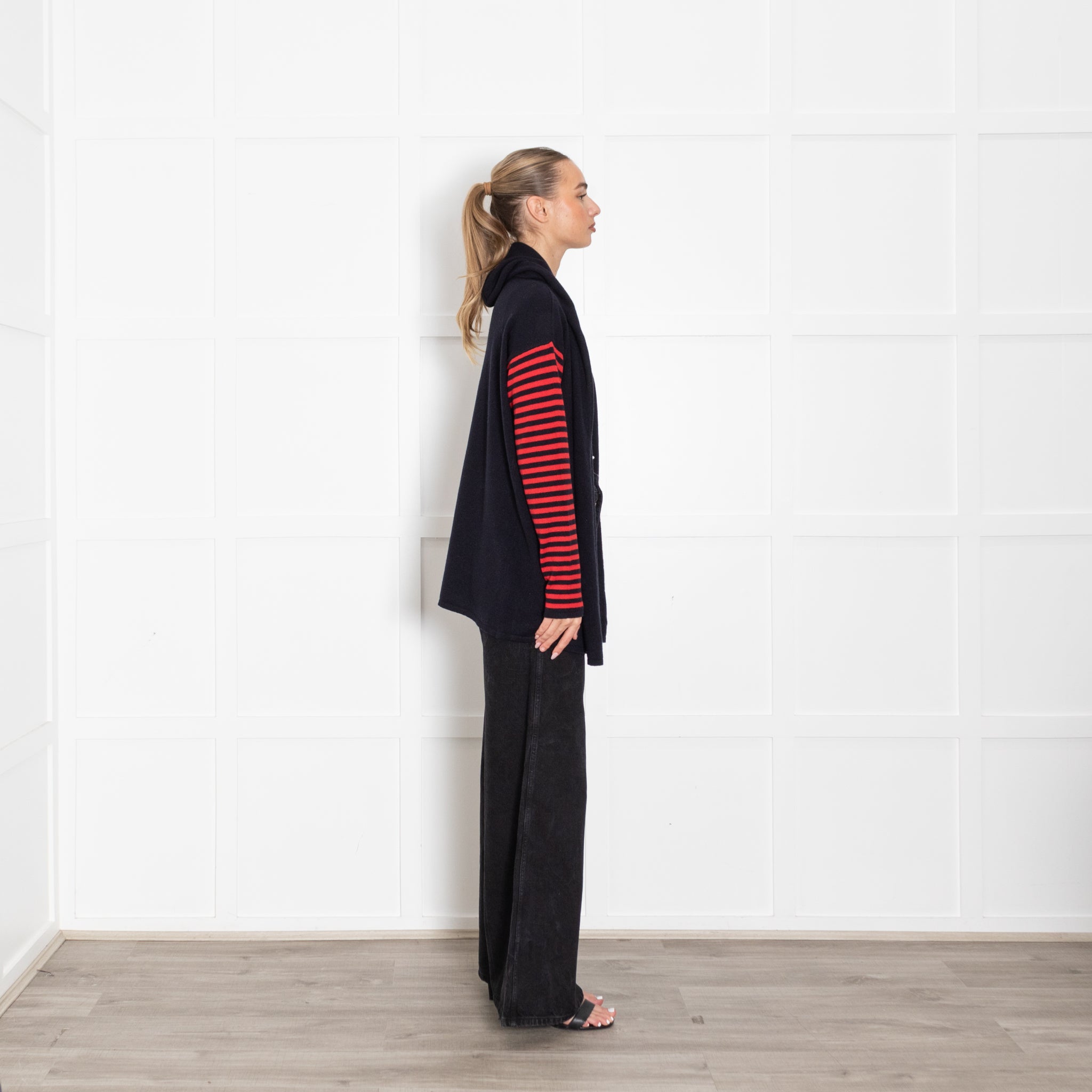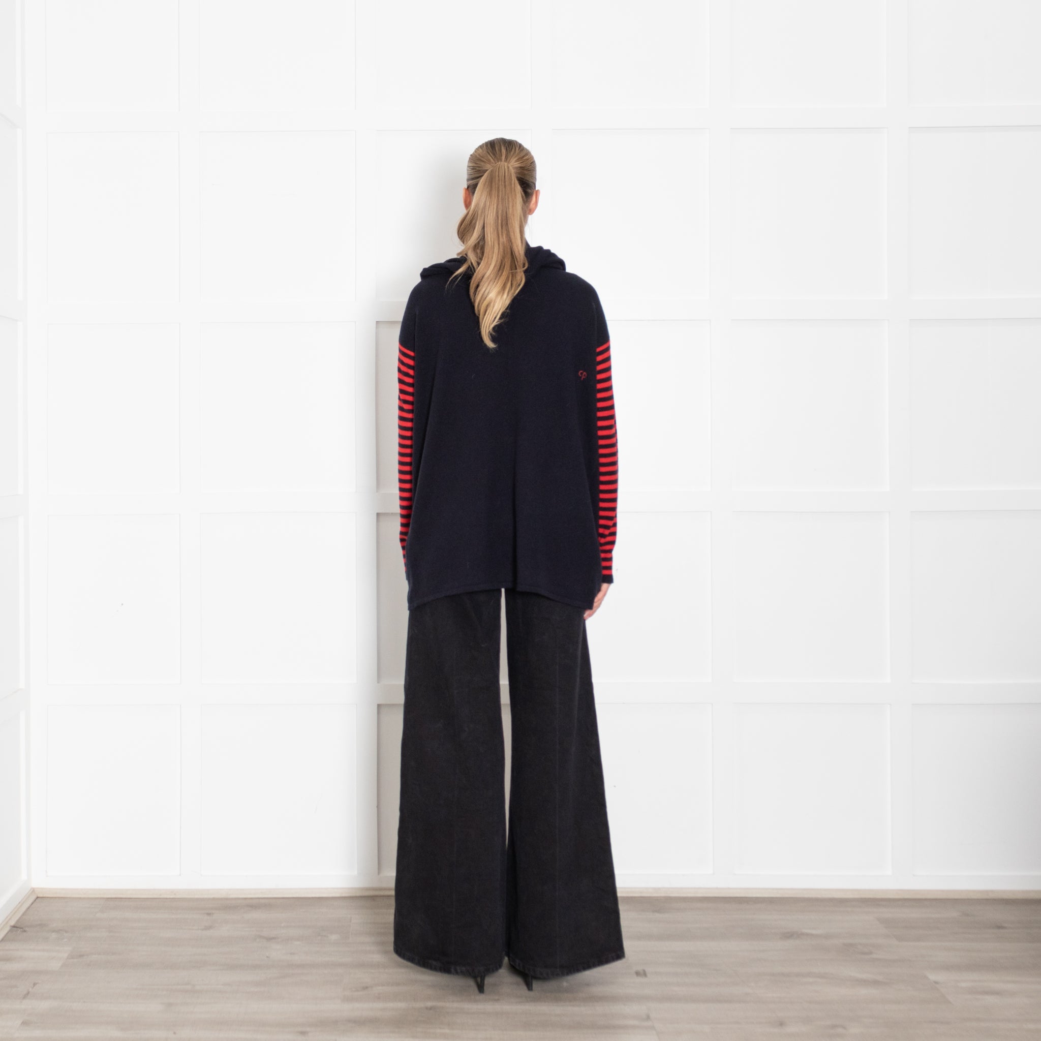 CHINTI & PARKER Navy Blue Cashmere Cardigan With Hood And Red Striped Sleeve