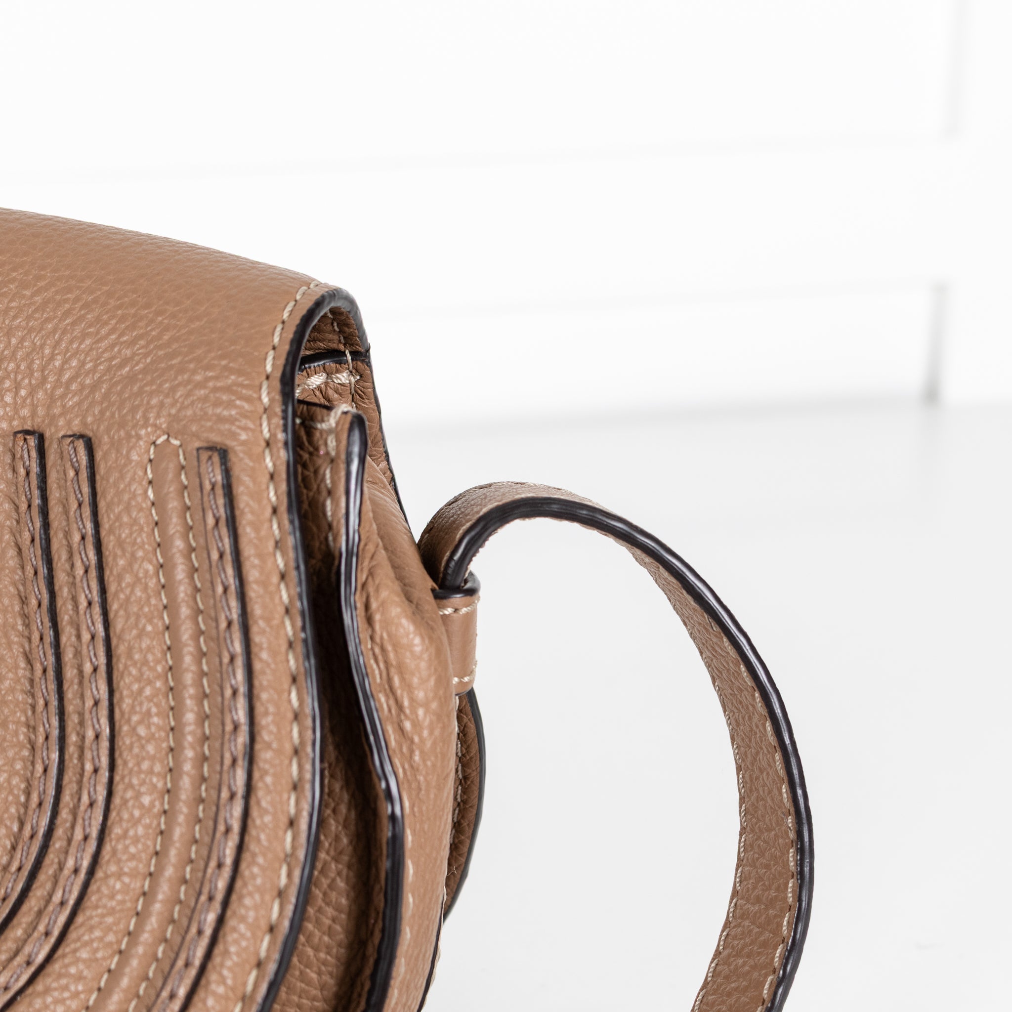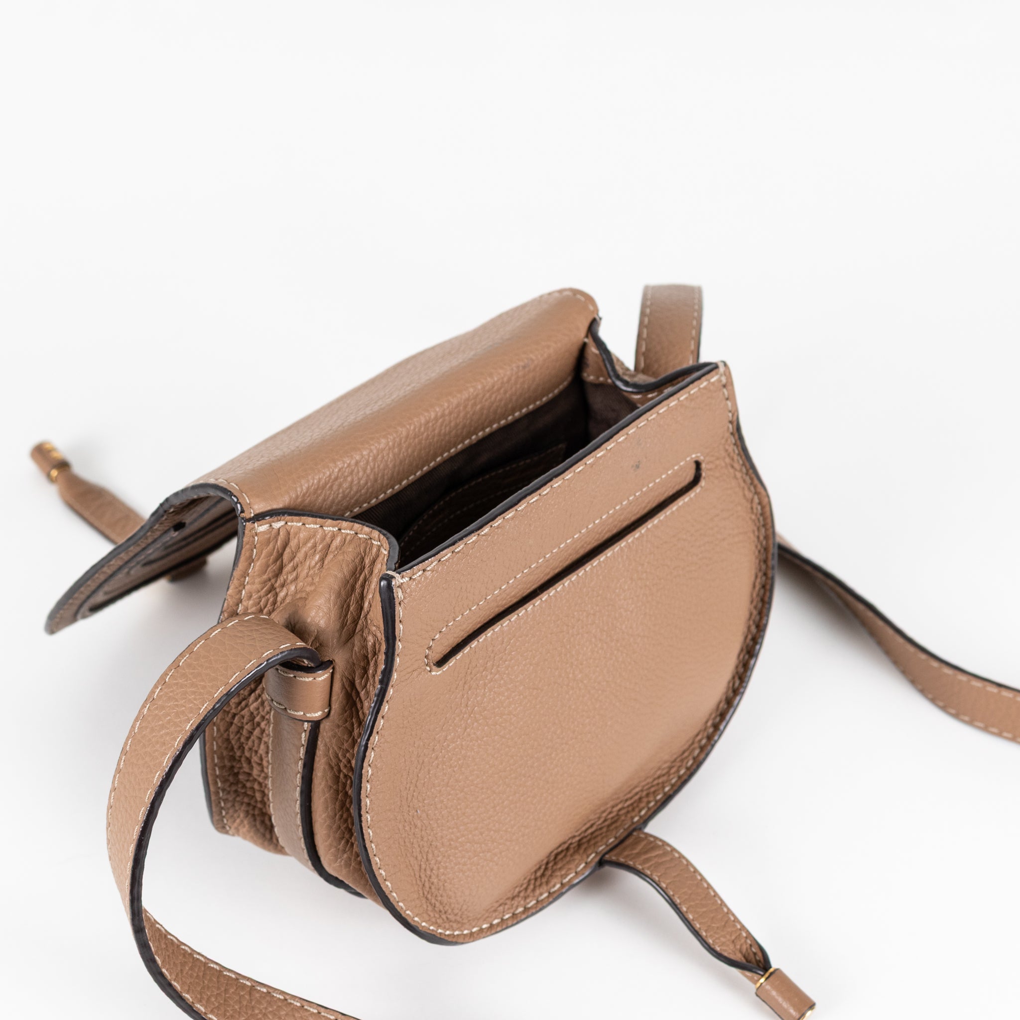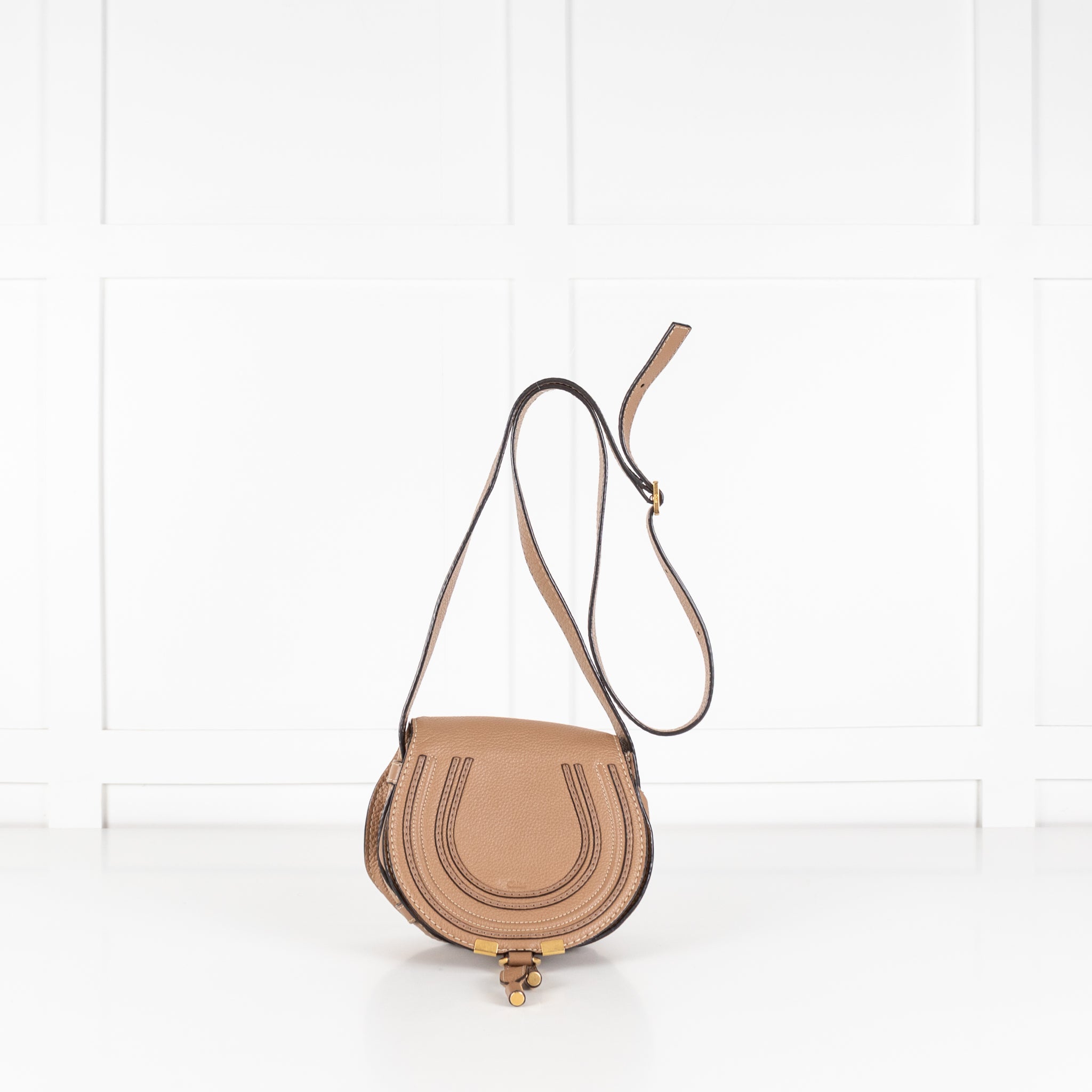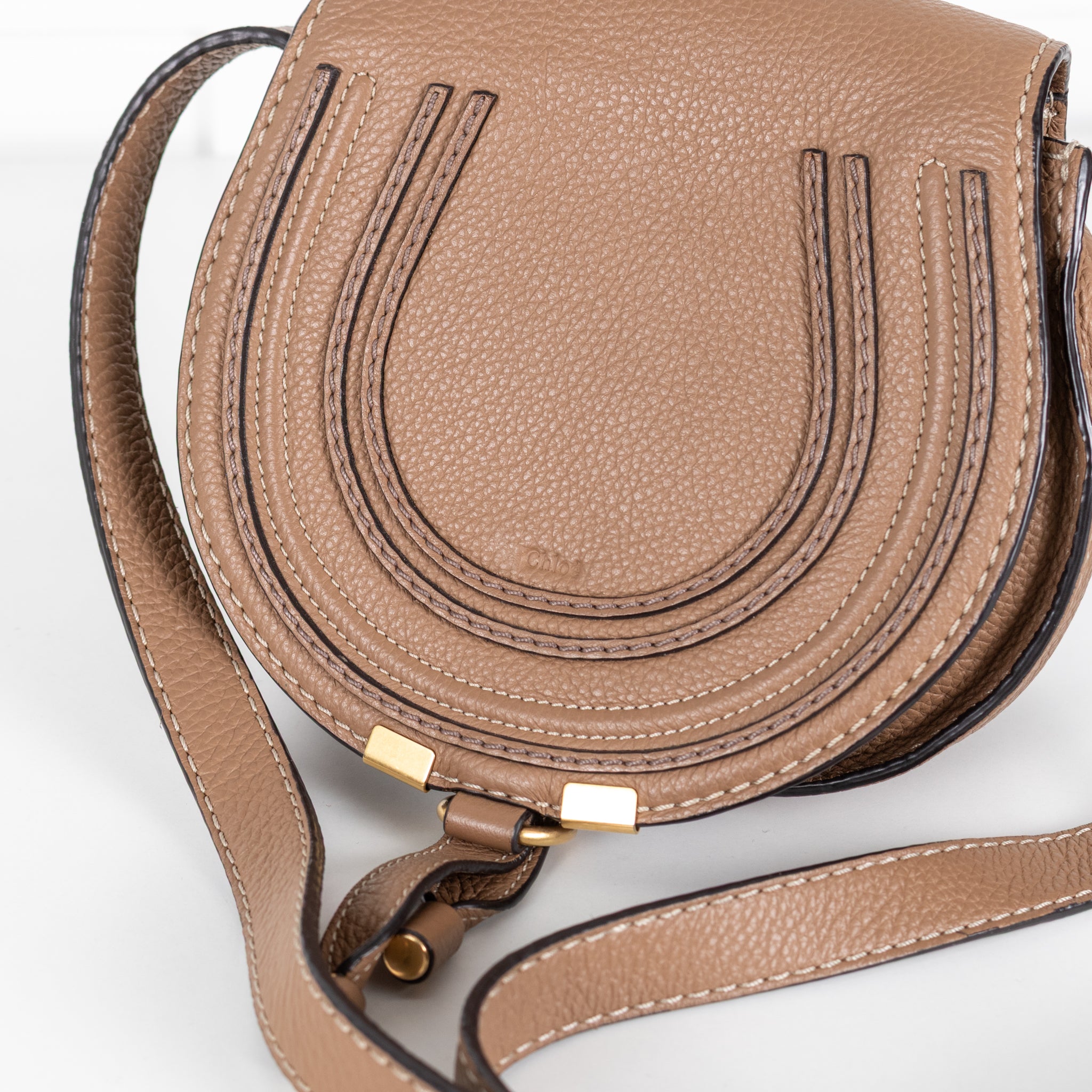 Chloe beige mini marcie logo embossed small saddle crossbody with black leather trims, matte gold-tone hardware, a front flap, and an adjustable crossbody.