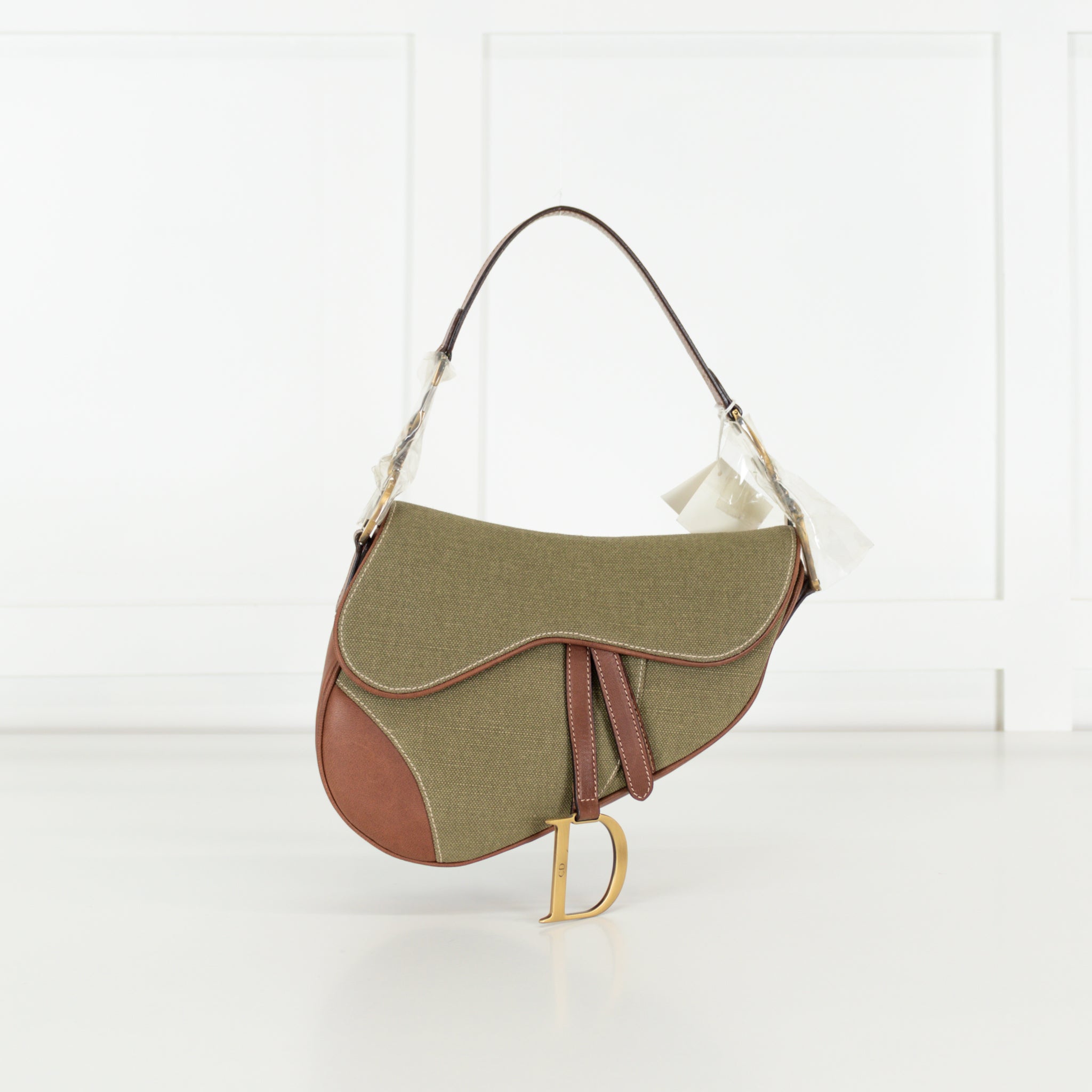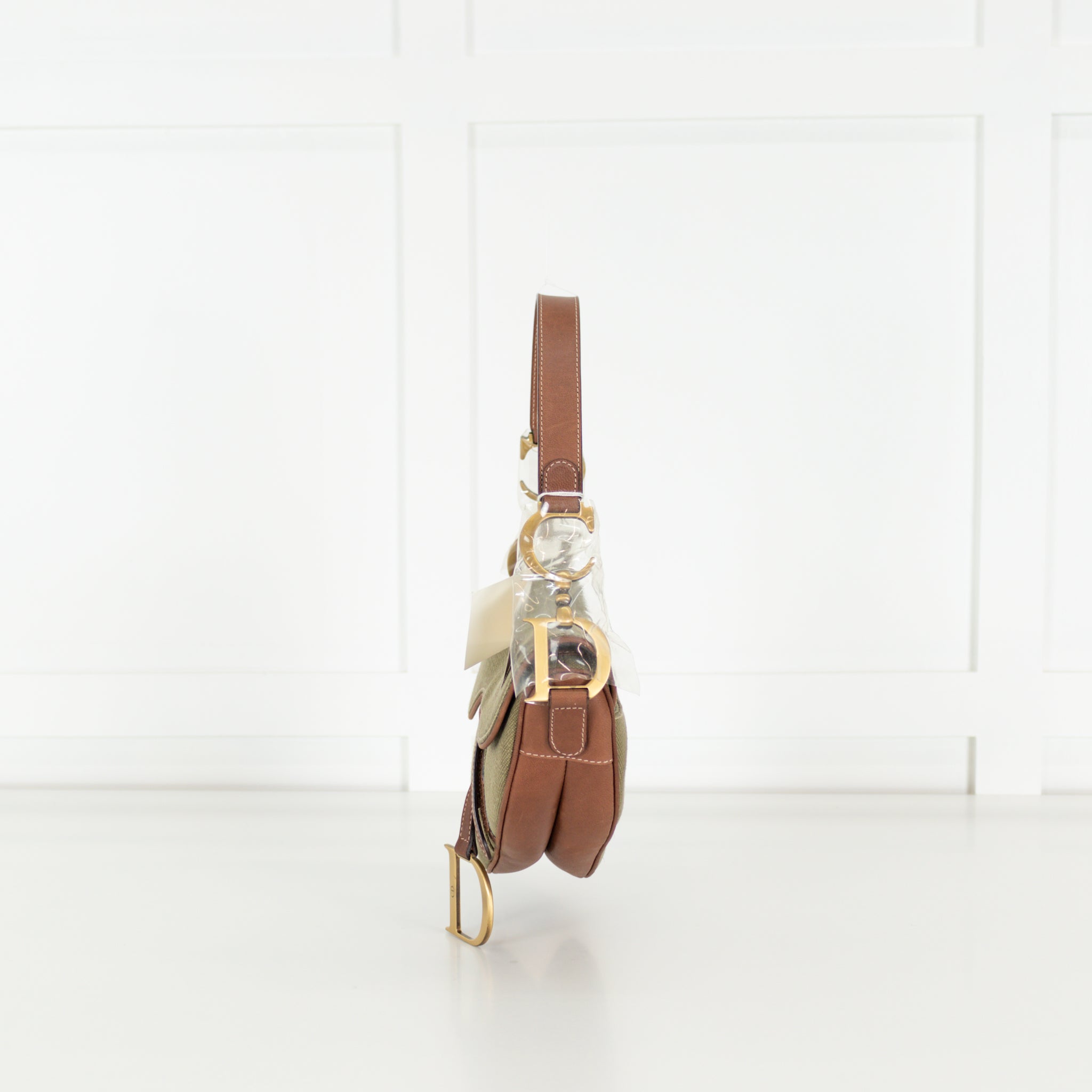 Christian Dior Dior (2003) khaki canvas saddle bag, featuring a curved saddle-inspired design, with stunning brown trims, a green exterior and a short brown handle, with the classic Christian Dior signature 'D' stirrup strap. The vecrow strap opens up to a stunning Christian Dior printed brown interior with a single zipped department and a large main compartment. This bag is accompanied by the original dust bag as well as tags.