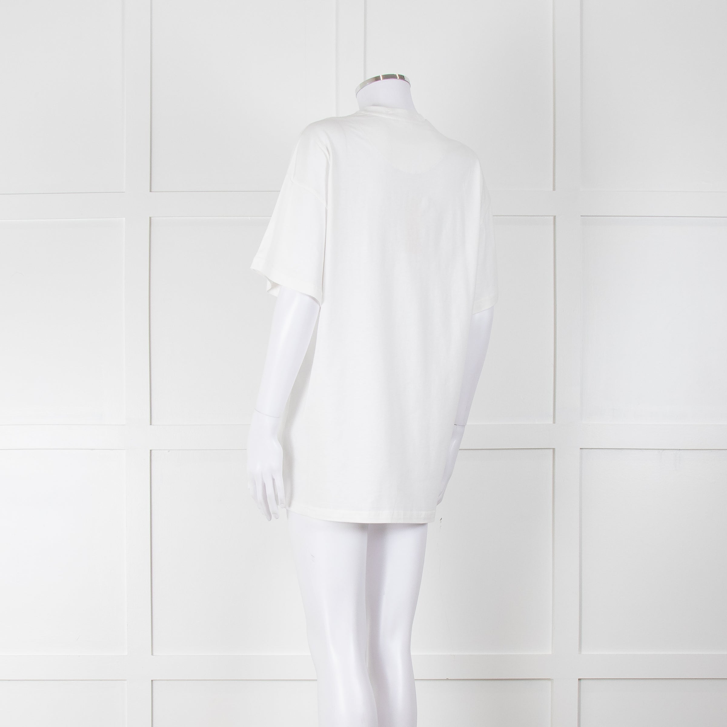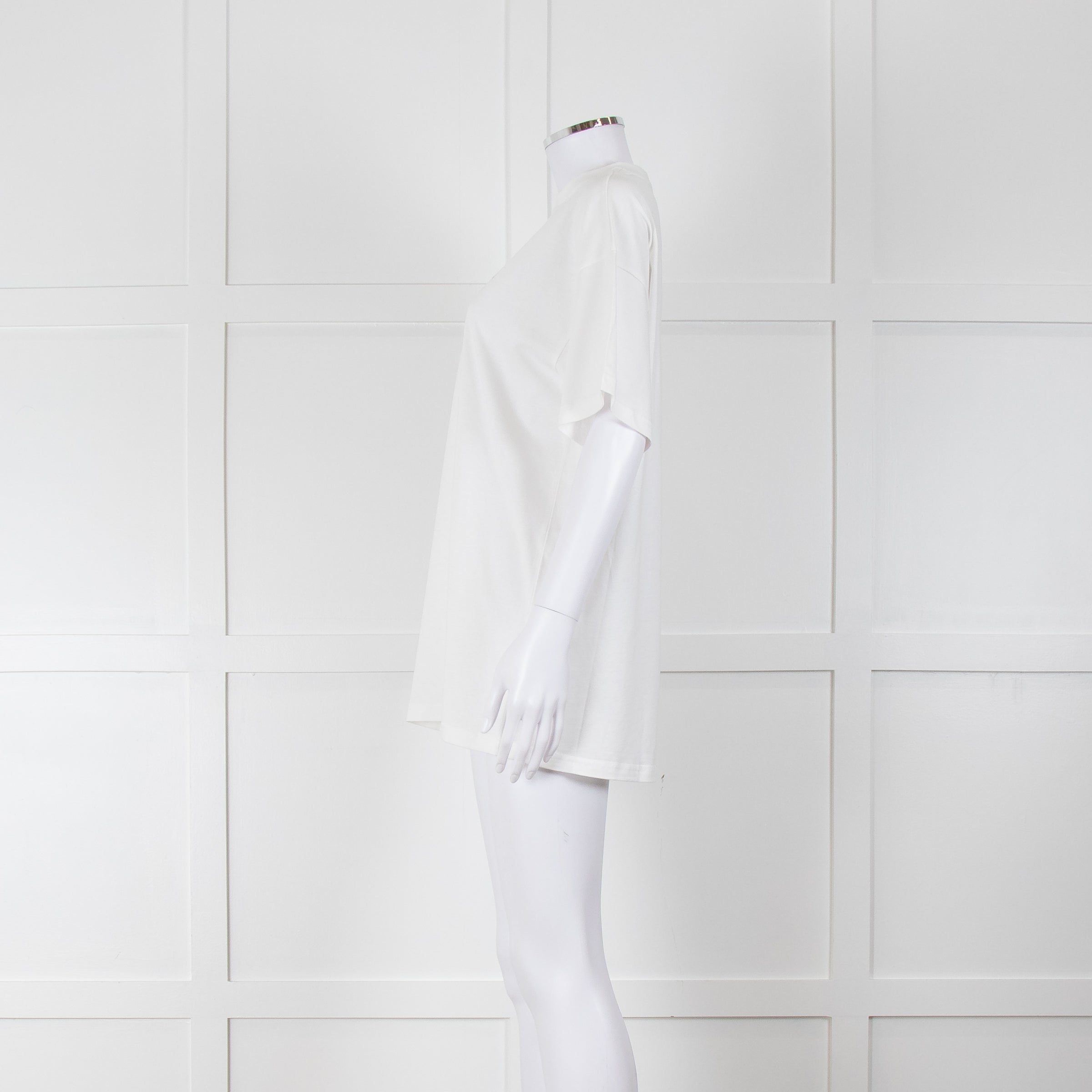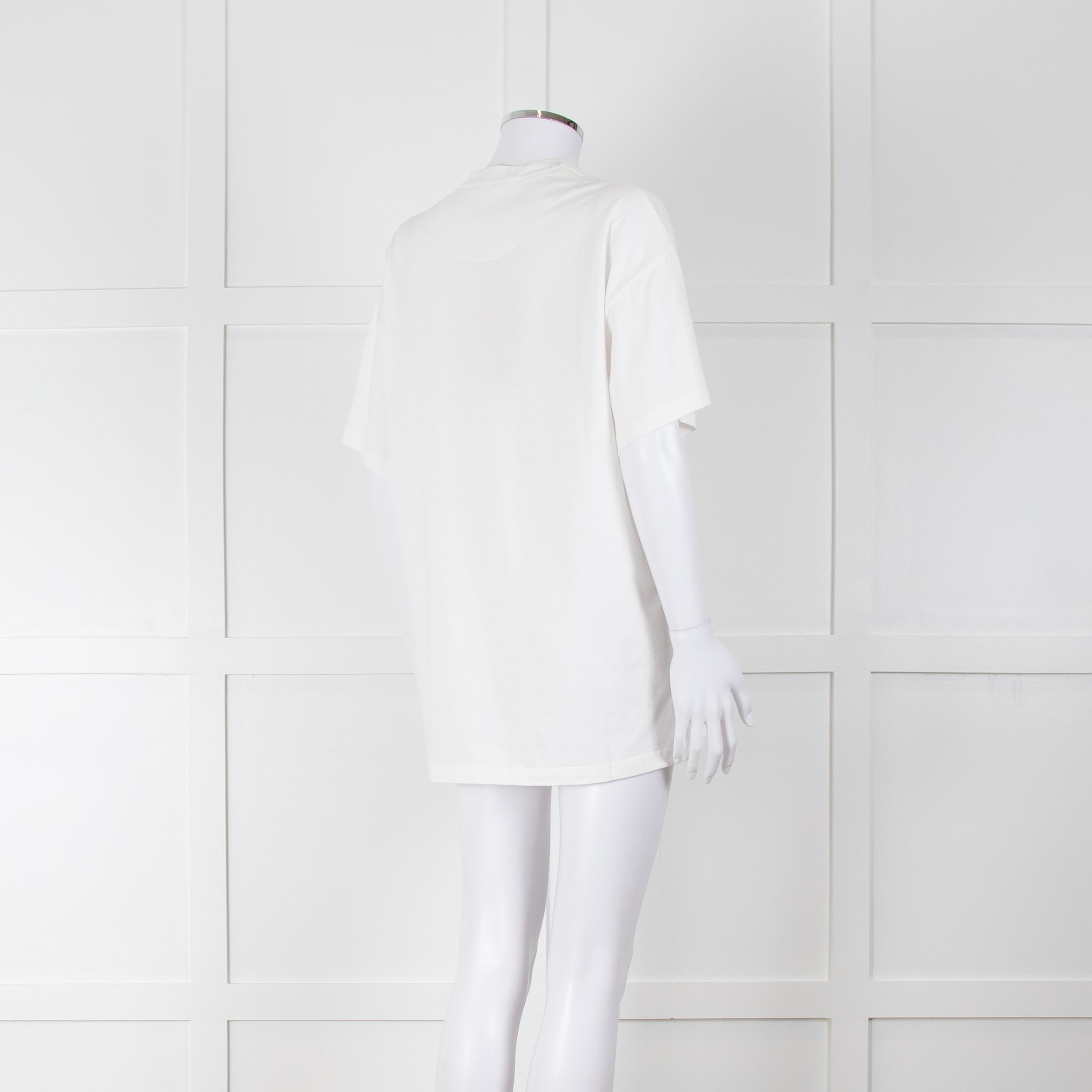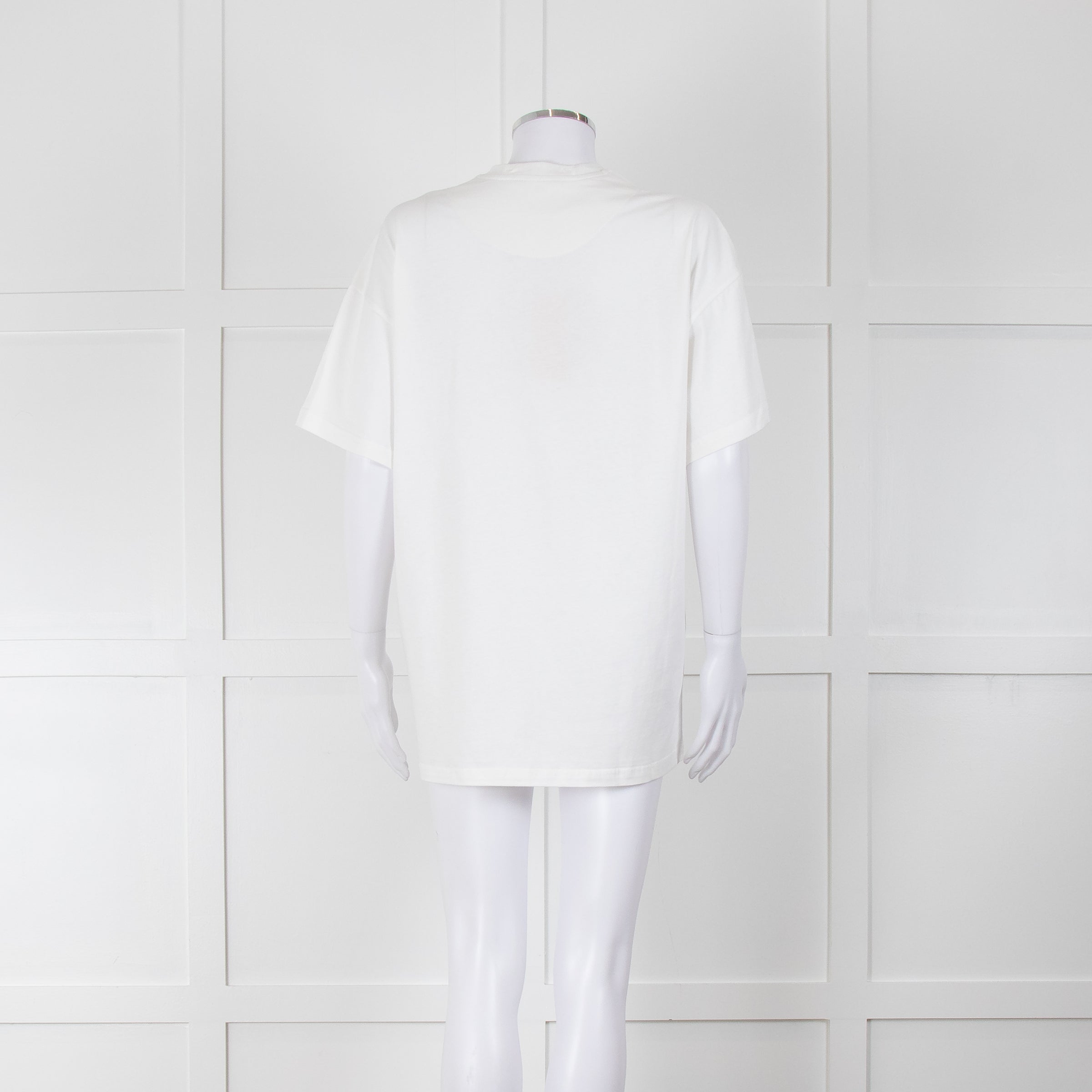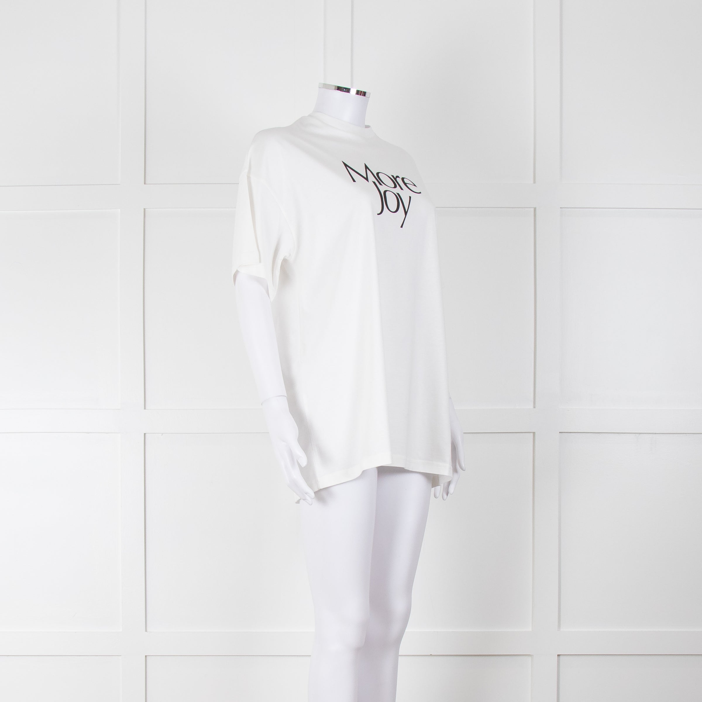 Christopher Kane white cotton T-shirt with a rounded neckline, short sleeves, and large black 'More Joy' graphic print. New with tags.