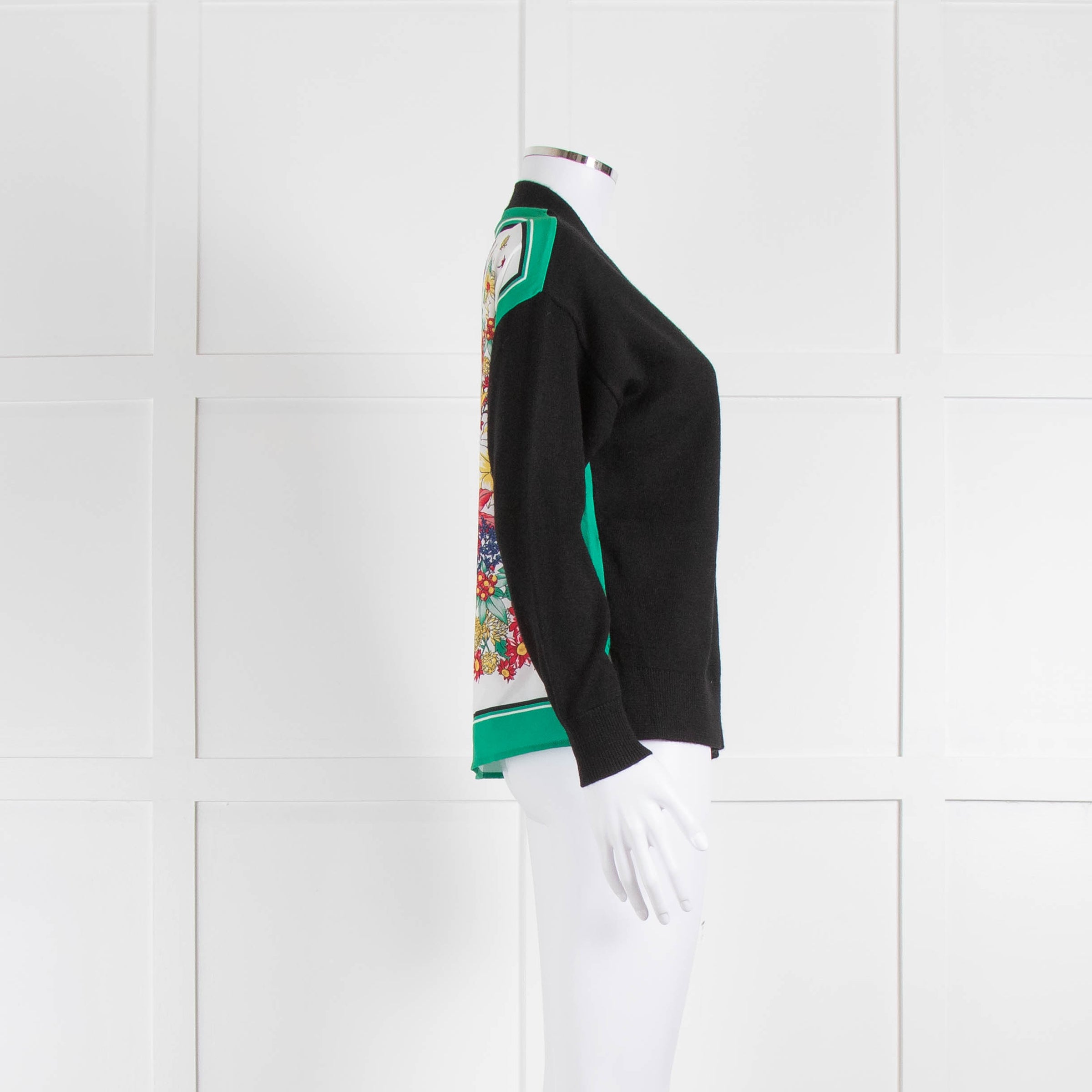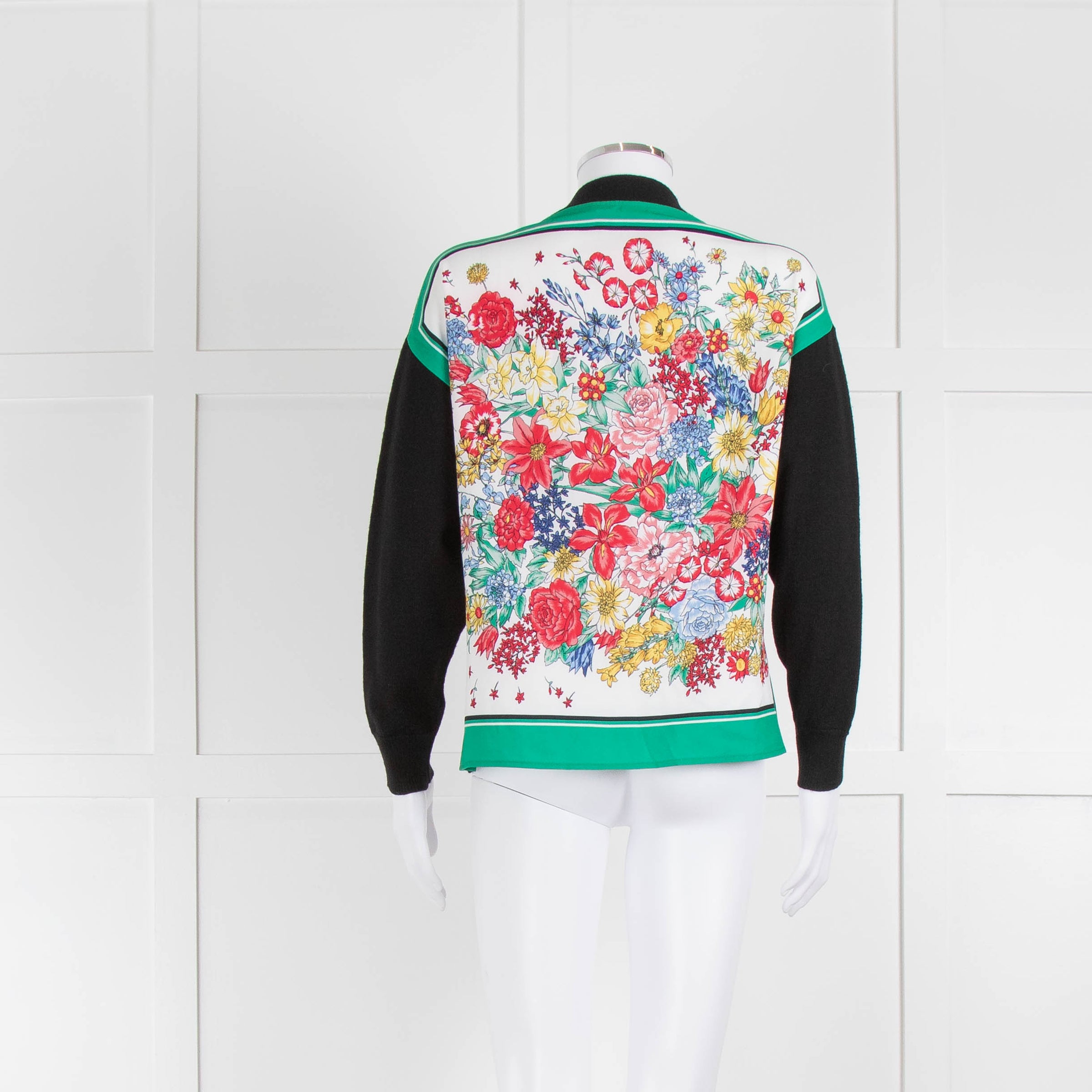 Claudie Pierlot cardigan with a black knitted button up front, and crepe 'silk scarf' style floral print back.
