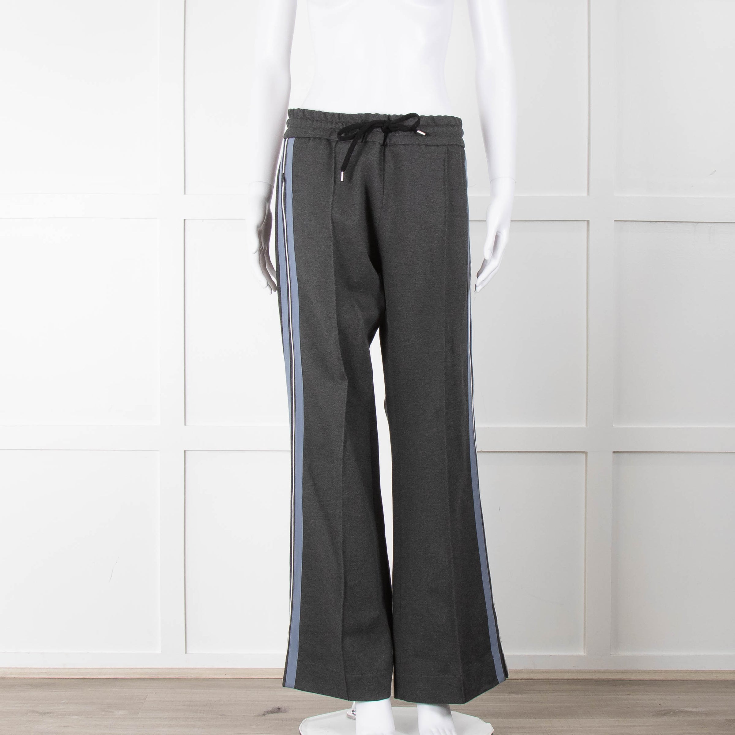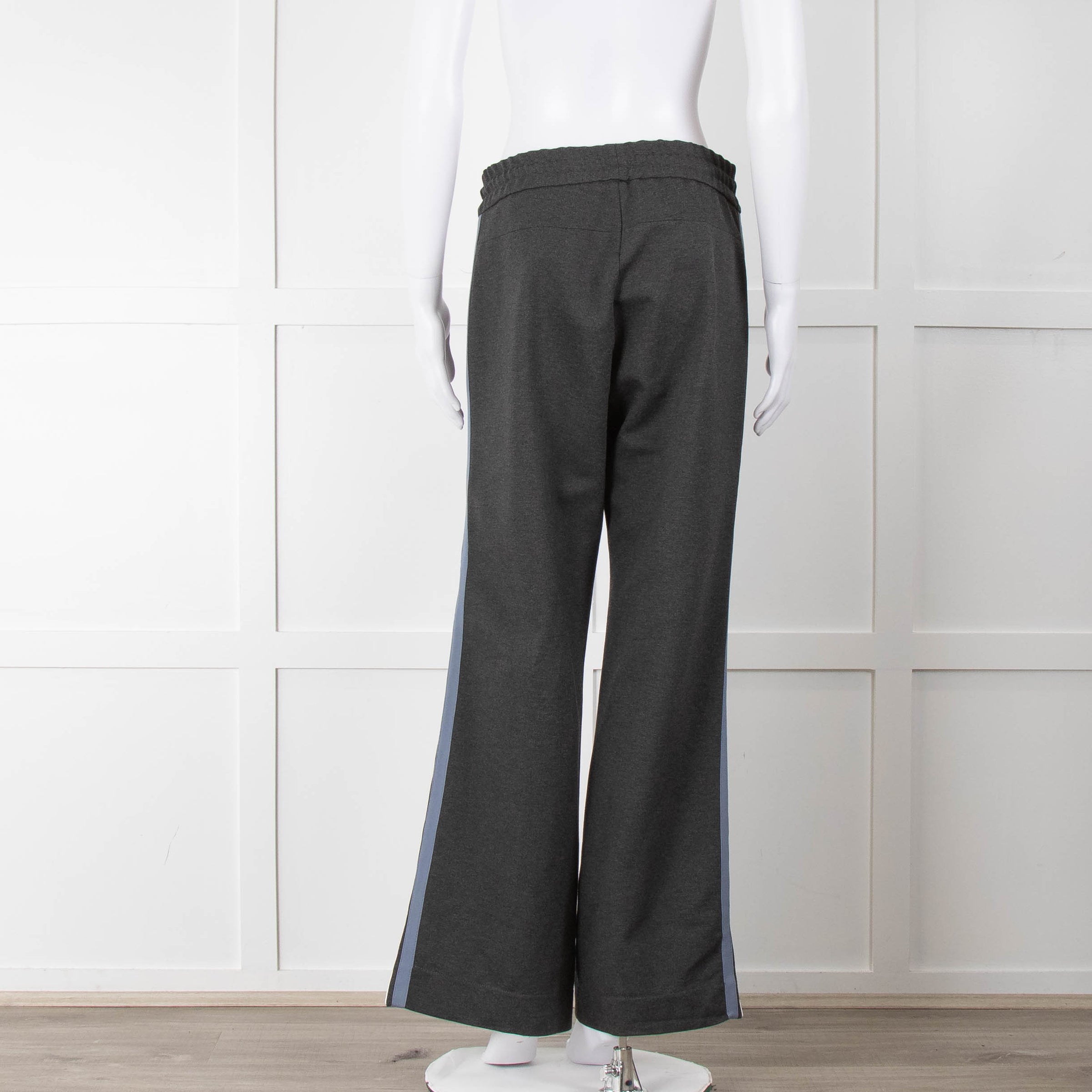 Clementine B grey stretch heavy weight jersey trousers with wide cut legs, a drawstring waistband, blue striped detailing down the sides, and invisible zipped side pockets.