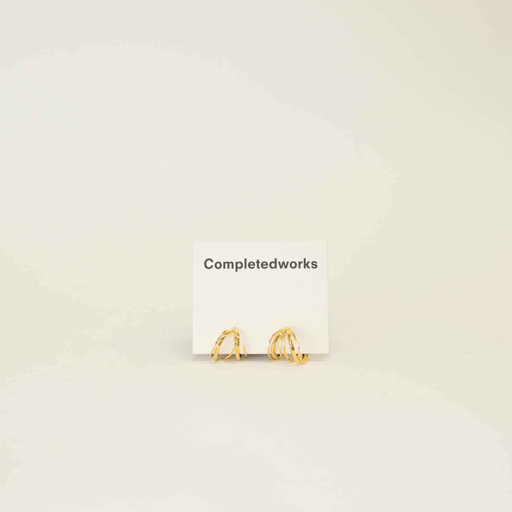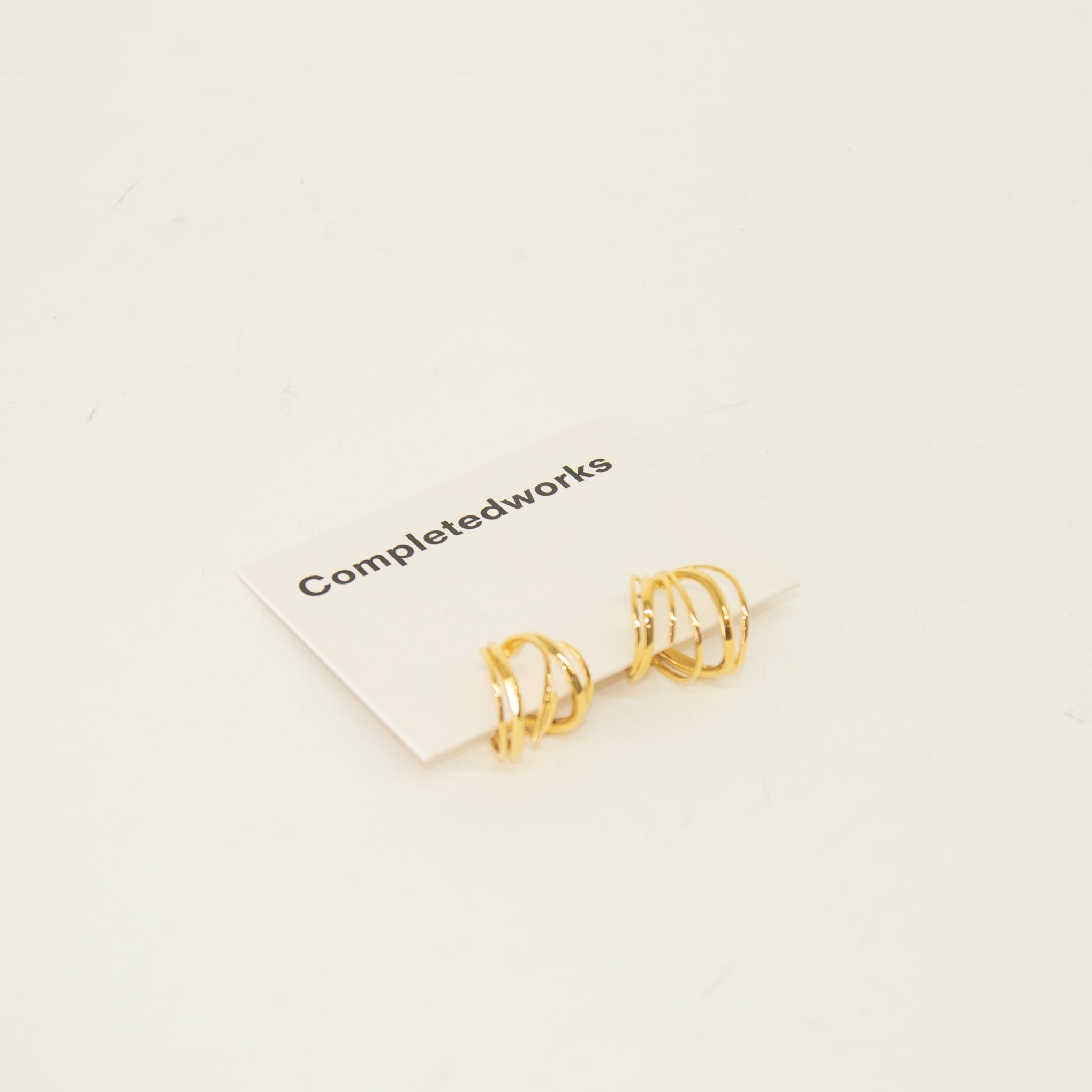 Completed Works gold Stratum earrings crafted in 18ct gold plated brass with sterling silver posts. Finished with butterfly earring backs, these are suitable for pierced ears. Creating the illusion of Multiple earrings, accompanied by the original pouch and card. RRP £210.