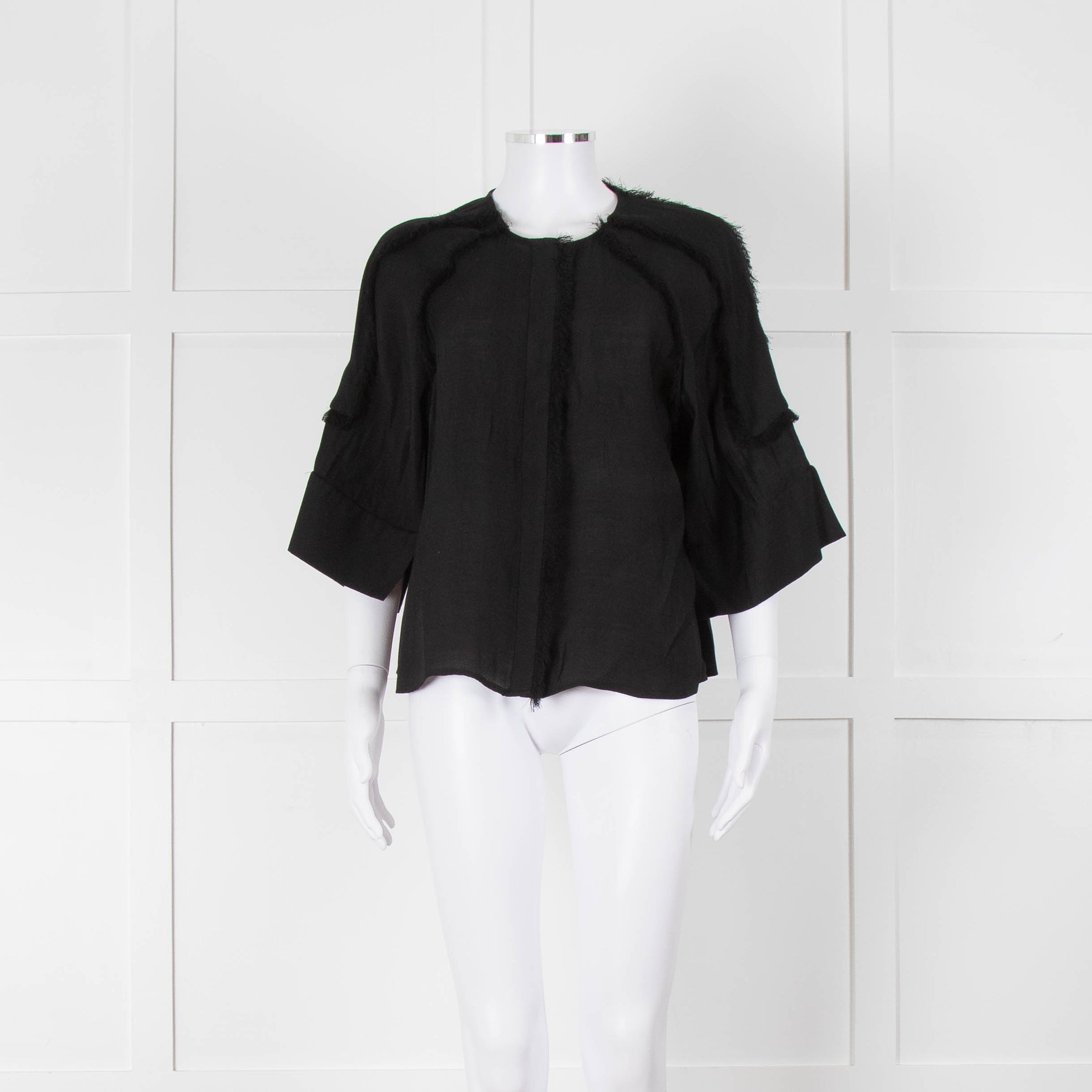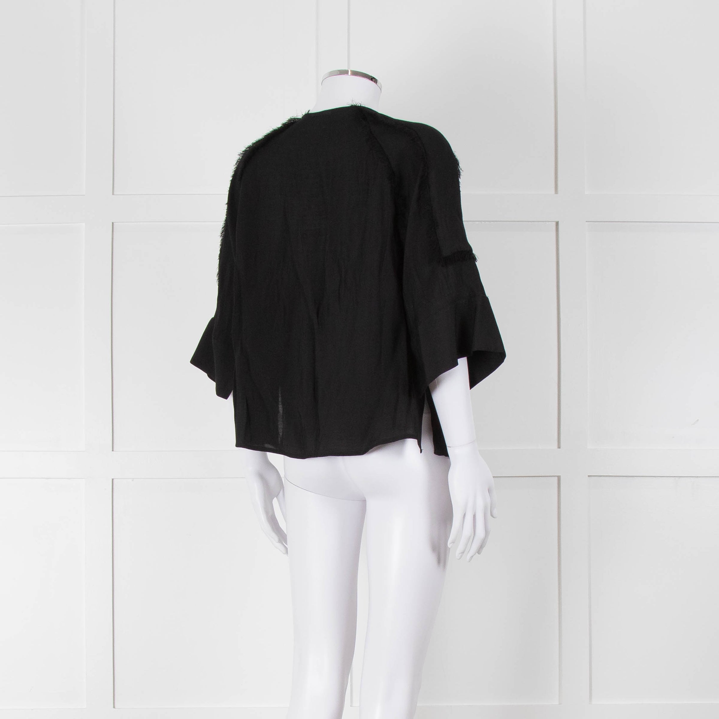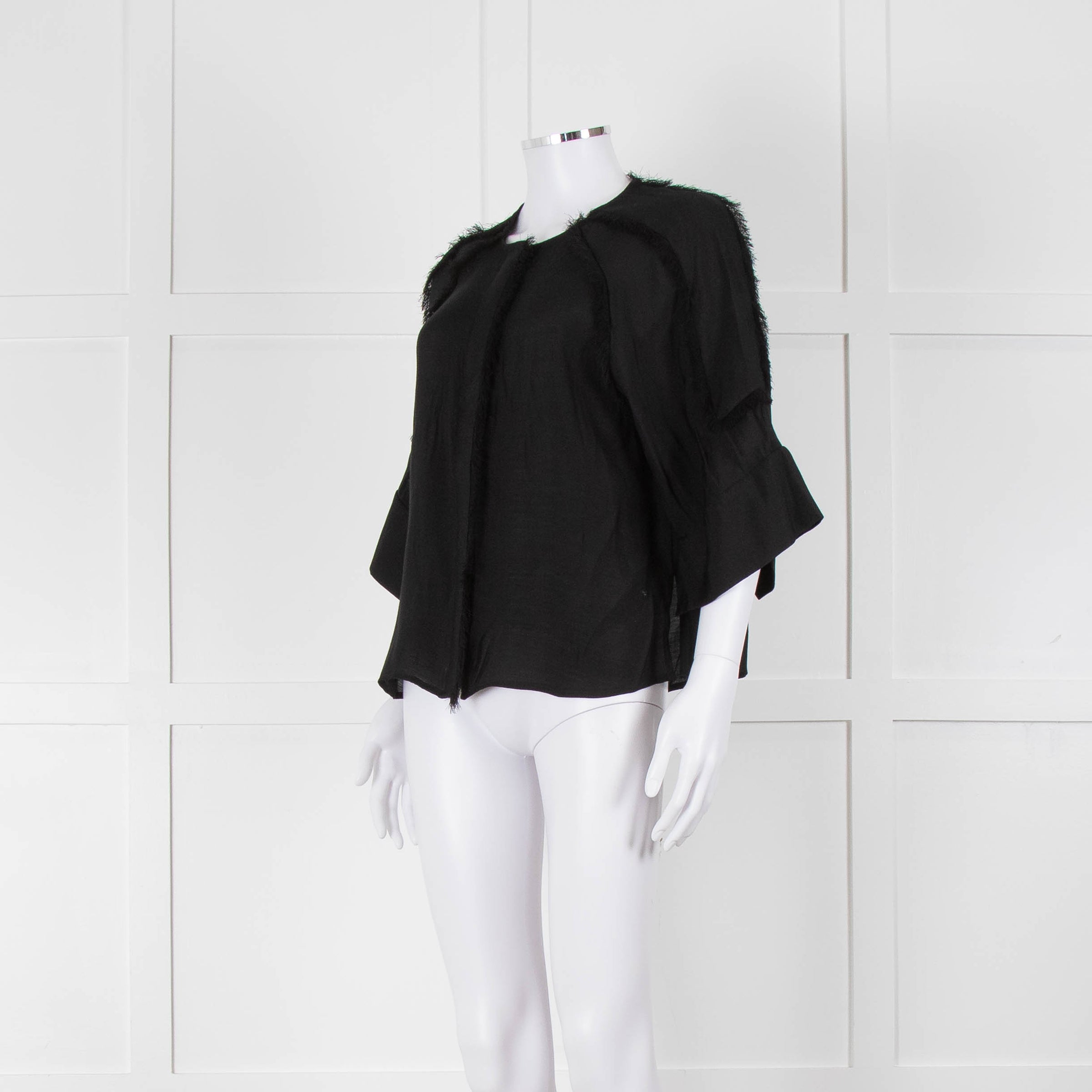 Day Birger et Mikkelson black raw edge short-sleeve blouse with concealed front button closure and 3/4 length wide sleeves.