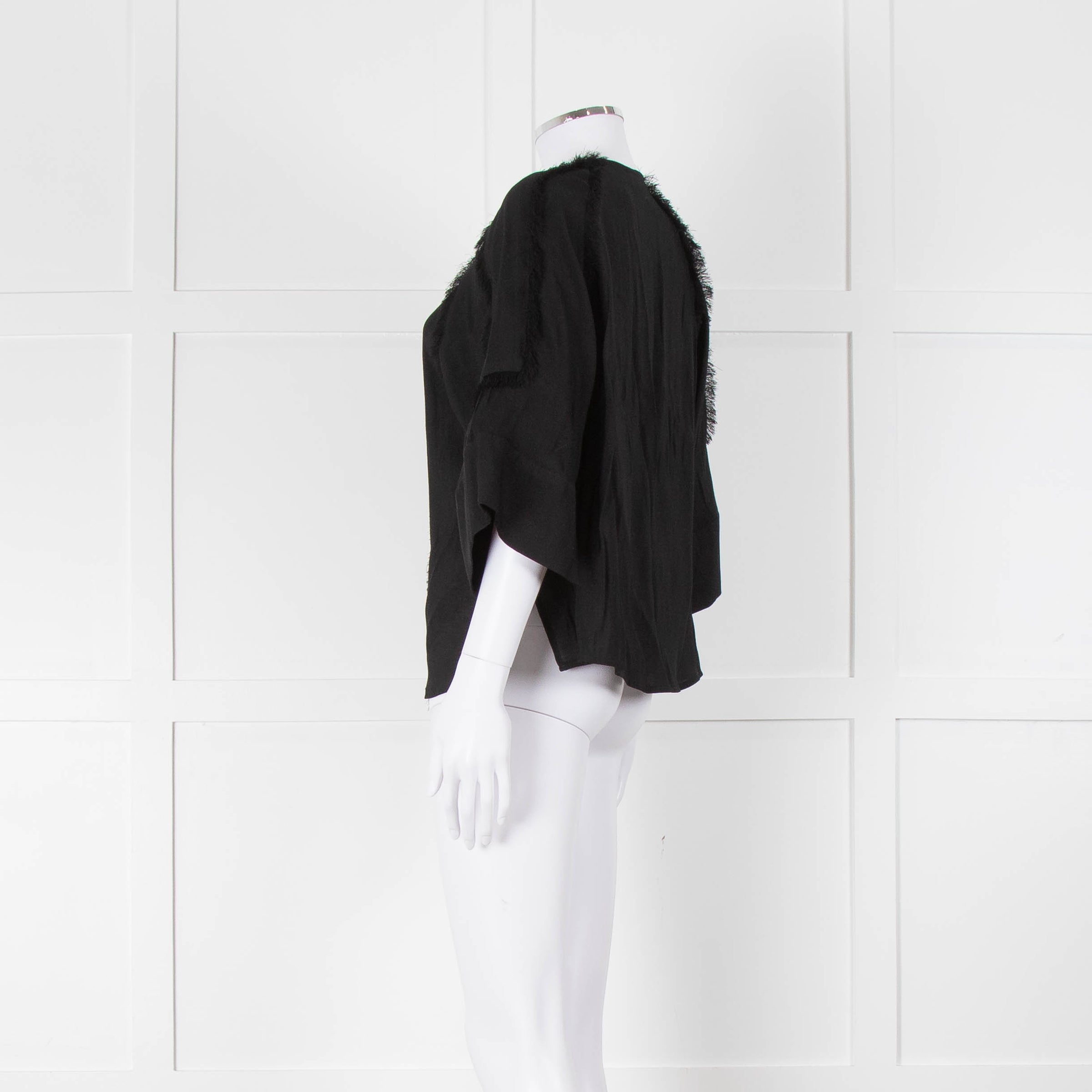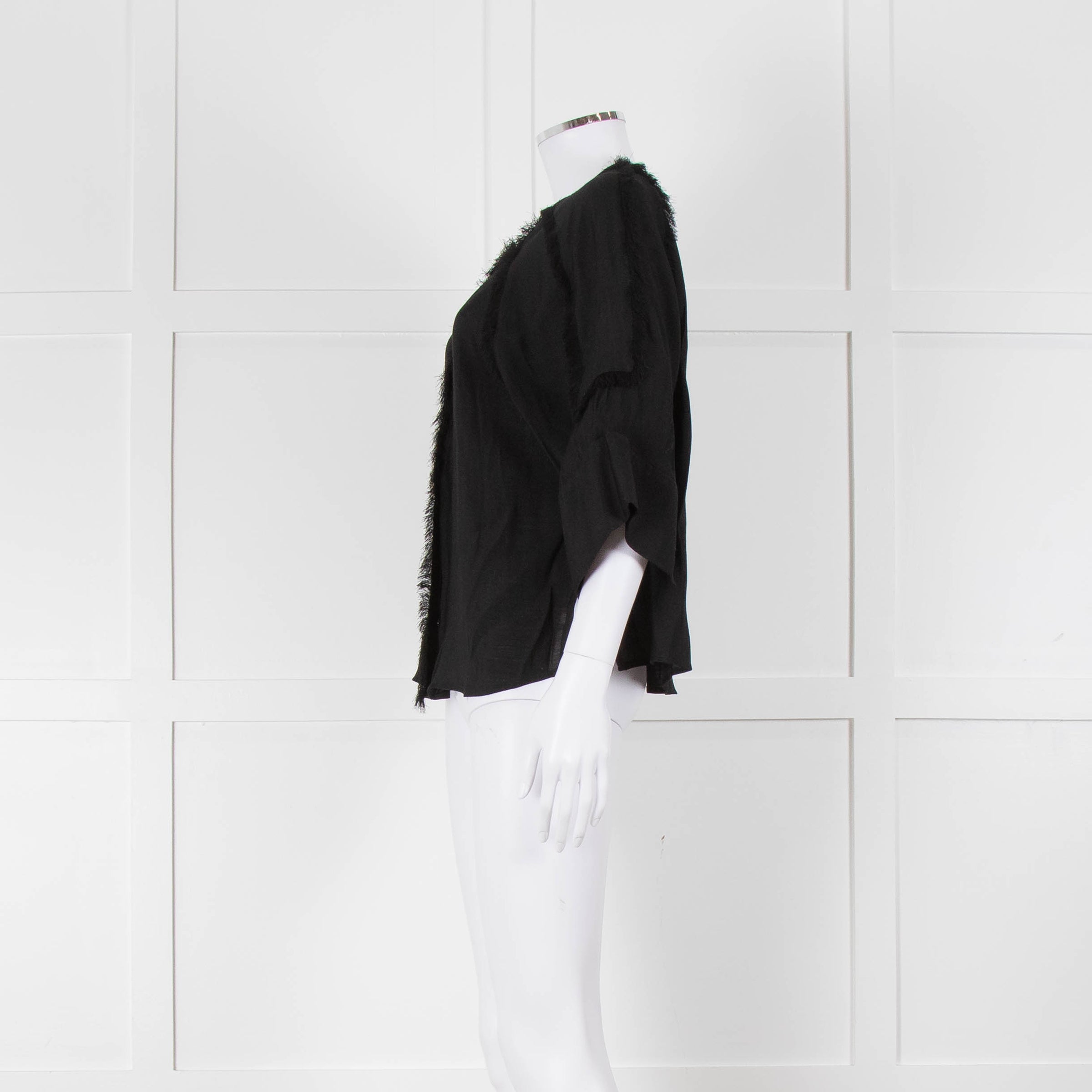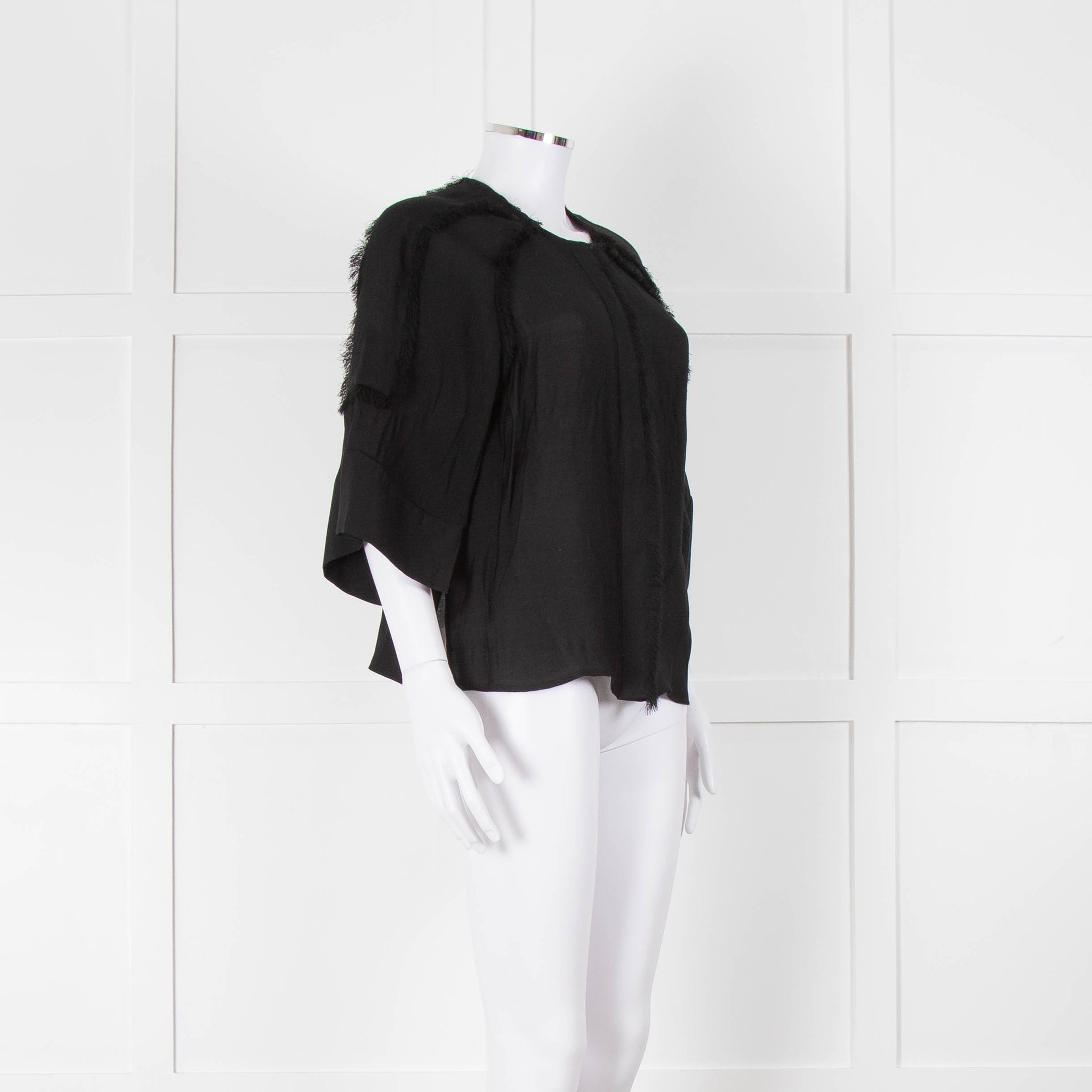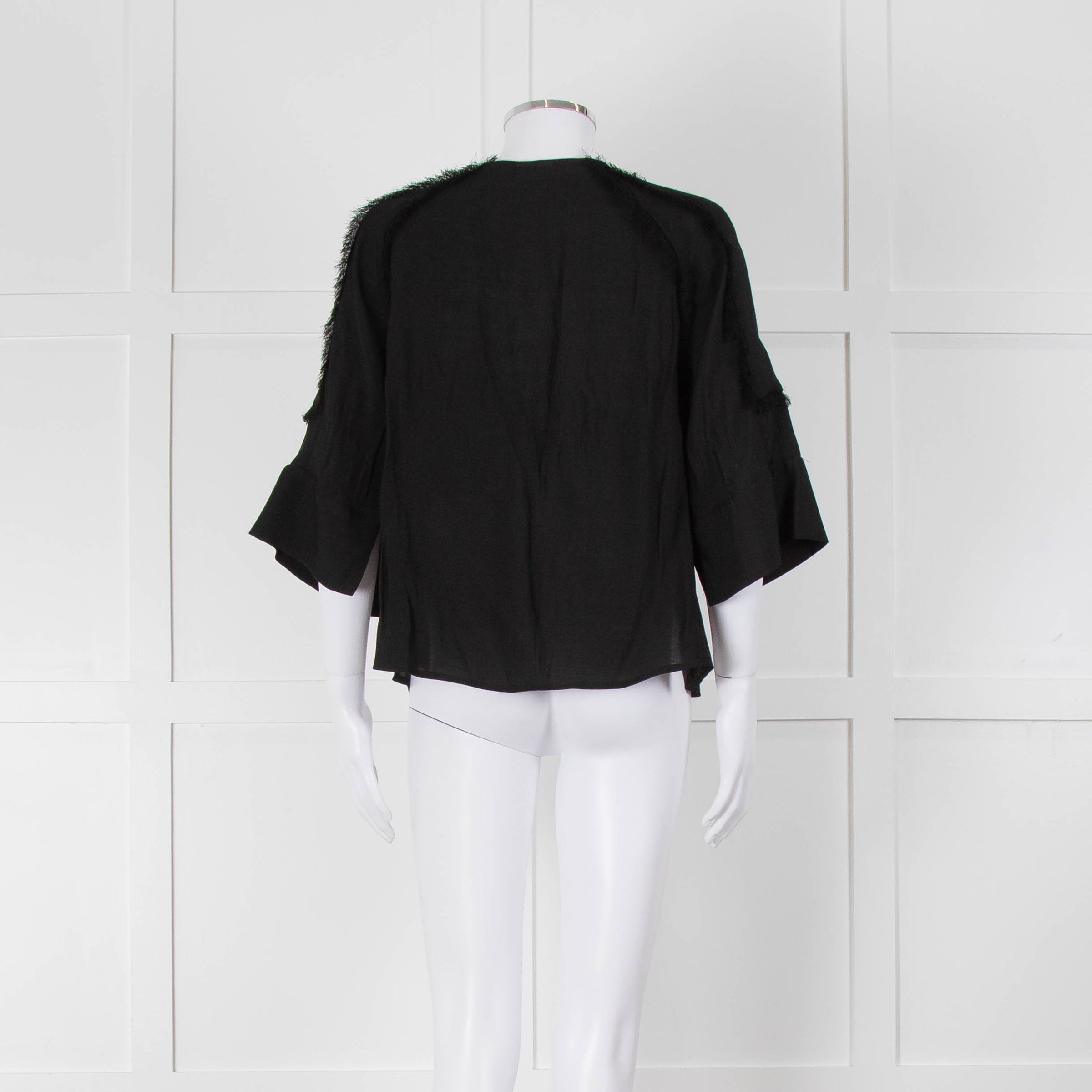 Day Birger et Mikkelson black raw edge short-sleeve blouse with concealed front button closure and 3/4 length wide sleeves.