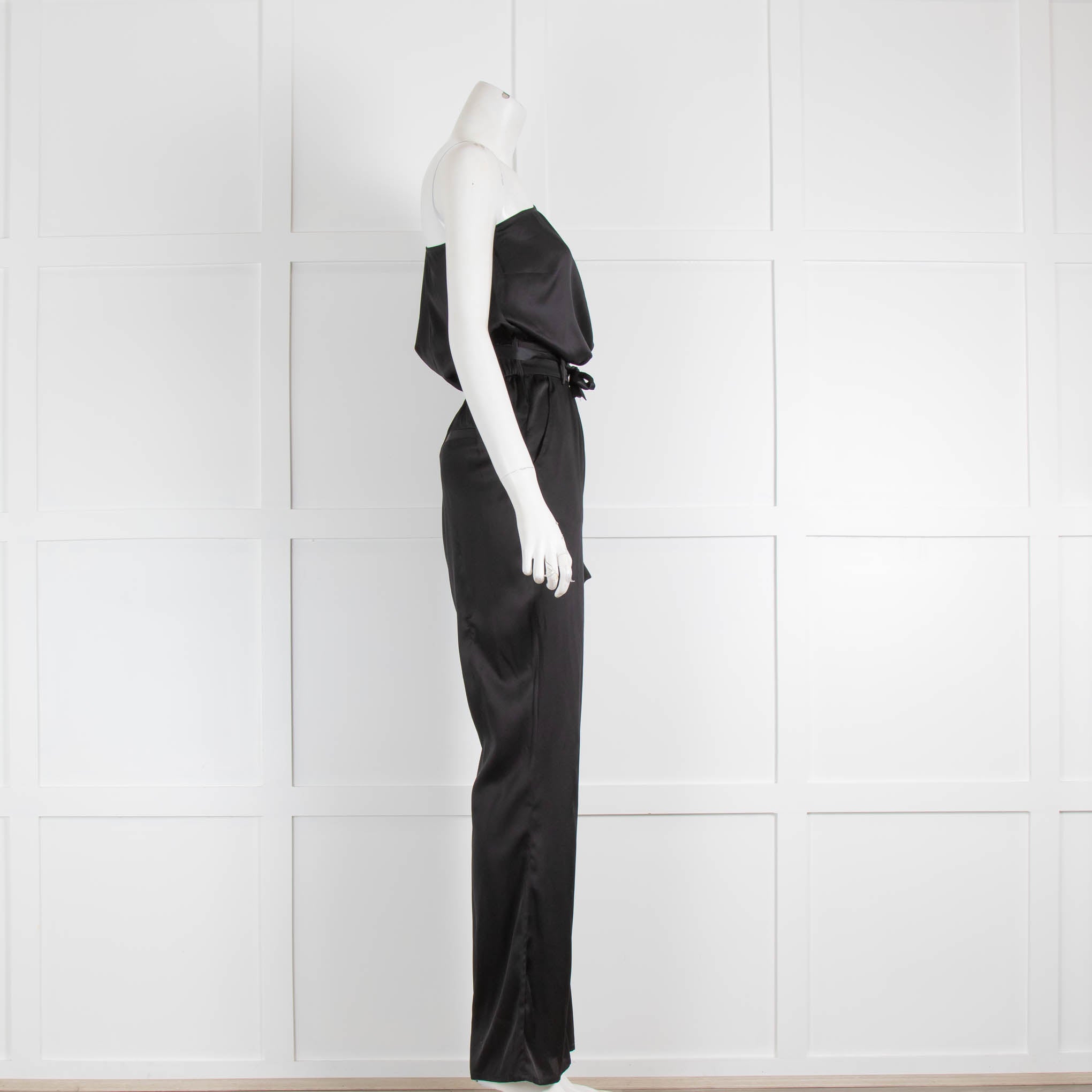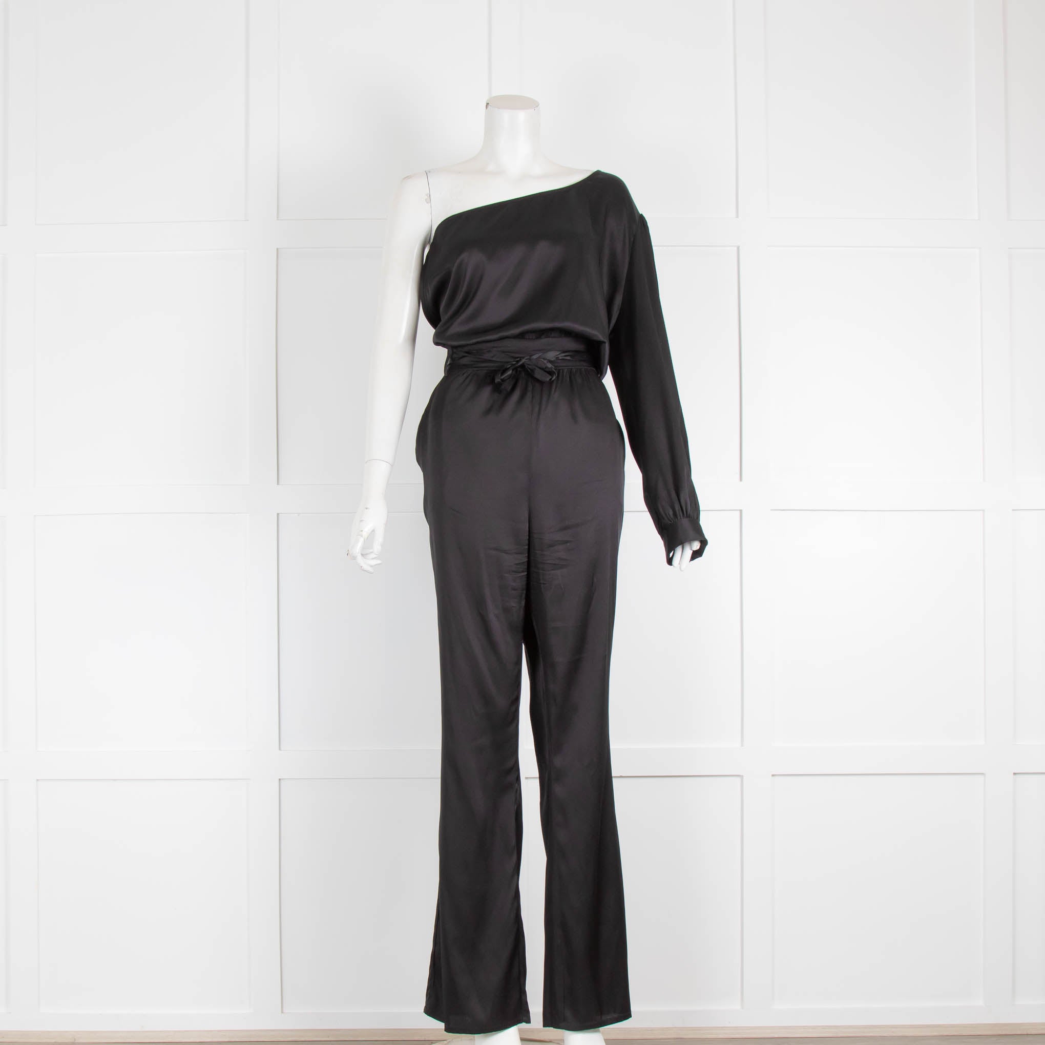 Dea Kudibal black silk one-shoulder jumpsuit. Featuring one long sleeve with a buttoned cuff, an elasticated cinched waist with hand tied belt, two front pockets, and bootcut legs. Has a concealed side zip fastening.