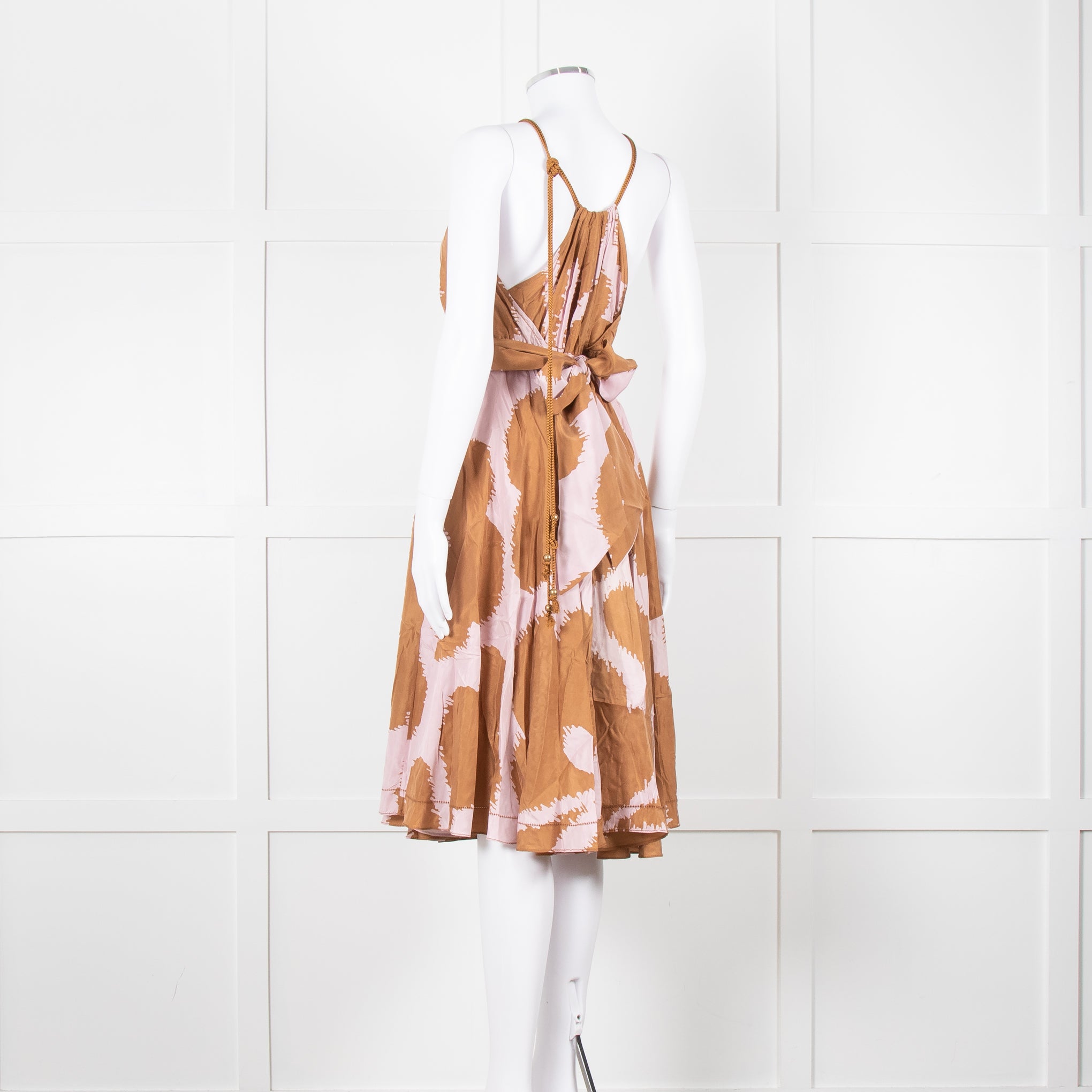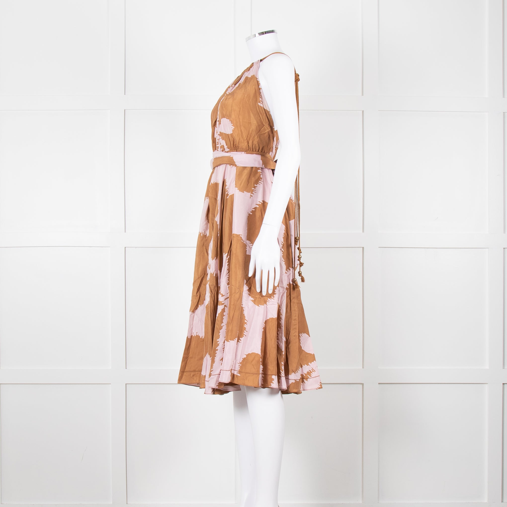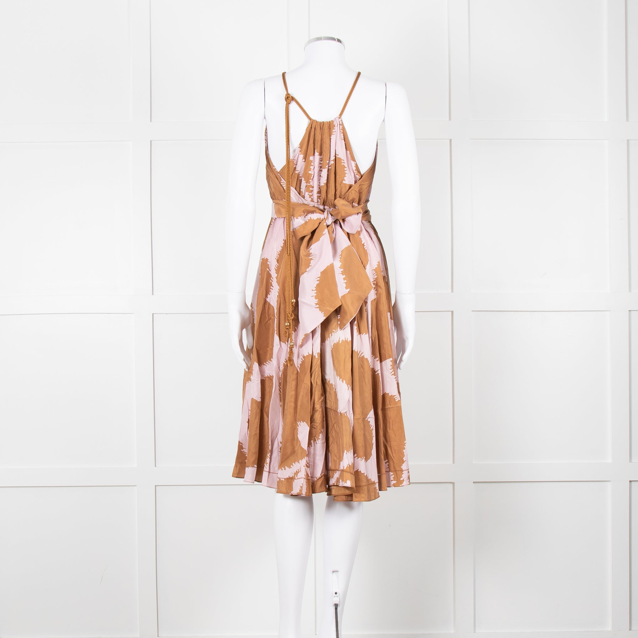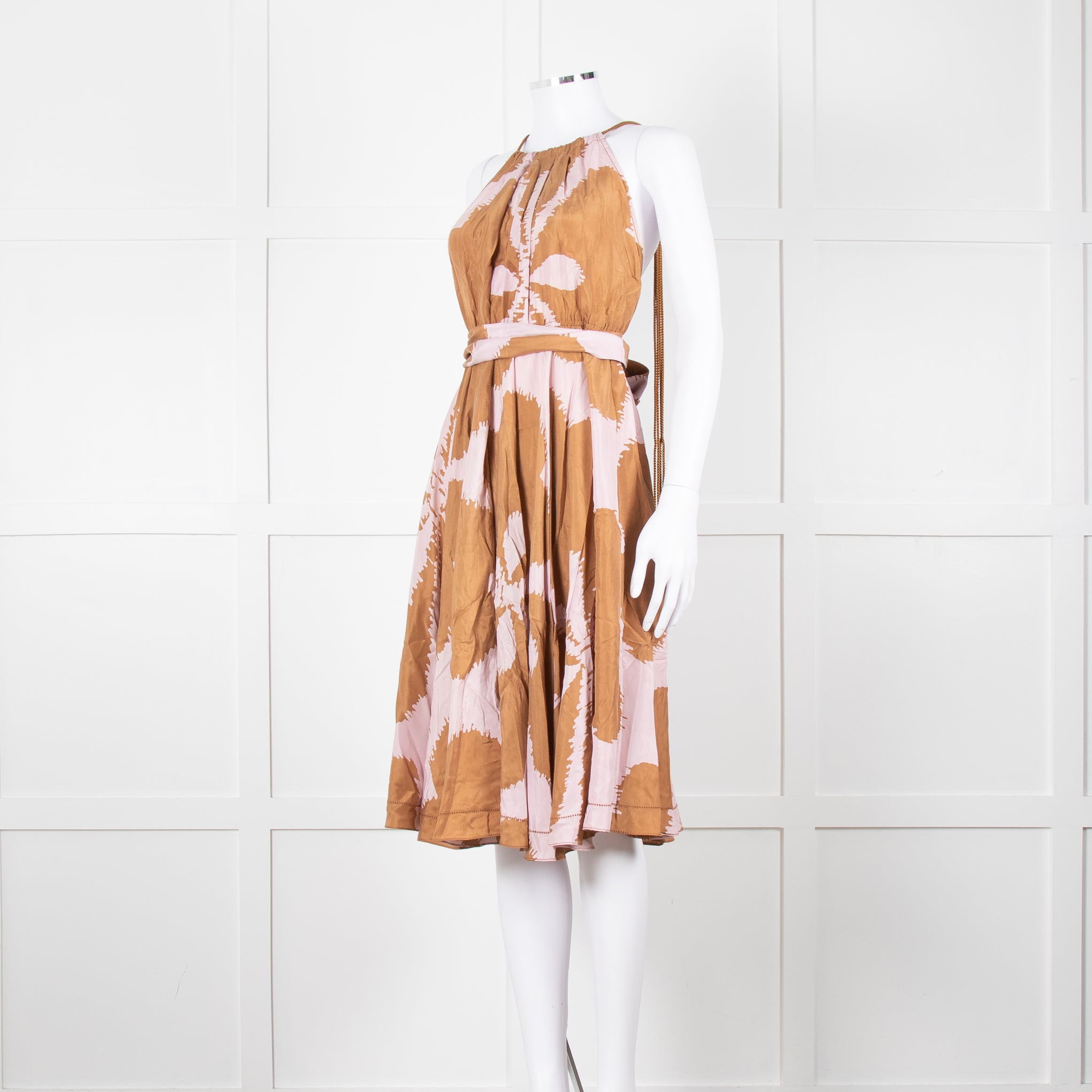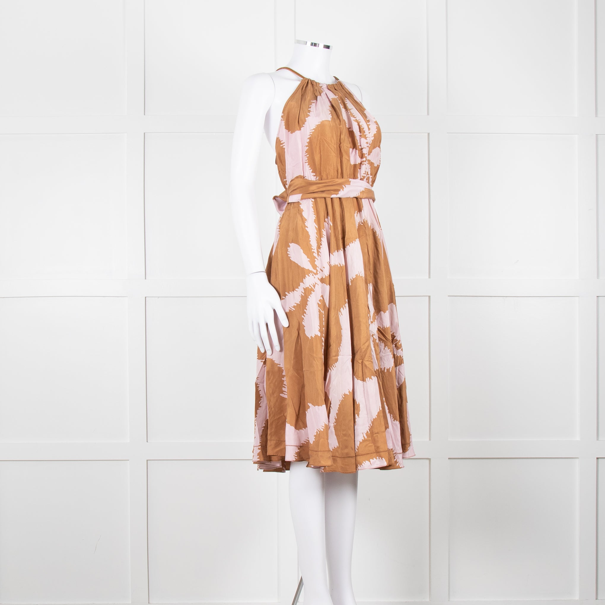 Diane Von Furstenberg brown and lilac jumbo floral print halterneck tie midi dress with a tonal waist belt and softly pleated skirt.
