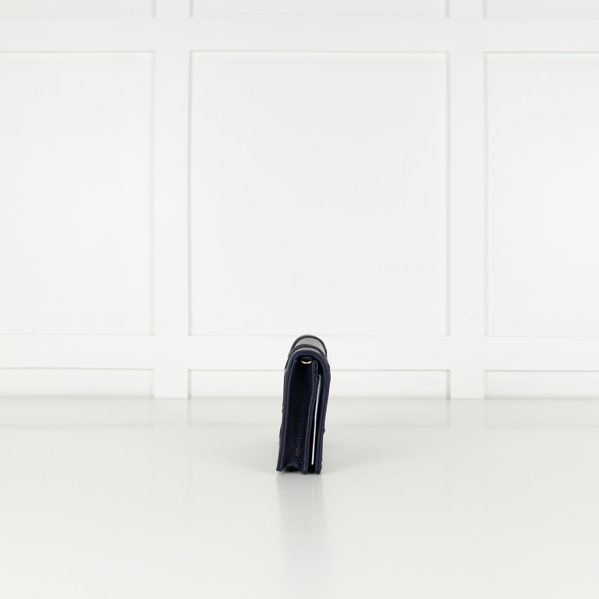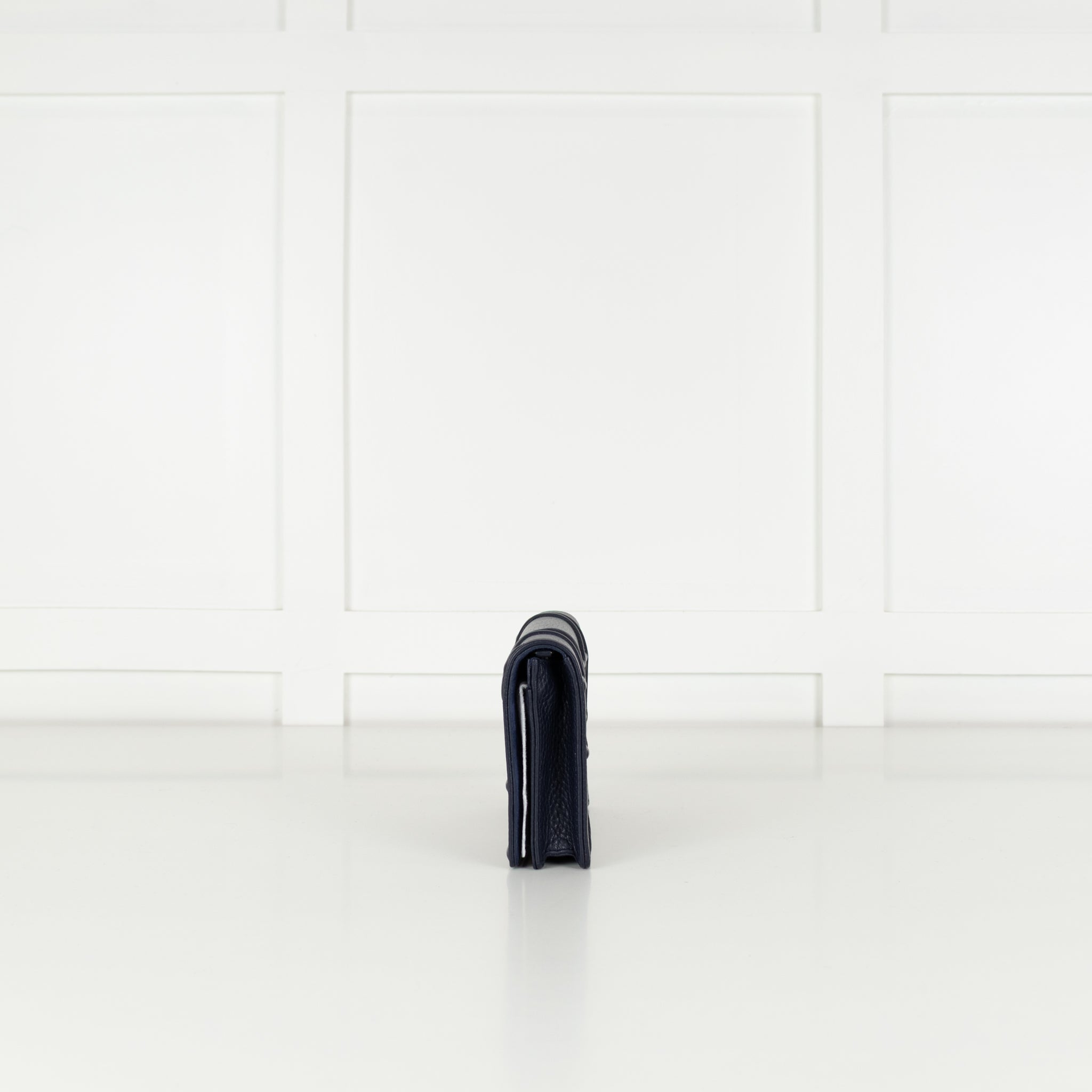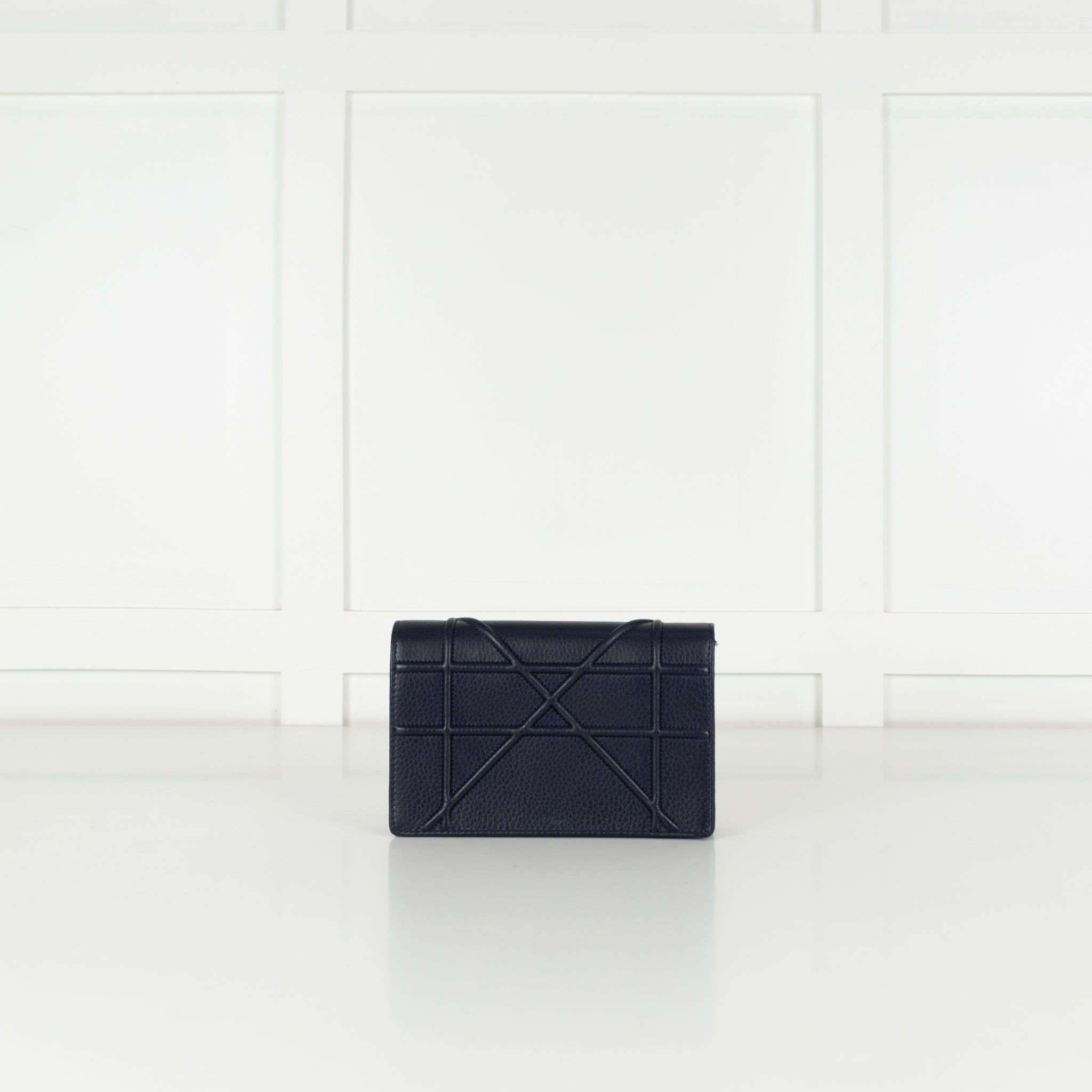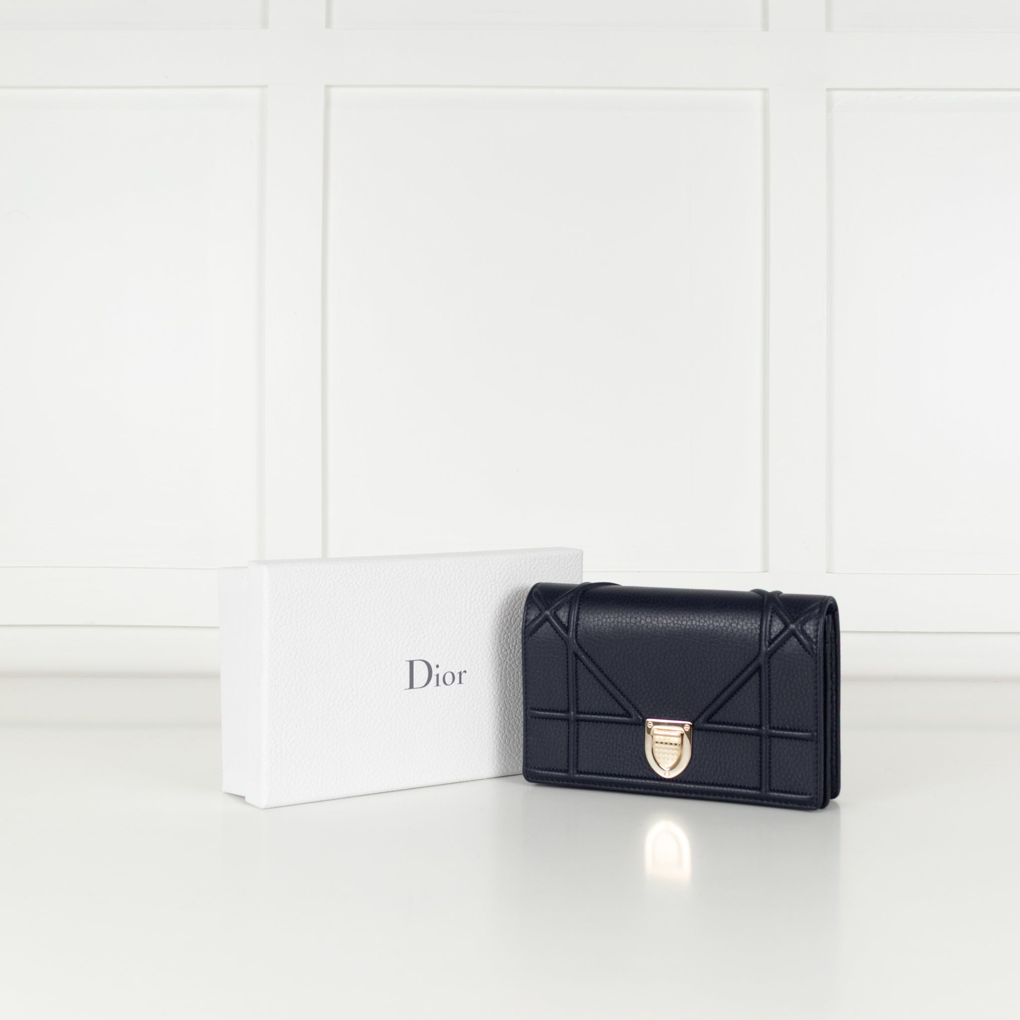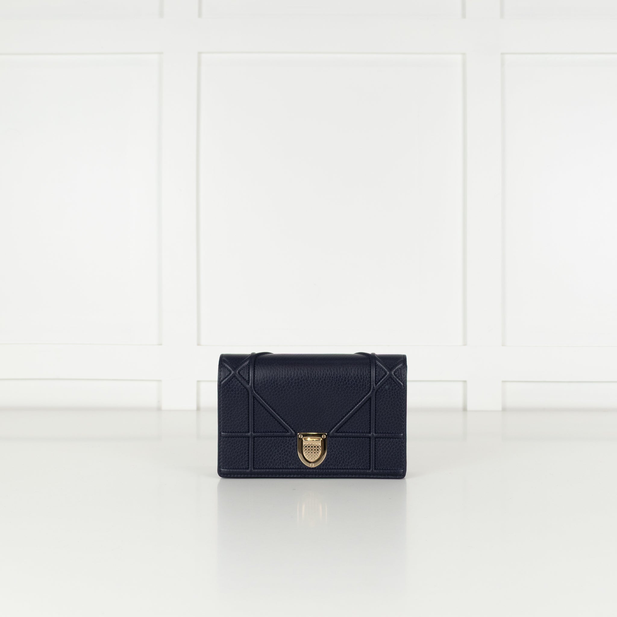 Dior navy Diorama wallet on chain crafted in iconic Cannage-quilted navy leather, this WOC features elegant light gold-tone hardware and a versatile crossbody chain strap. Internally, it's lined with a tonal suede and has three compartments.