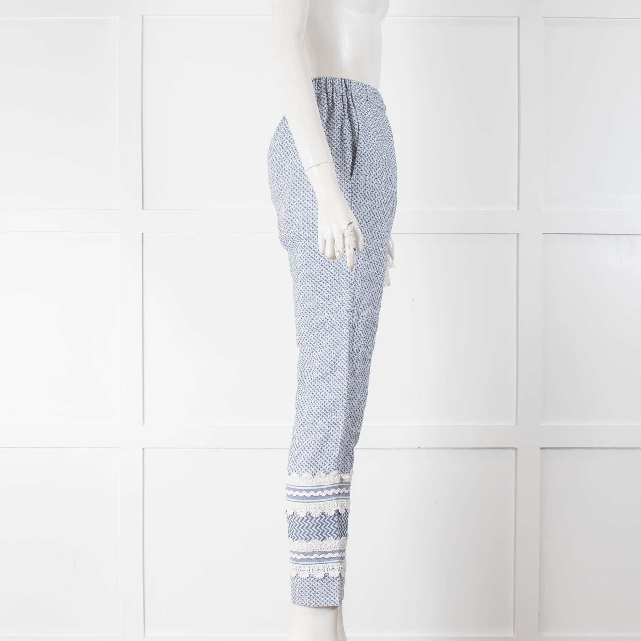 Dodo Bar Or blue and white cotton slim-leg trousers with lace around the lower part of the leg, an elasticated waistband, and side slip pockets. The matching jacket is available separately.