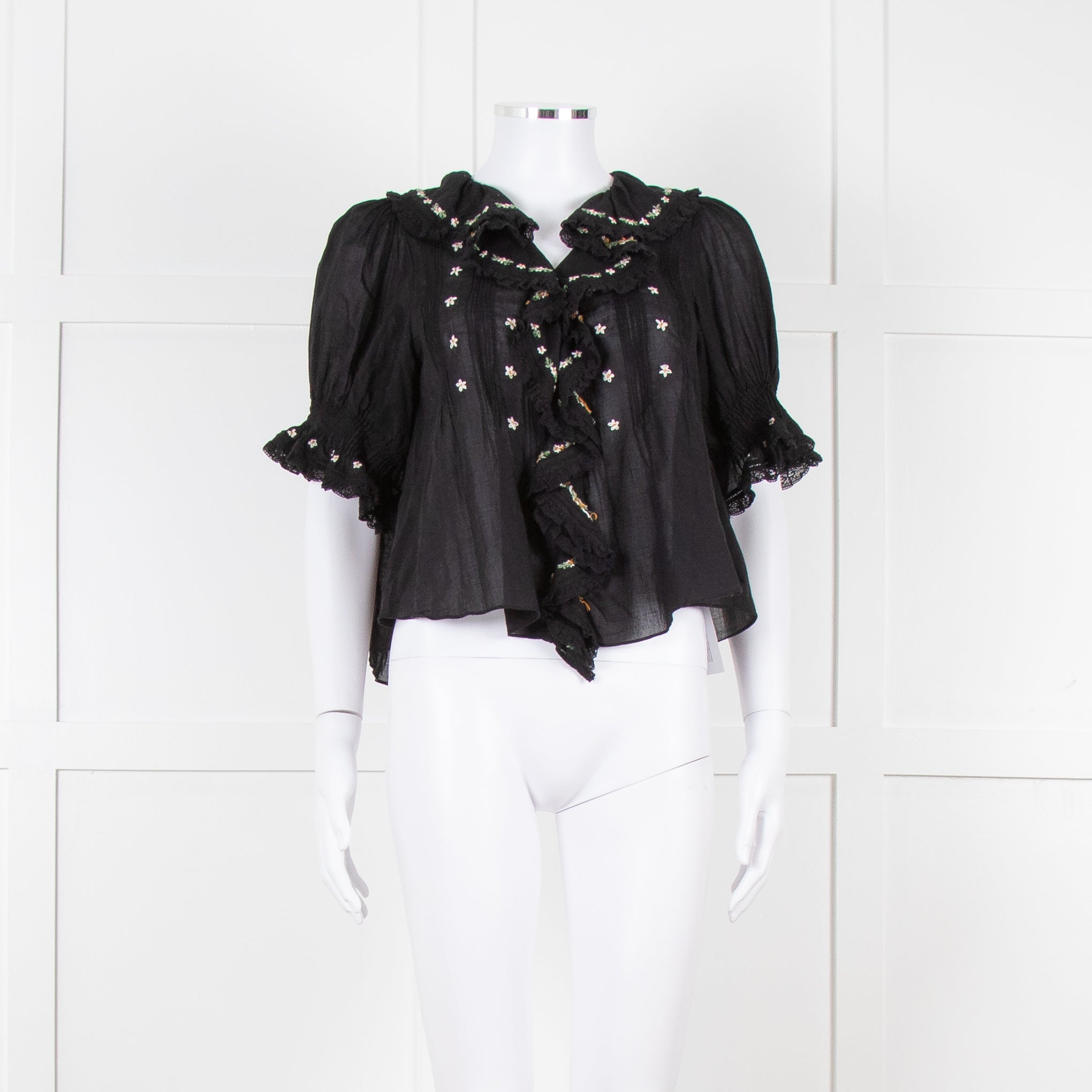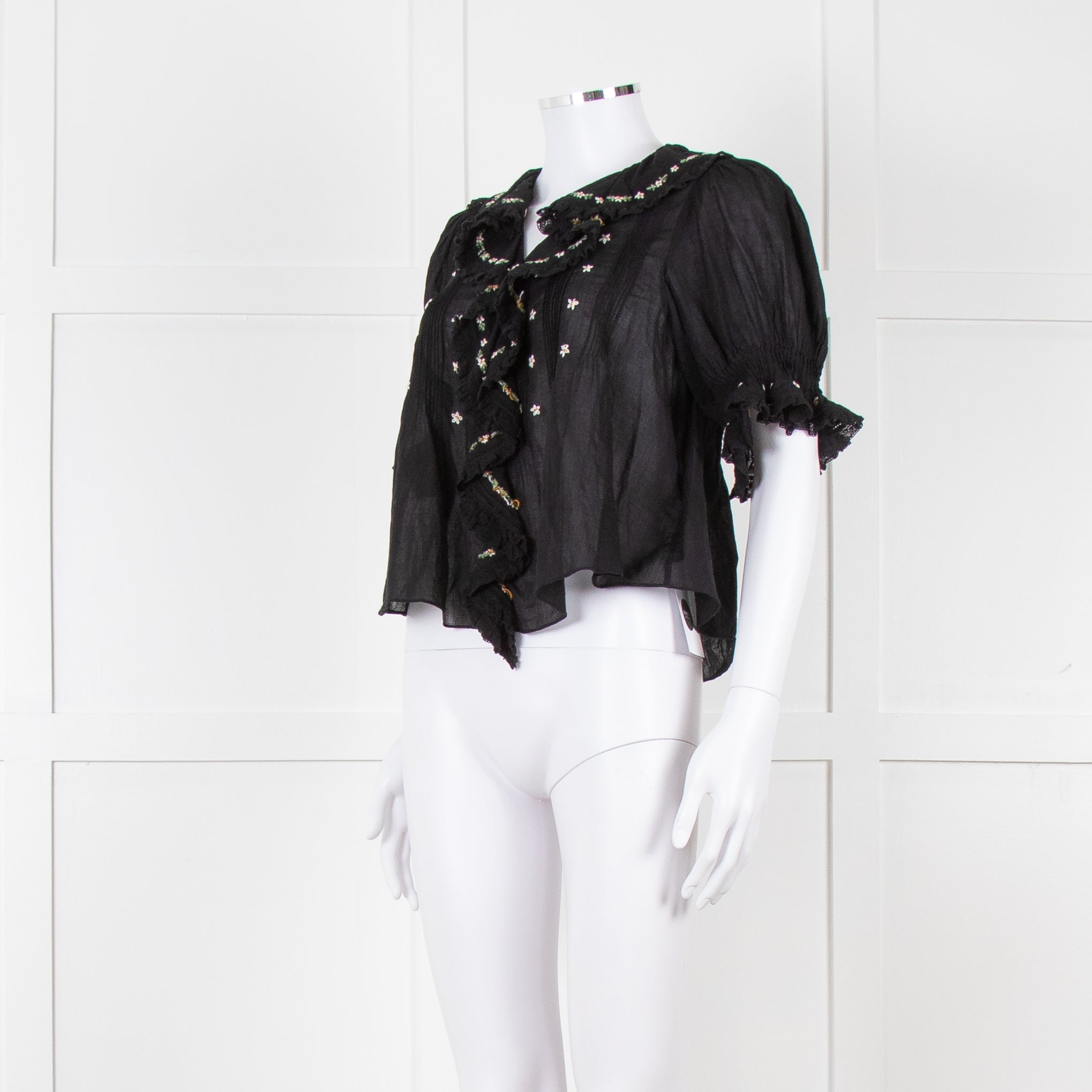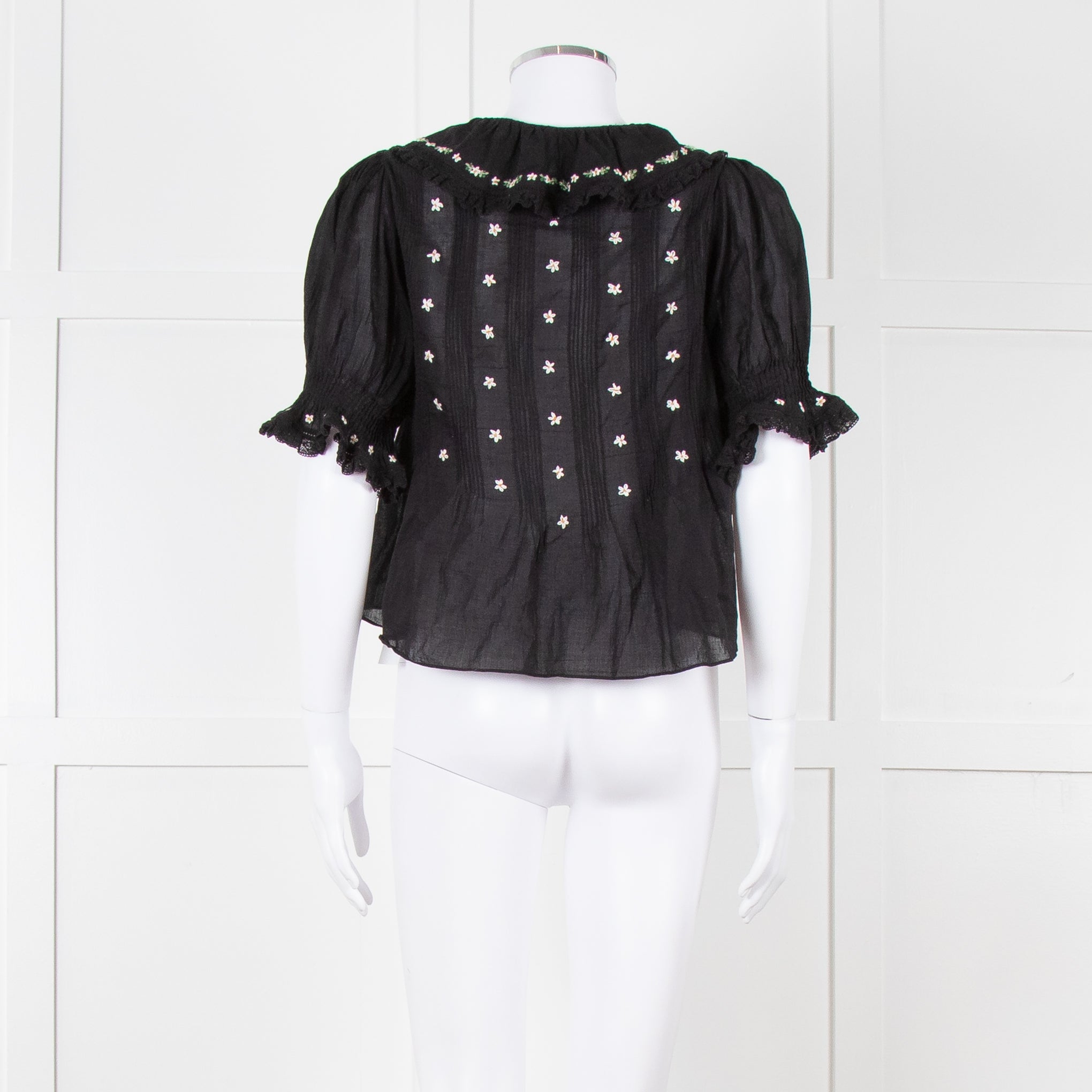 Doen black fine cotton short puffed sleeved blouse with pintuck detailing, floral embroidery, and a frill around the collar/ front opening.