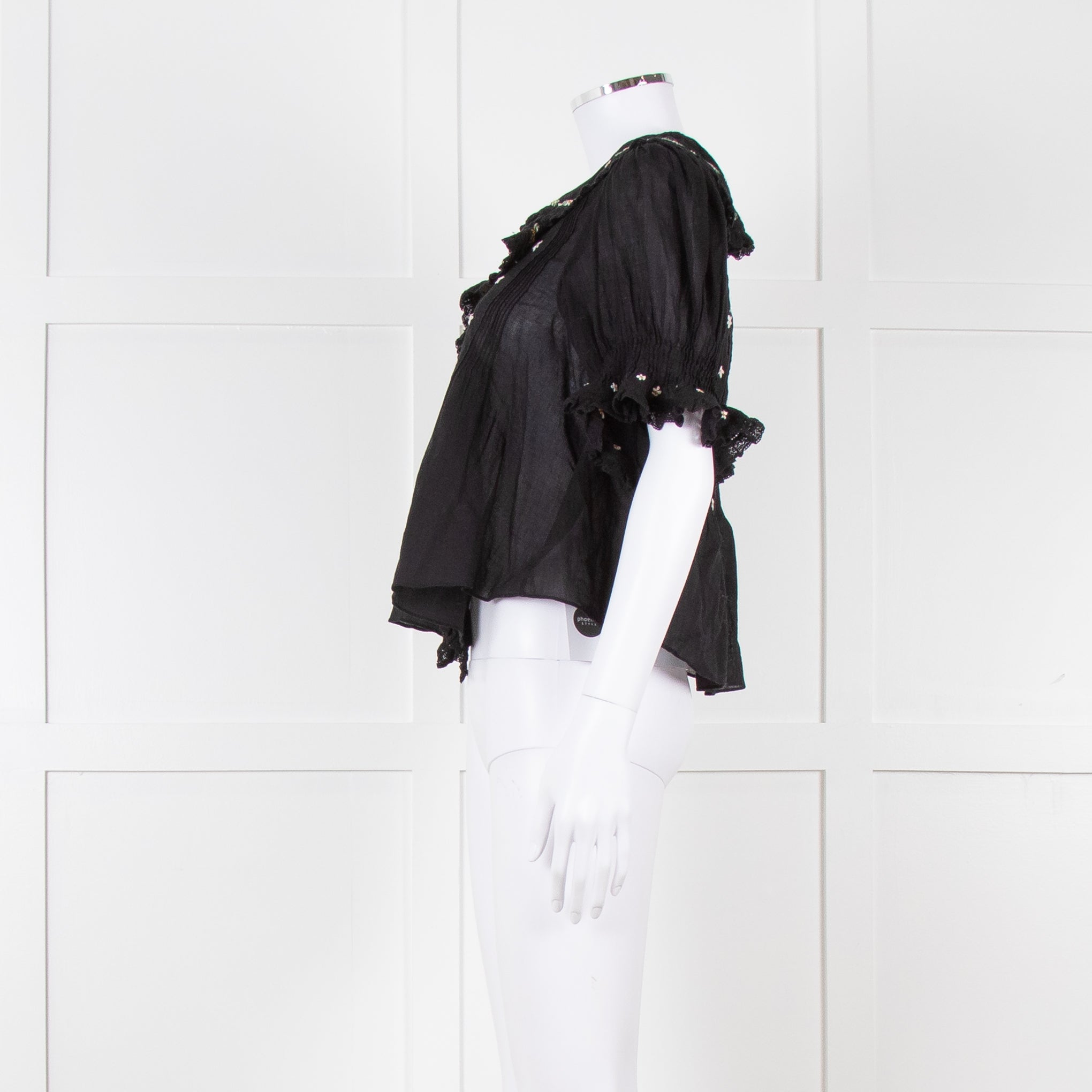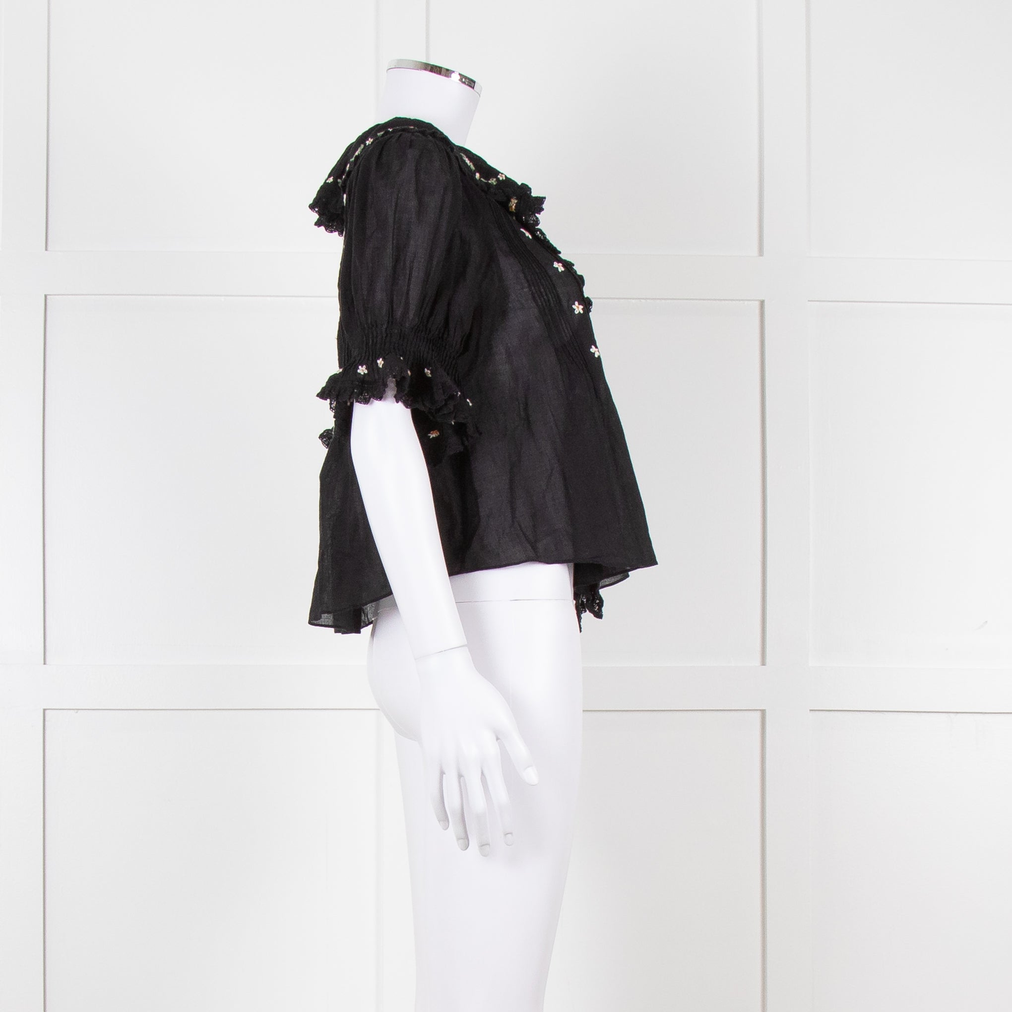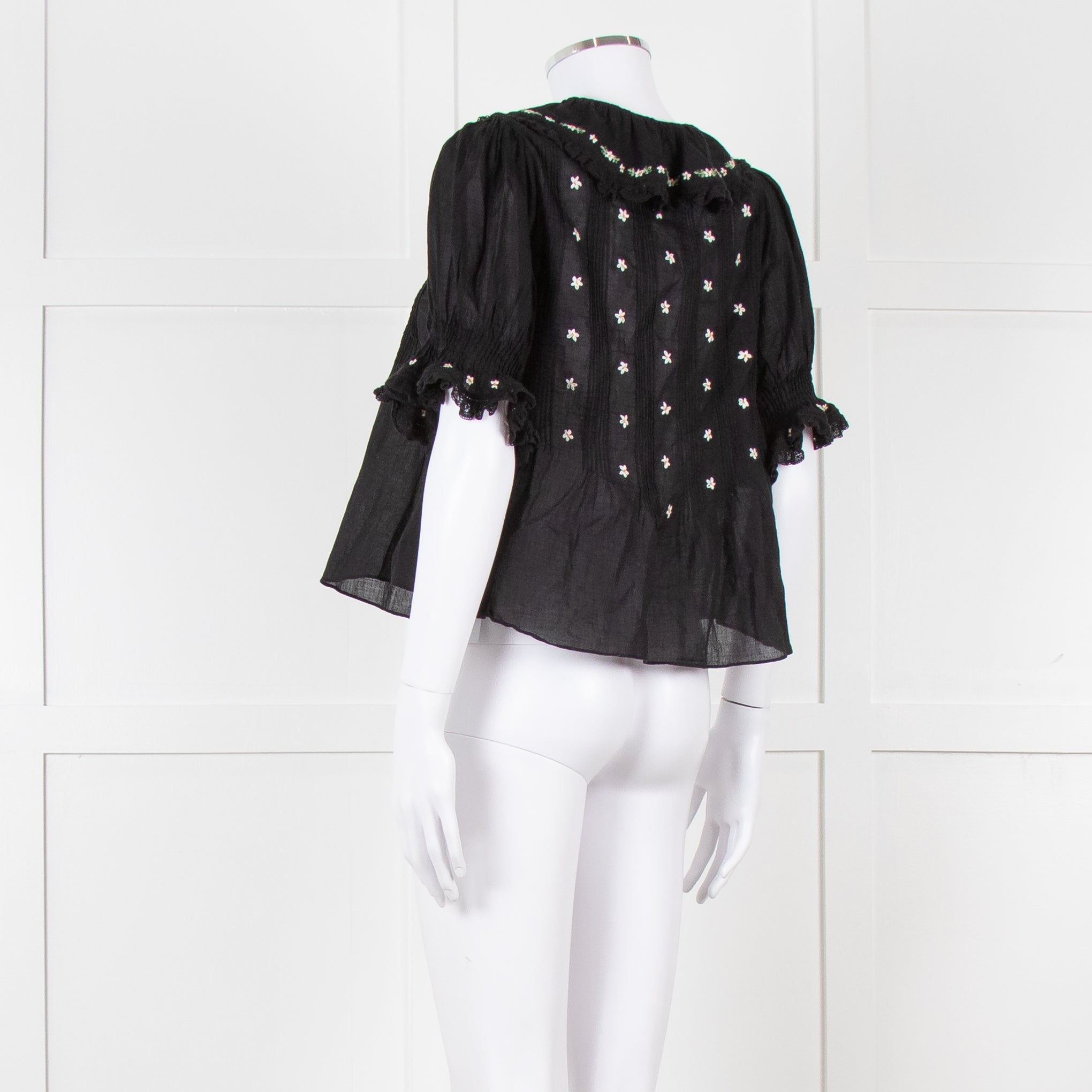 Doen black fine cotton short puffed sleeved blouse with pintuck detailing, floral embroidery, and a frill around the collar/ front opening.