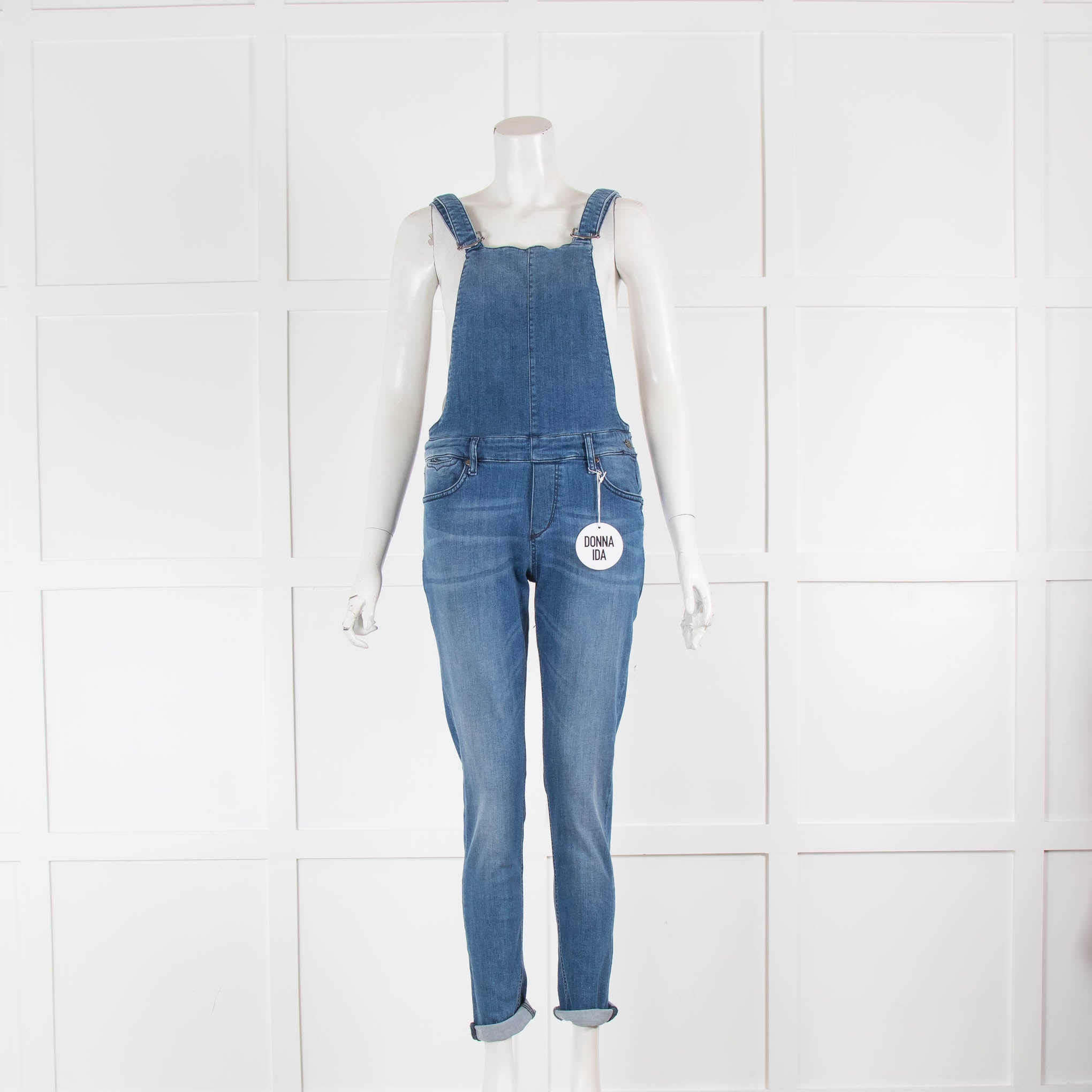 Donna Ida blue denim slim fit dungarees with silver-tone metal buckles, two side slip pockets and two rear patch pockets. New with tags.