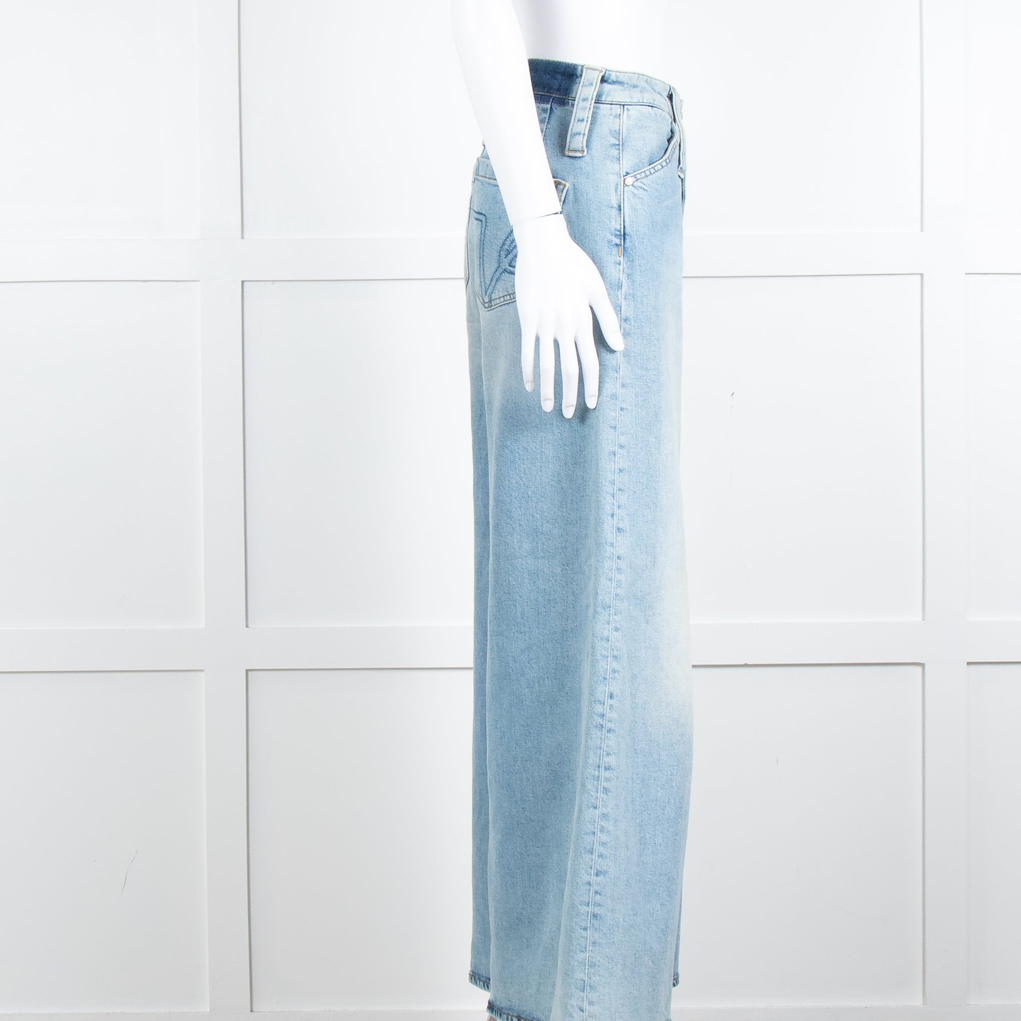 Dorothee Schumacher light blue distressed wash jeans with wide cut legs, contrast topstitching, belt loops, a concealed zip fly, and four pockets. Finished with subtle Love embroidery across the back pockets.