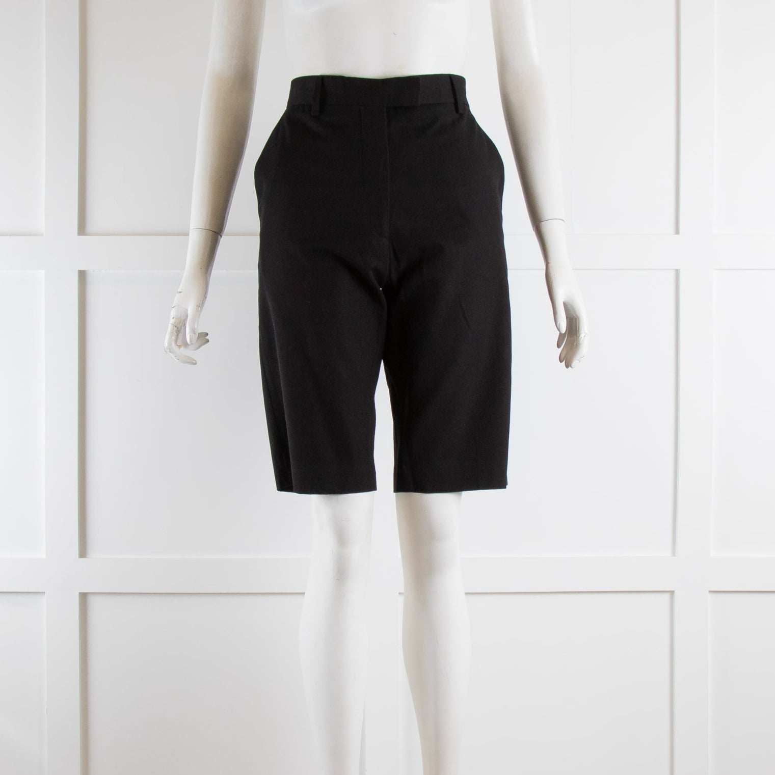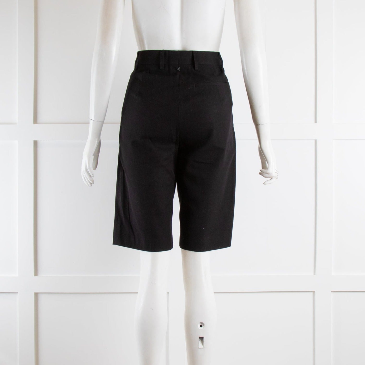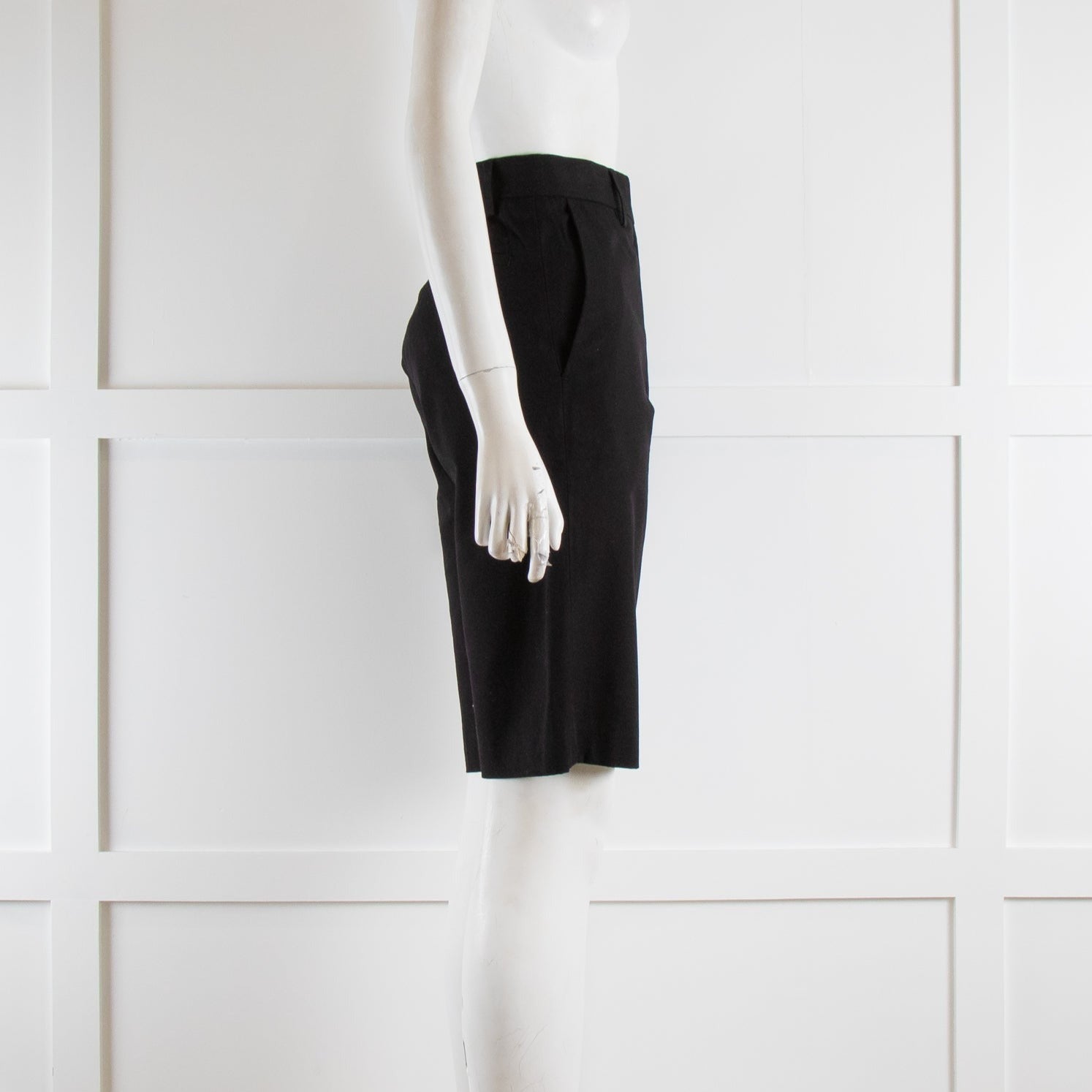 Dries Van Noten black long shorts with a concealed zip and metal clip fastening. Features belt loops, two front side pockets, and a faux rear slip pocket.