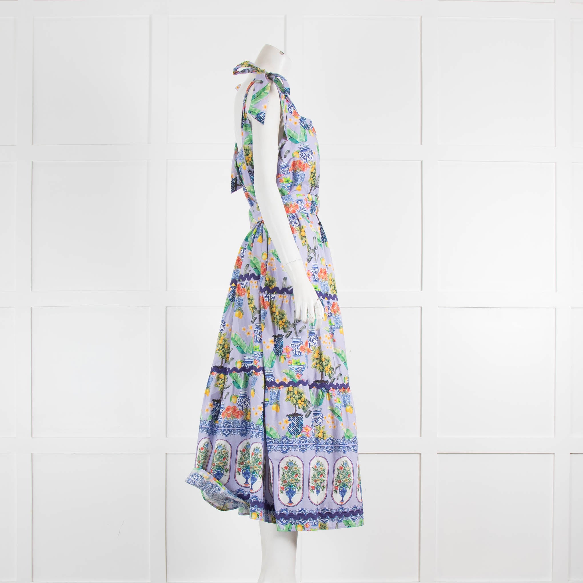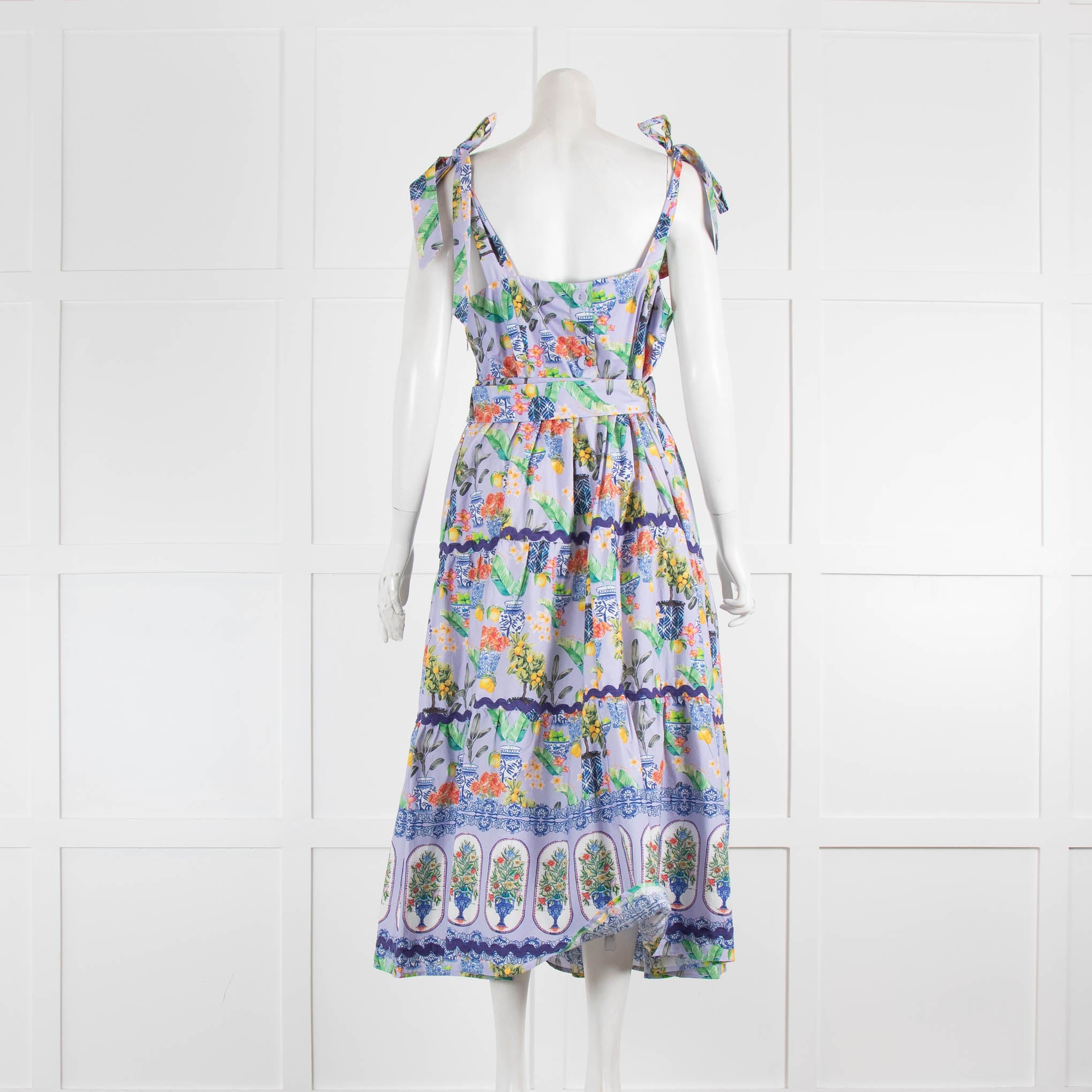 Emily Lovelock summer floral print cotton midi dress. Featuring hand-tied straps, a square neckline, a belted waist, ribboned tiered trims, and a concealed side zip fastening. New with tags.