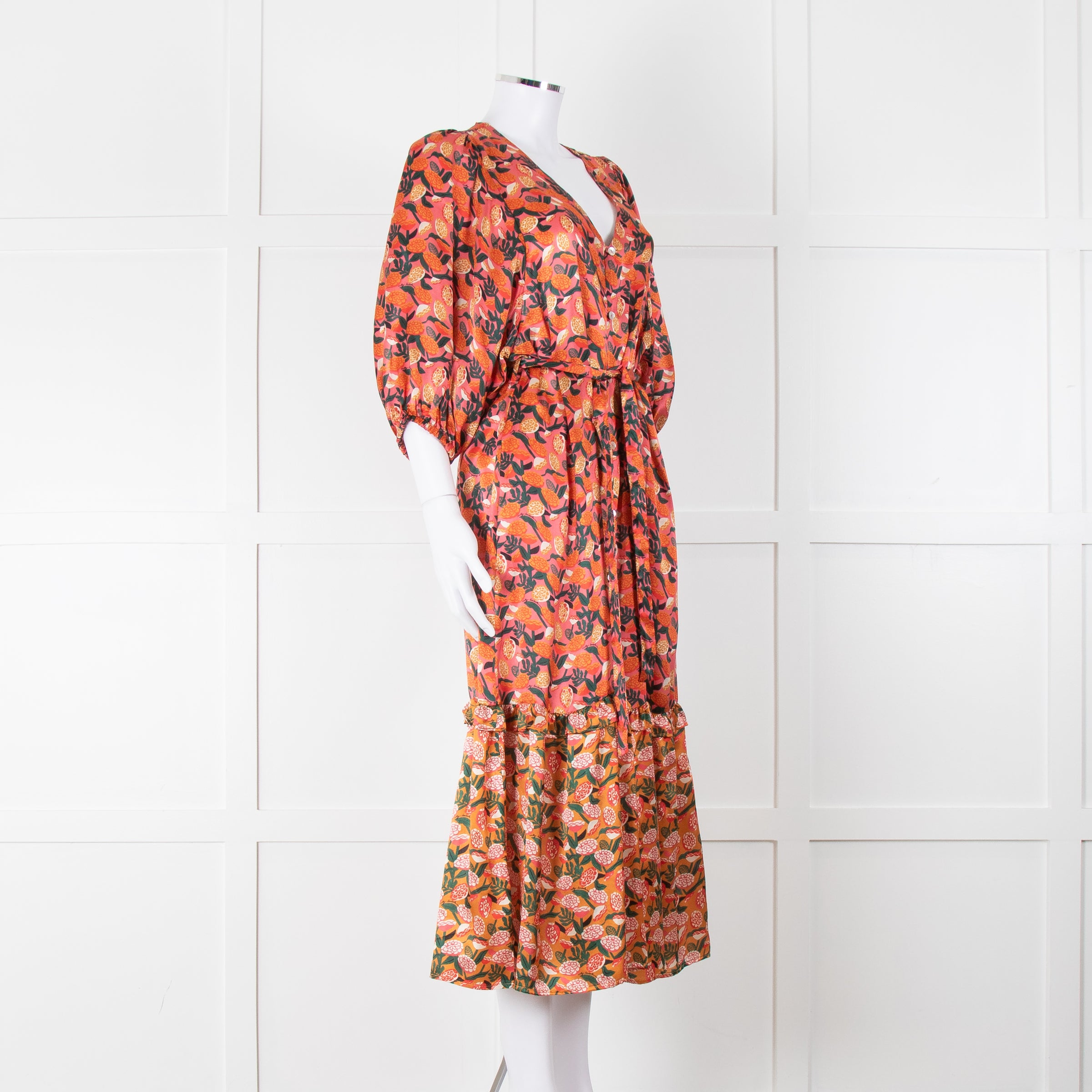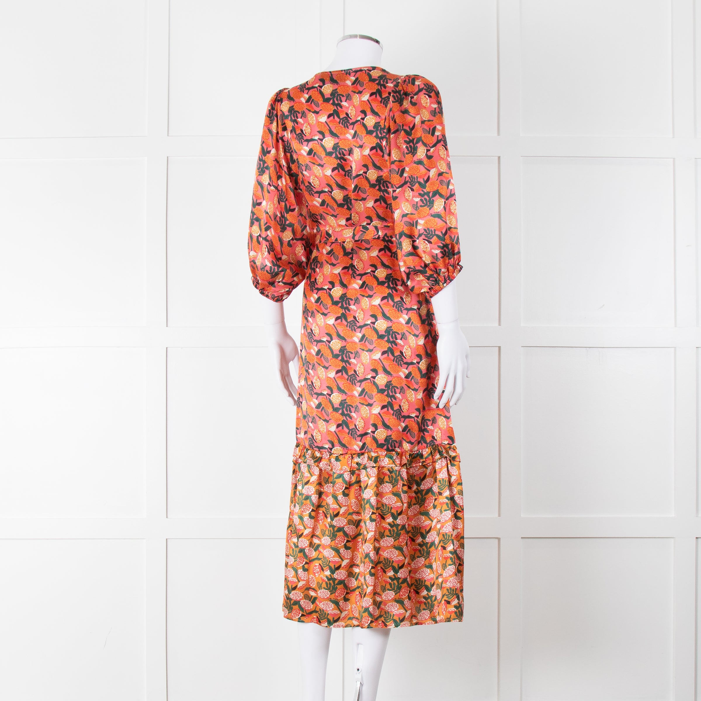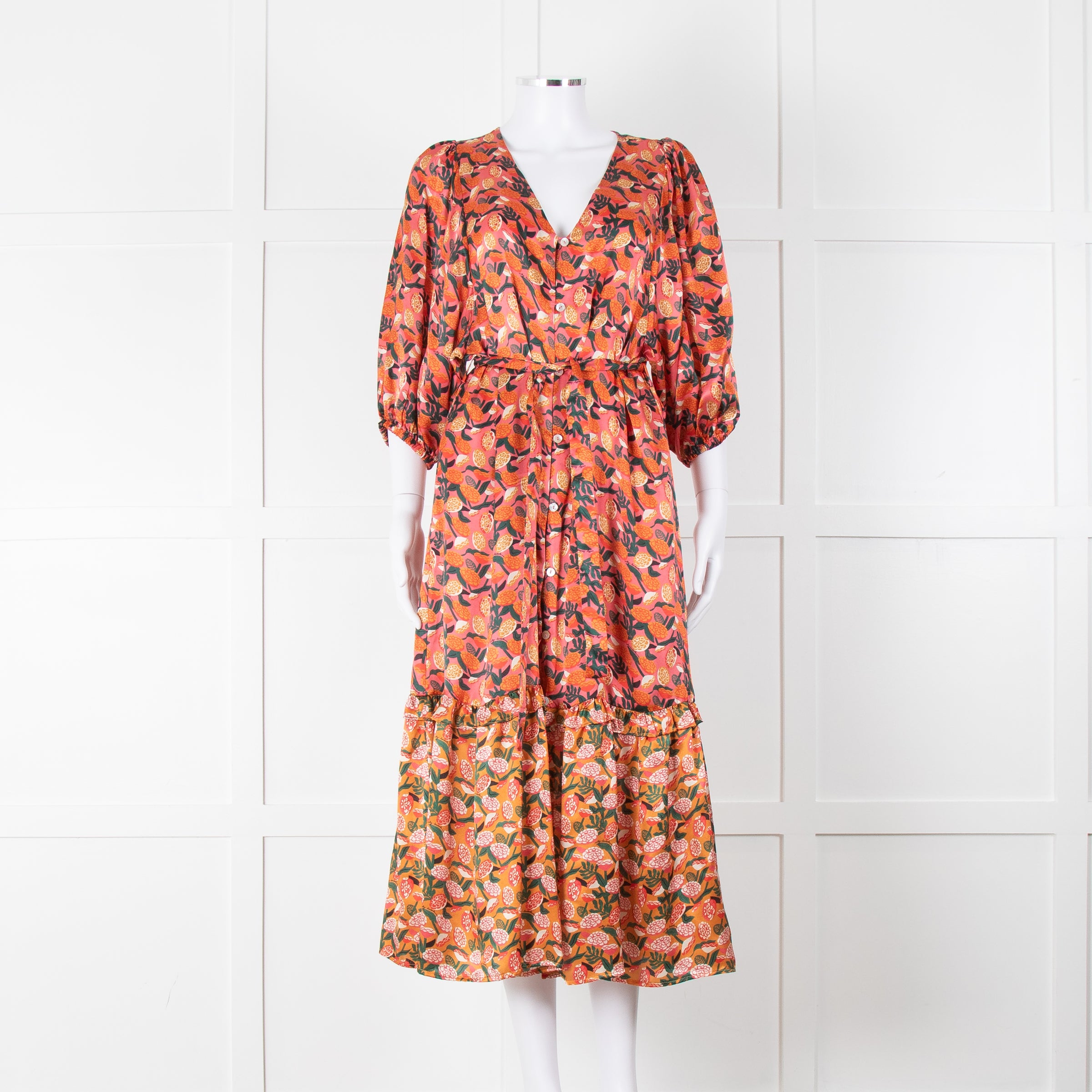 Emily Lovelock pink and orange floral print silk satin midi dress with a button-up front V-shaped neckline, short balloon sleeves, side slip pockets, and a deep ruffled panel around the hemline.