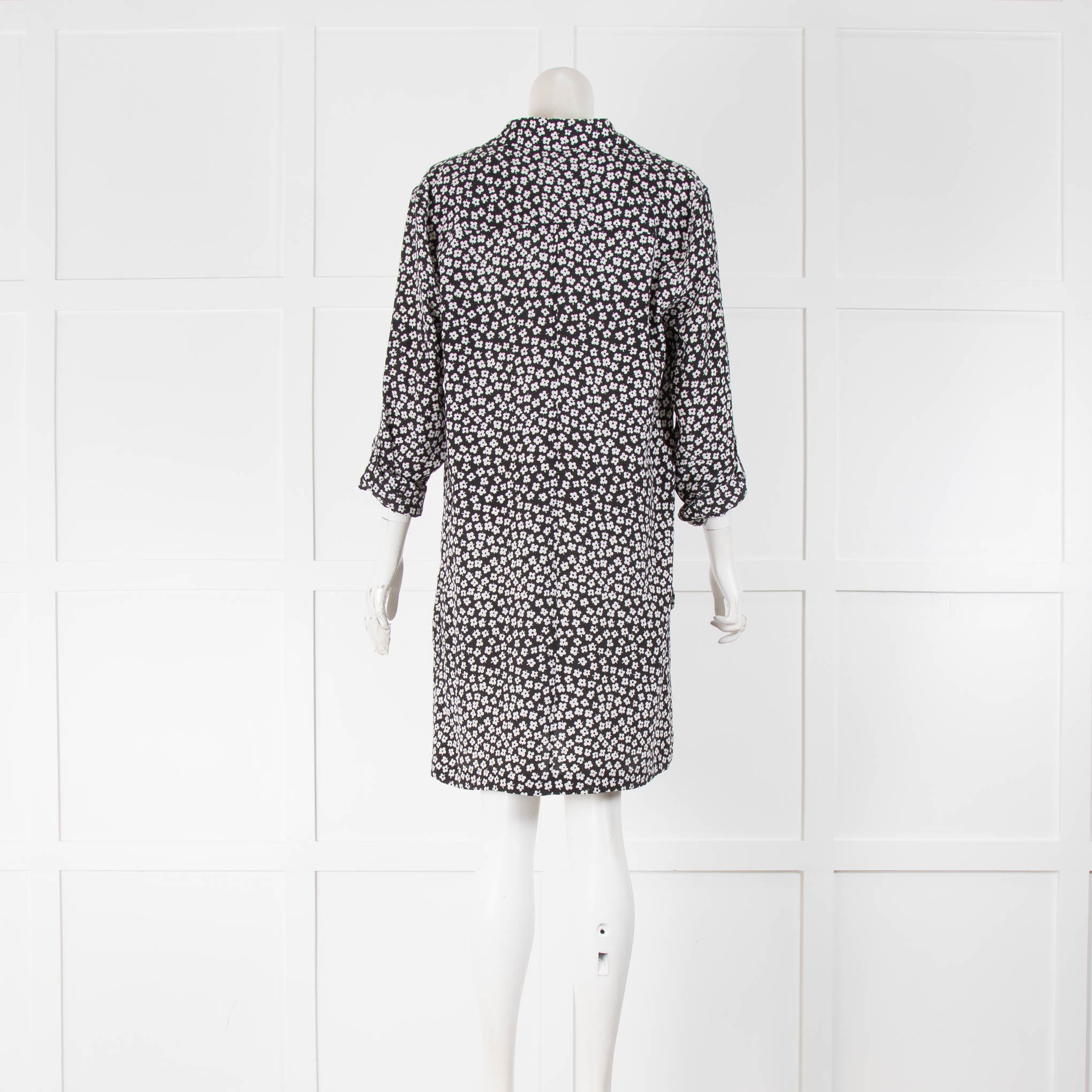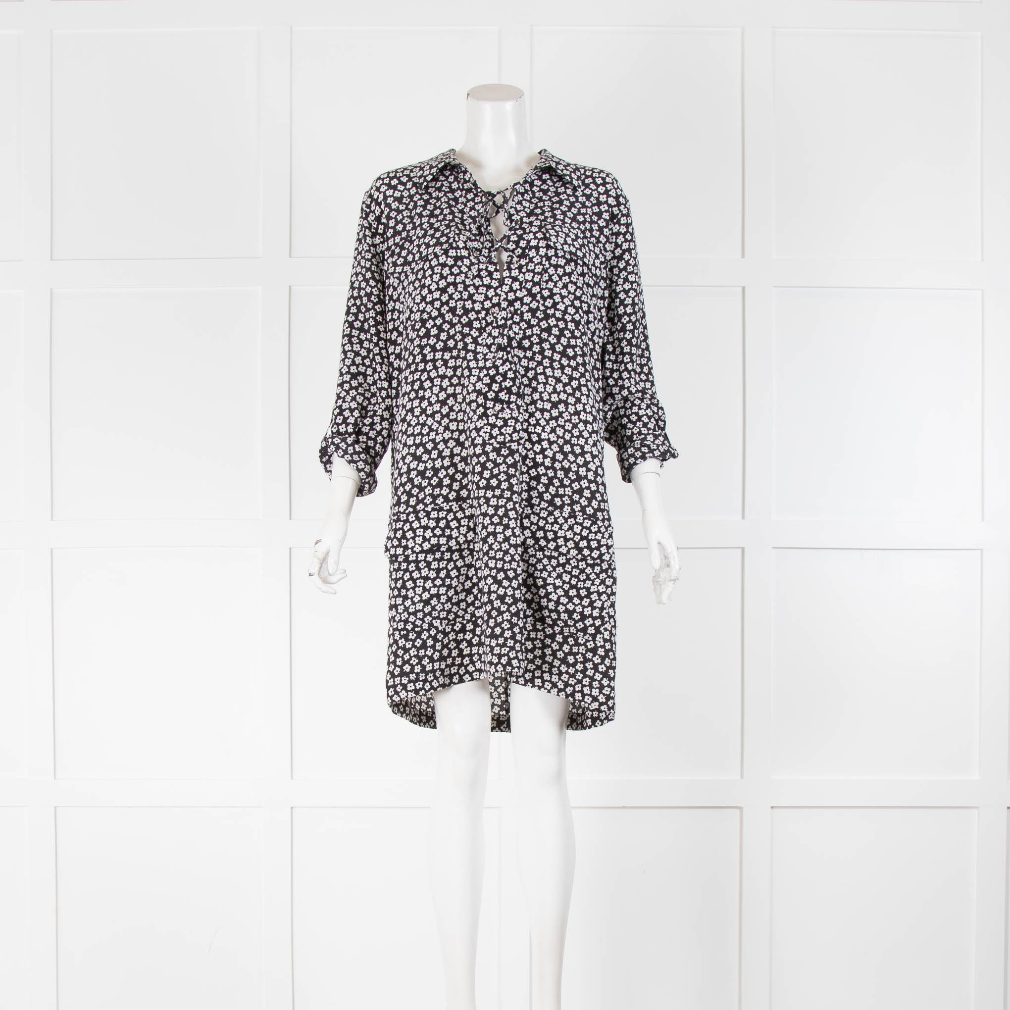 Equipment black and white floral print silk shirt style dress with a lace-up front, collar, four front patch pockets, and long sleeves with buttoned turn backs.