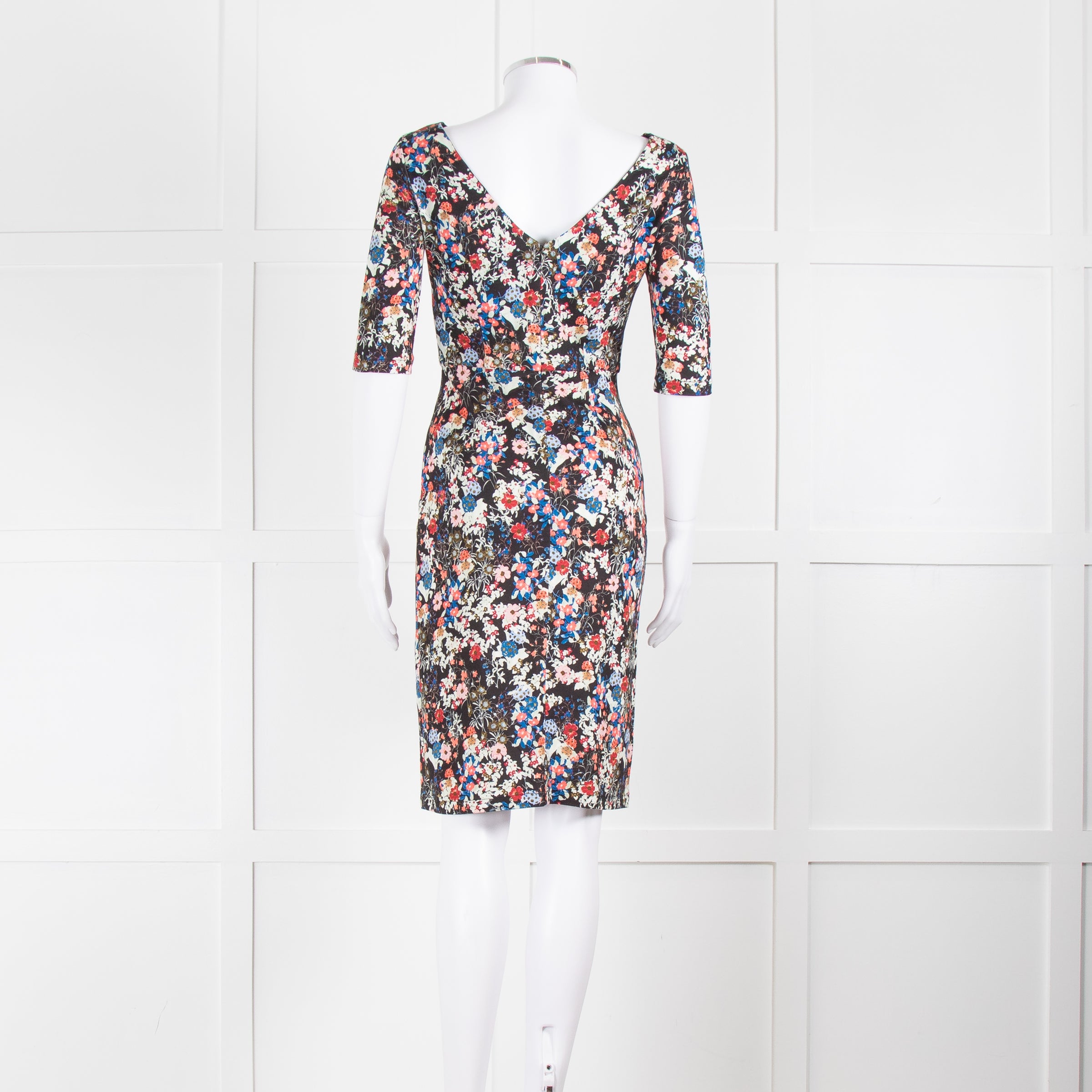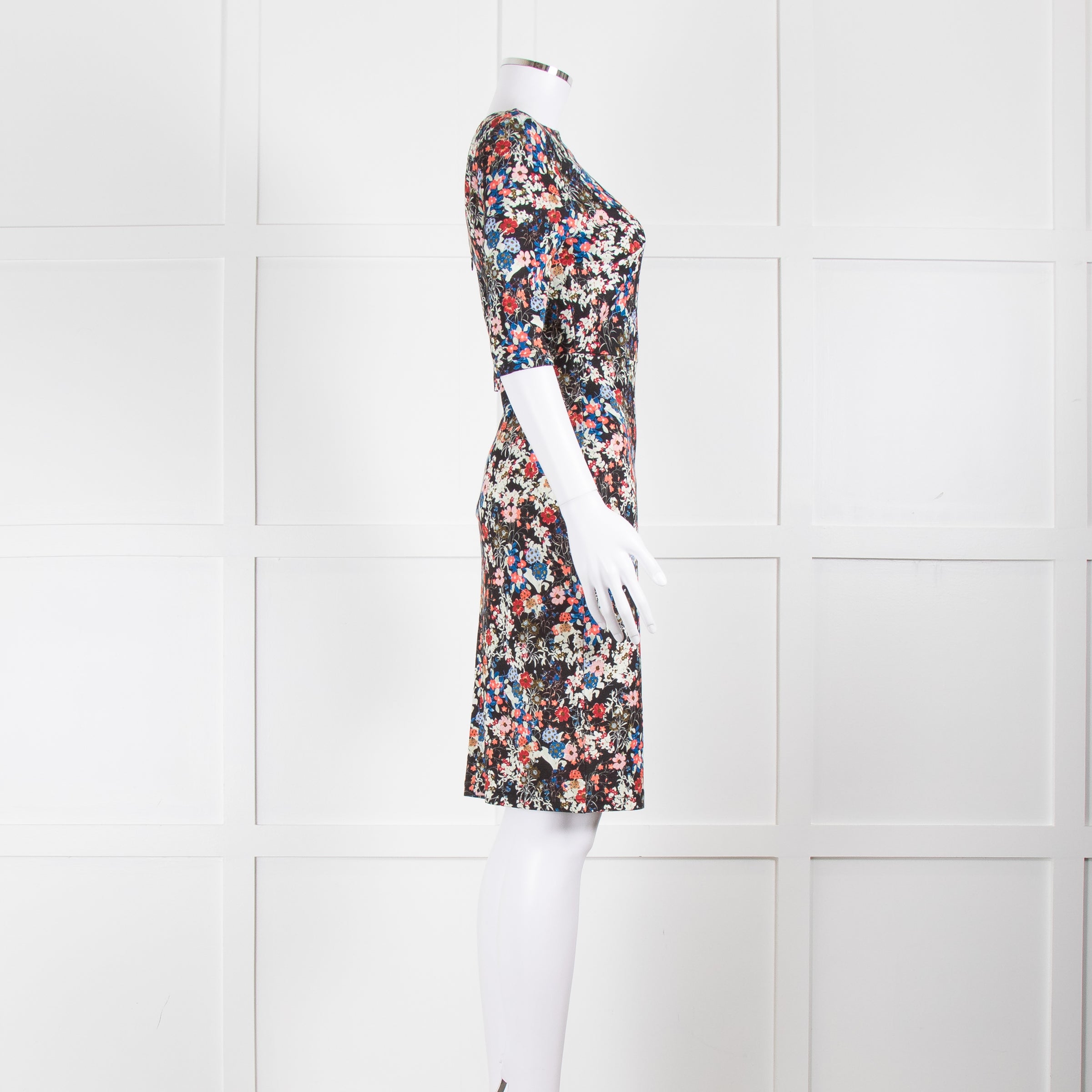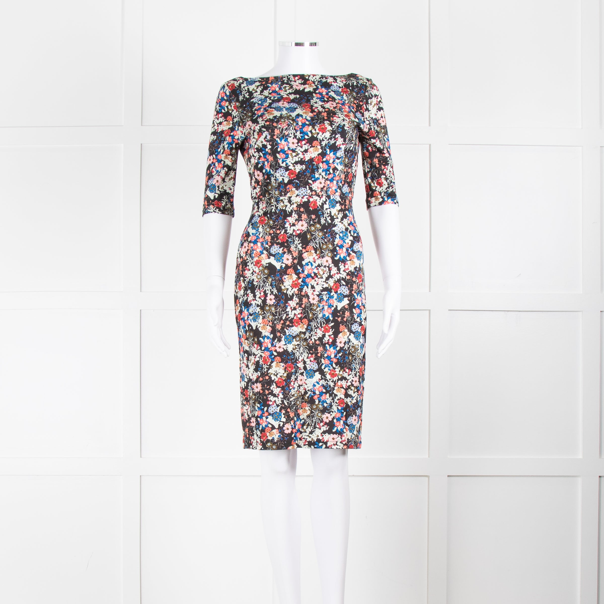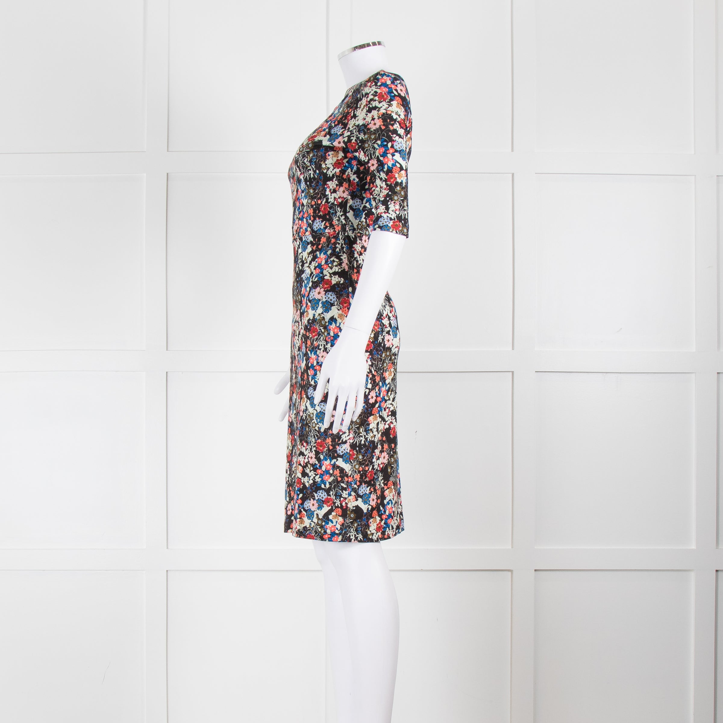 Erdem black and multi-floral jersey dress with a v-shaped back, high neckline, and short sleeves. Features concealed rear zip closure.