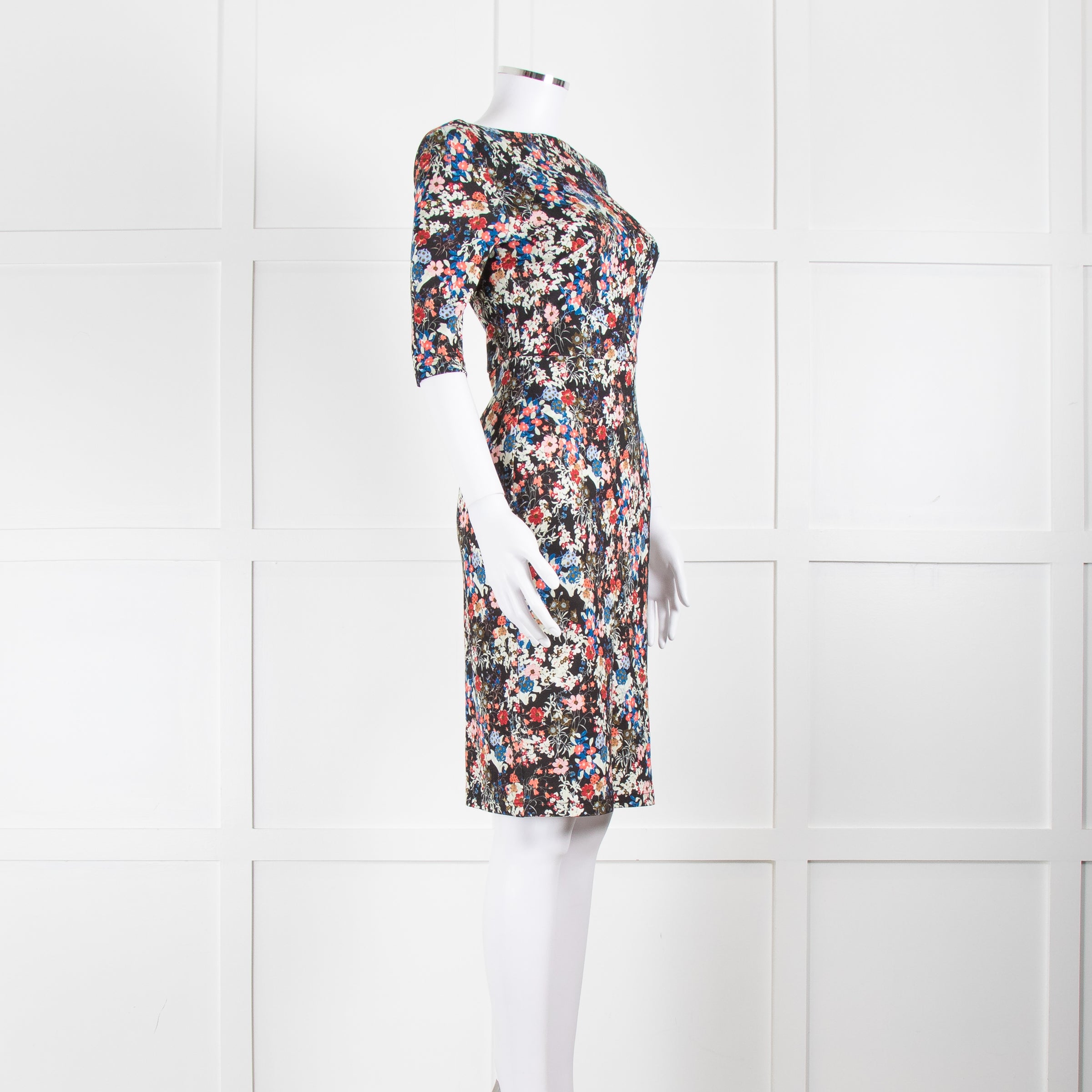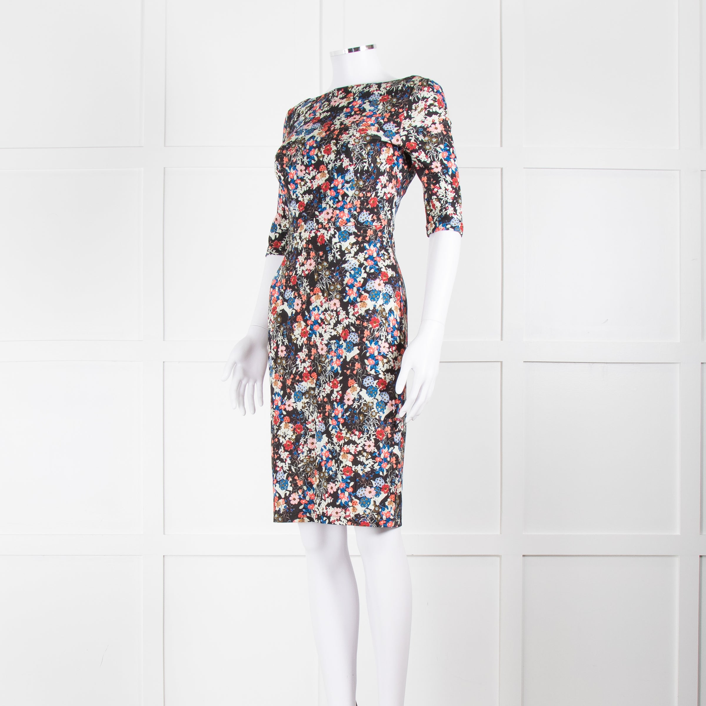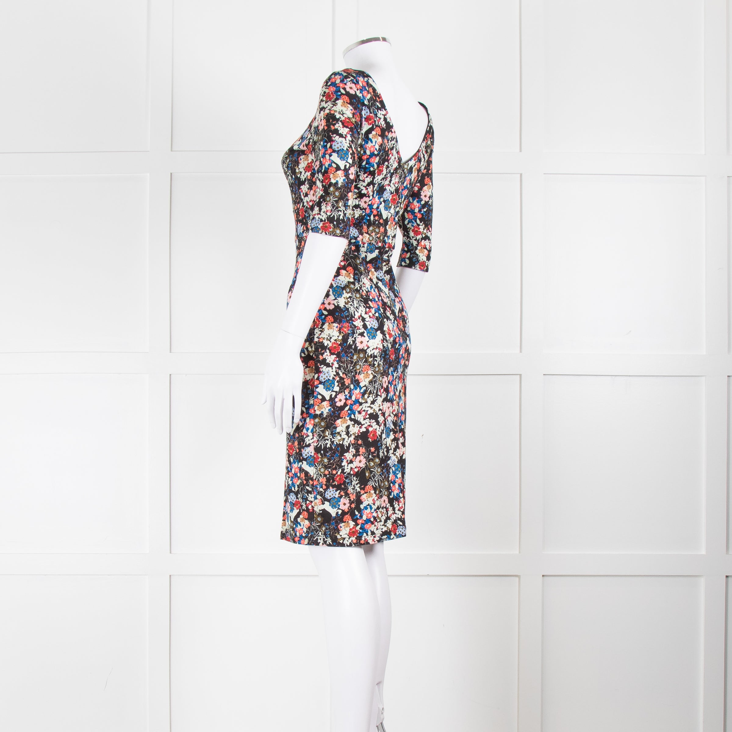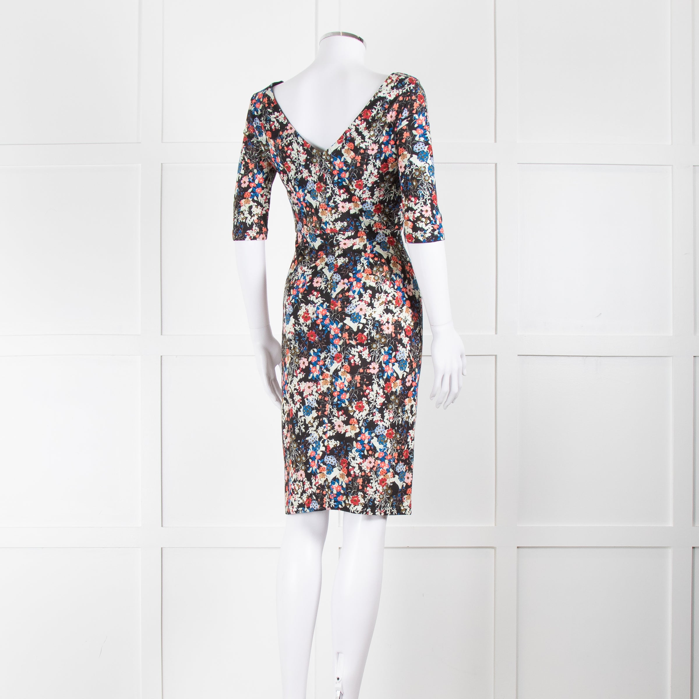 Erdem black and multi-floral jersey dress with a v-shaped back, high neckline, and short sleeves. Features concealed rear zip closure.