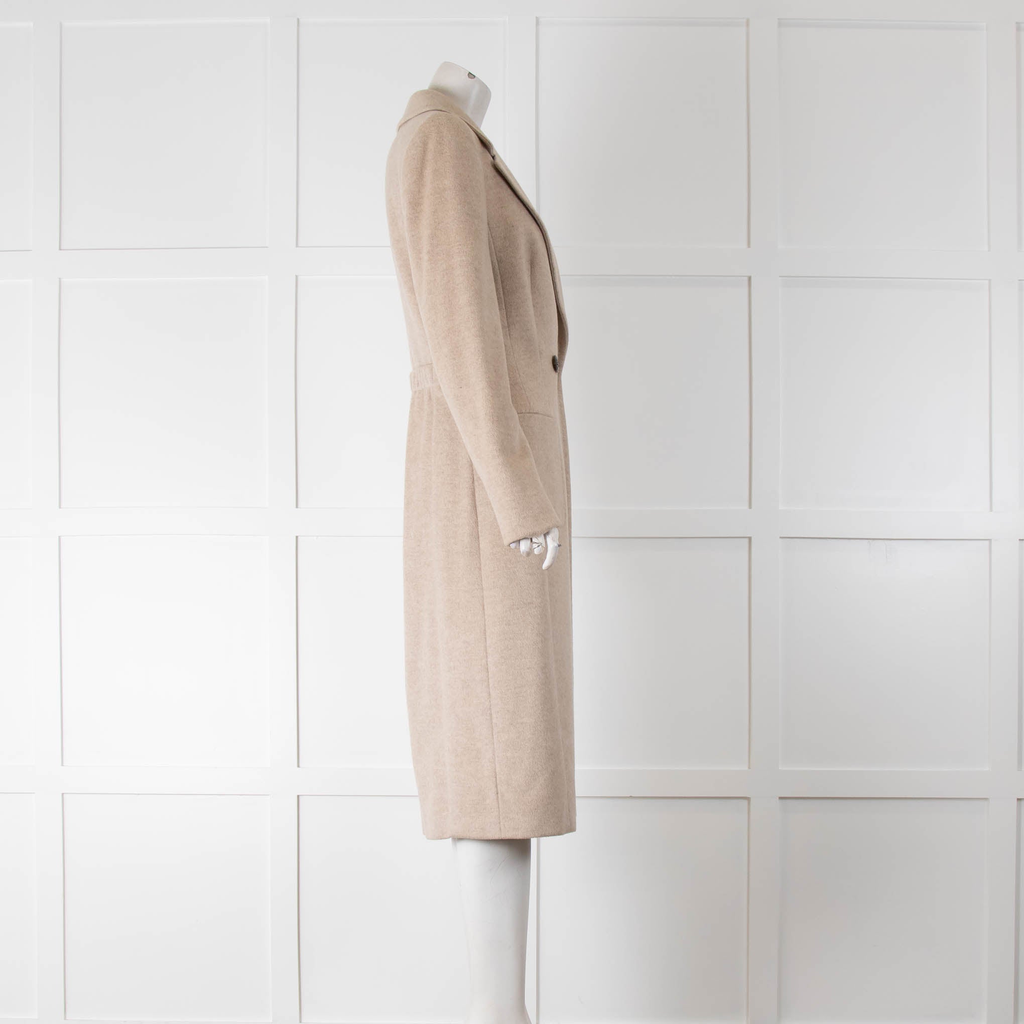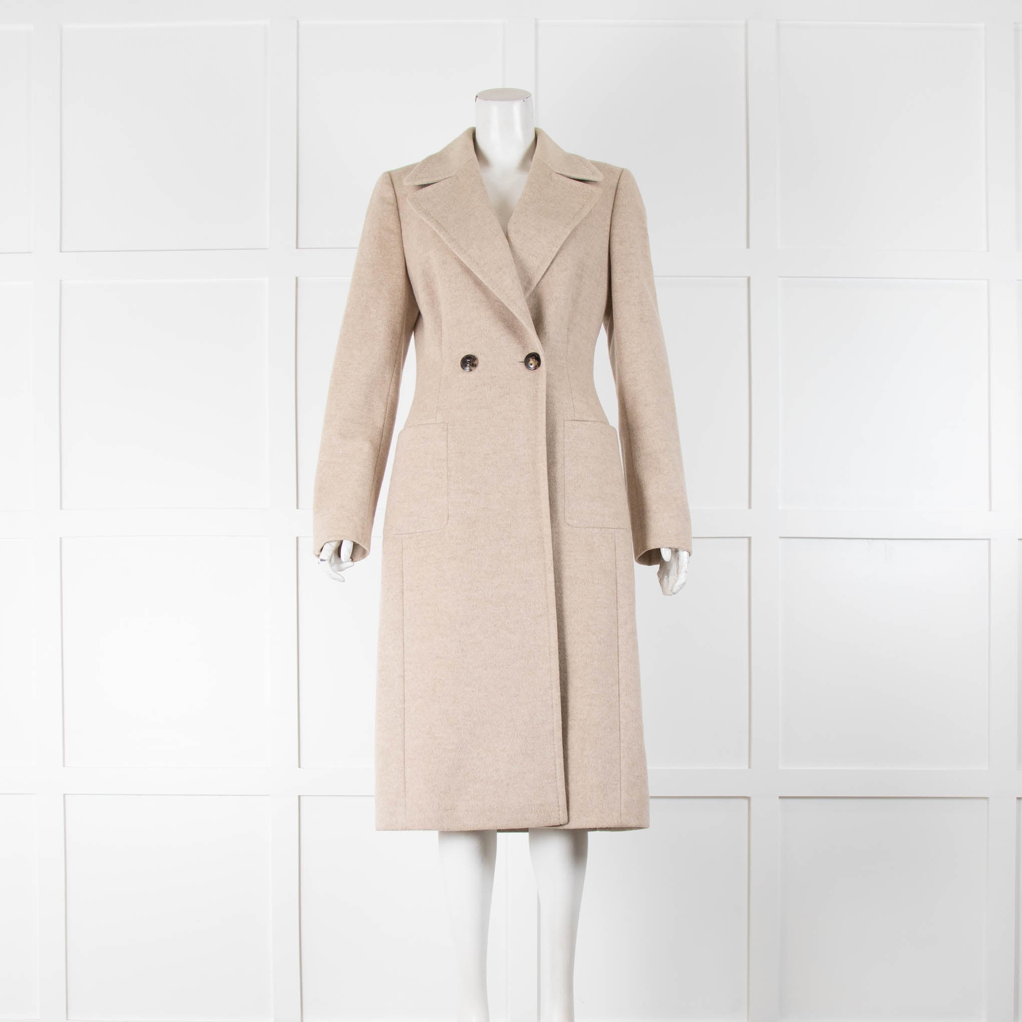 Escada oatmeal cashmere tailored coat. Features oversized notched lapels, exposed stitching, double-breasted button fastening, and two front patch pockets.