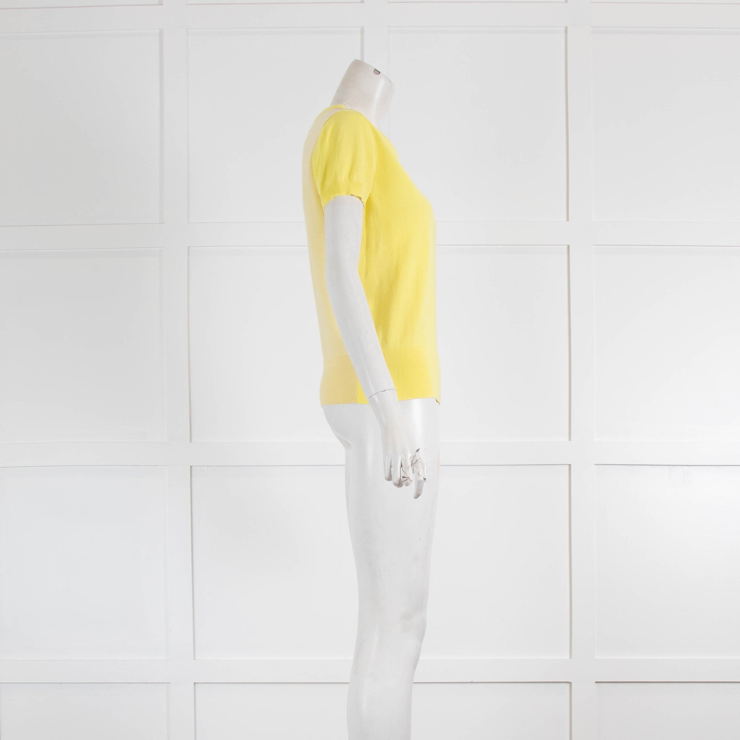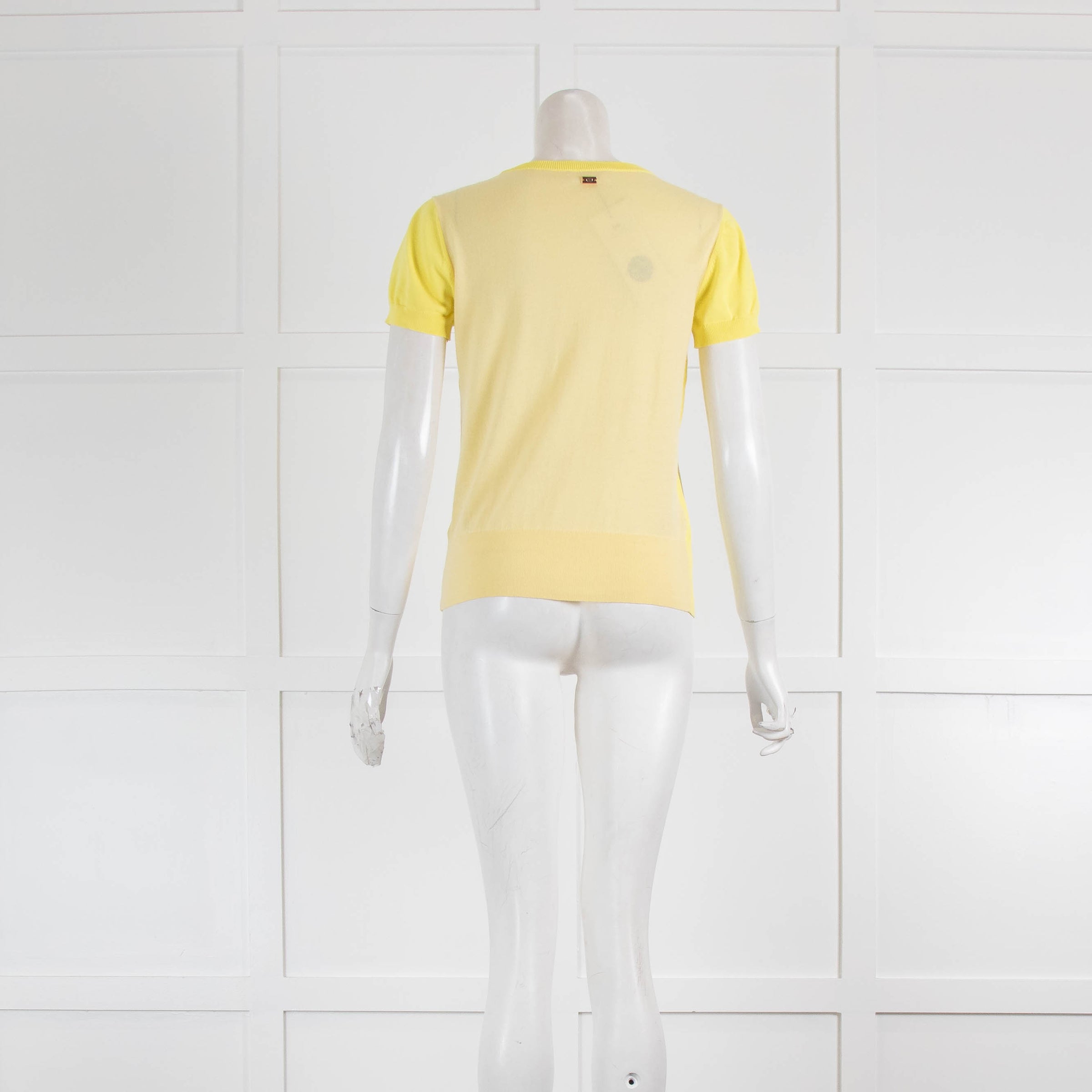 Escada yellow wool blend short-sleeved top. Featuring a rounded neckline, ribbed trims, and a pale yellow back.