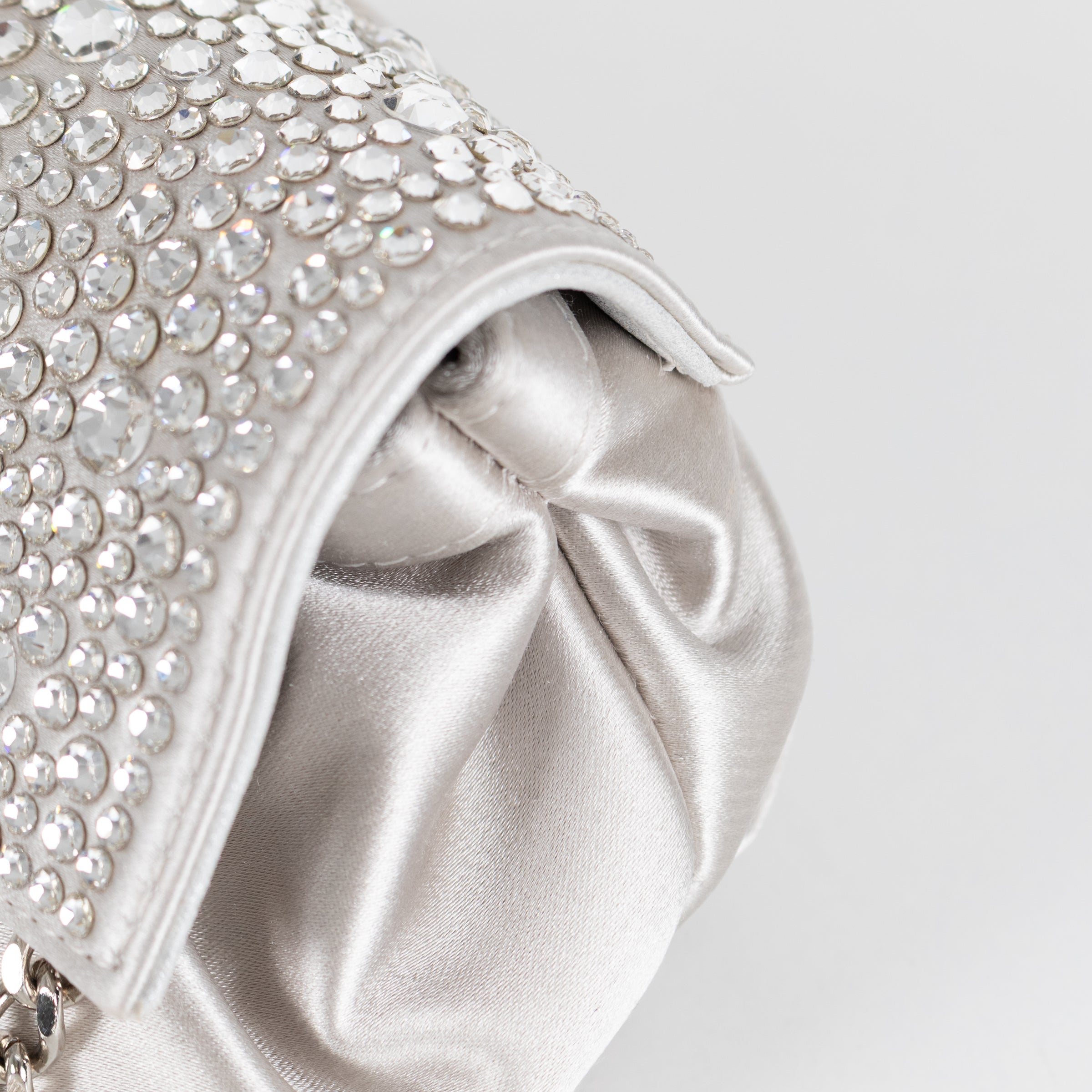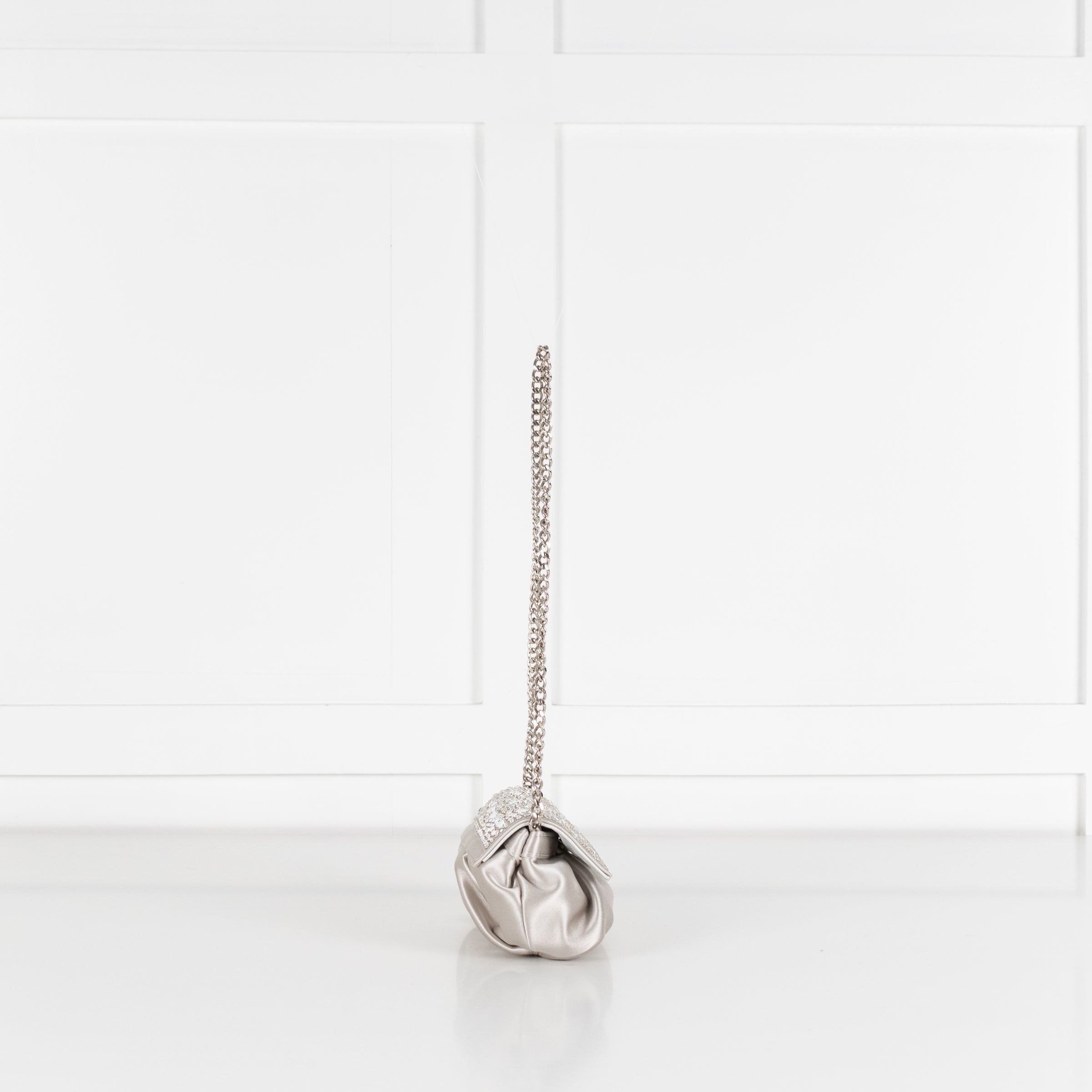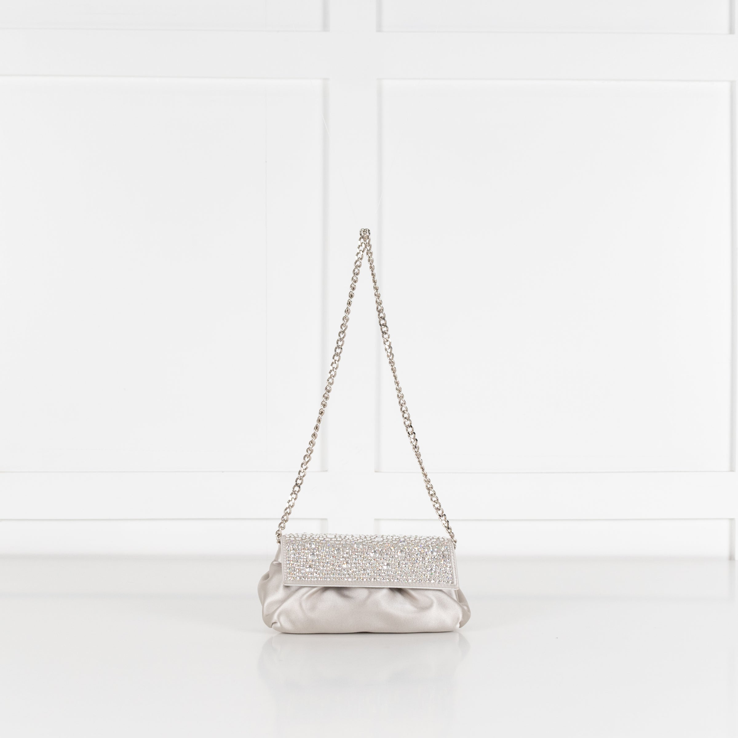 Gina Silver satin crystal embellished small silver evening bag with a silver chain strap, small popper fastener, front flap closure with a small internal pocket.