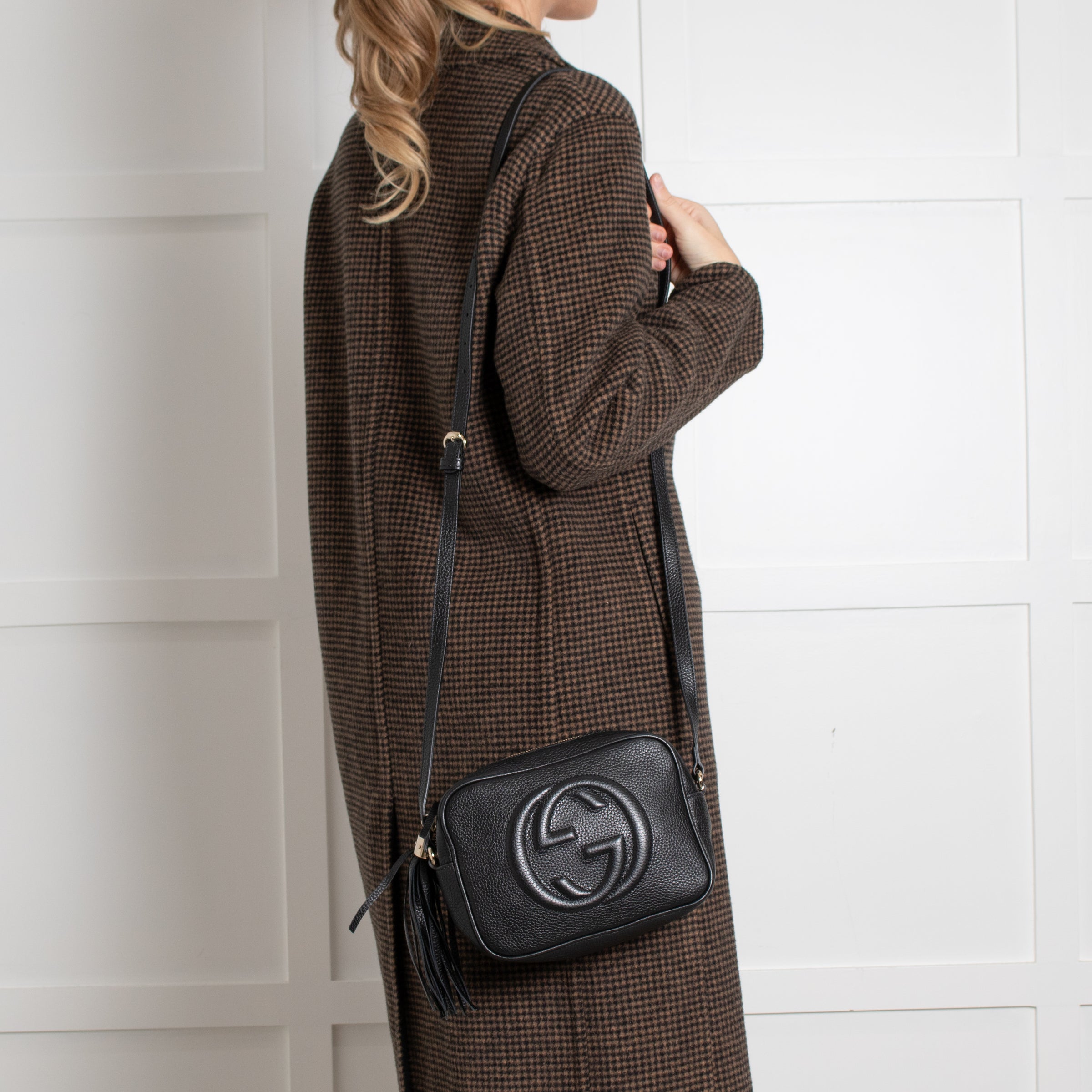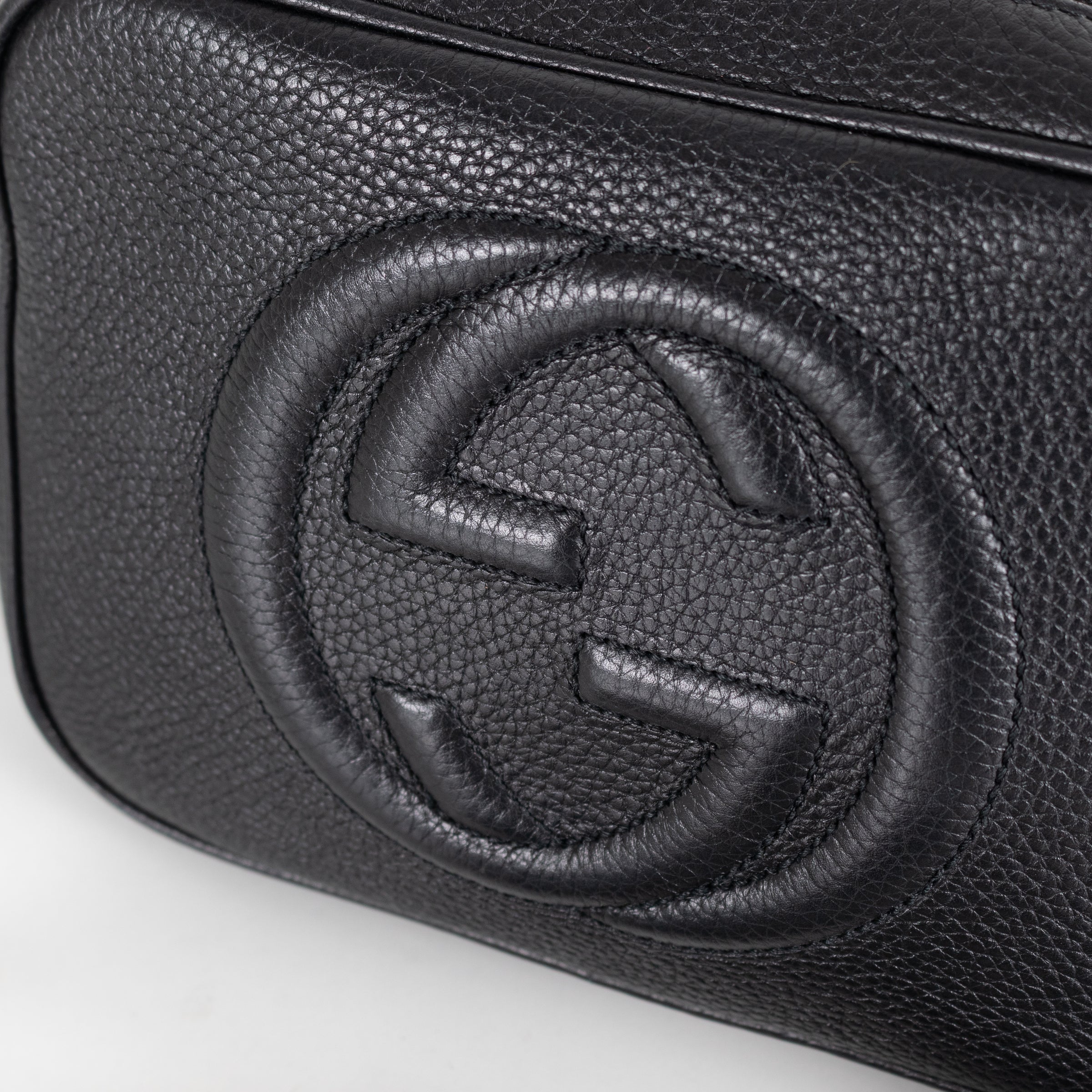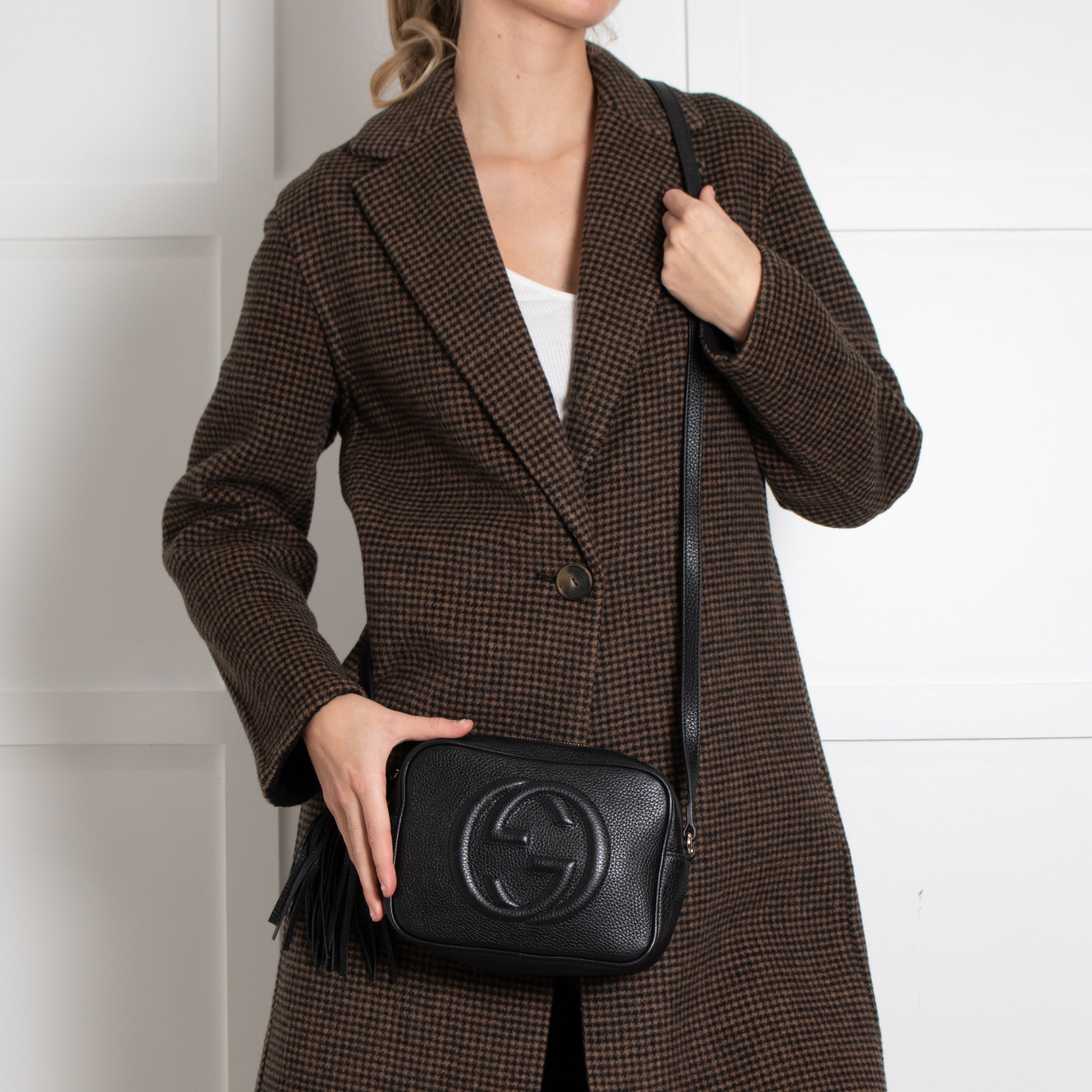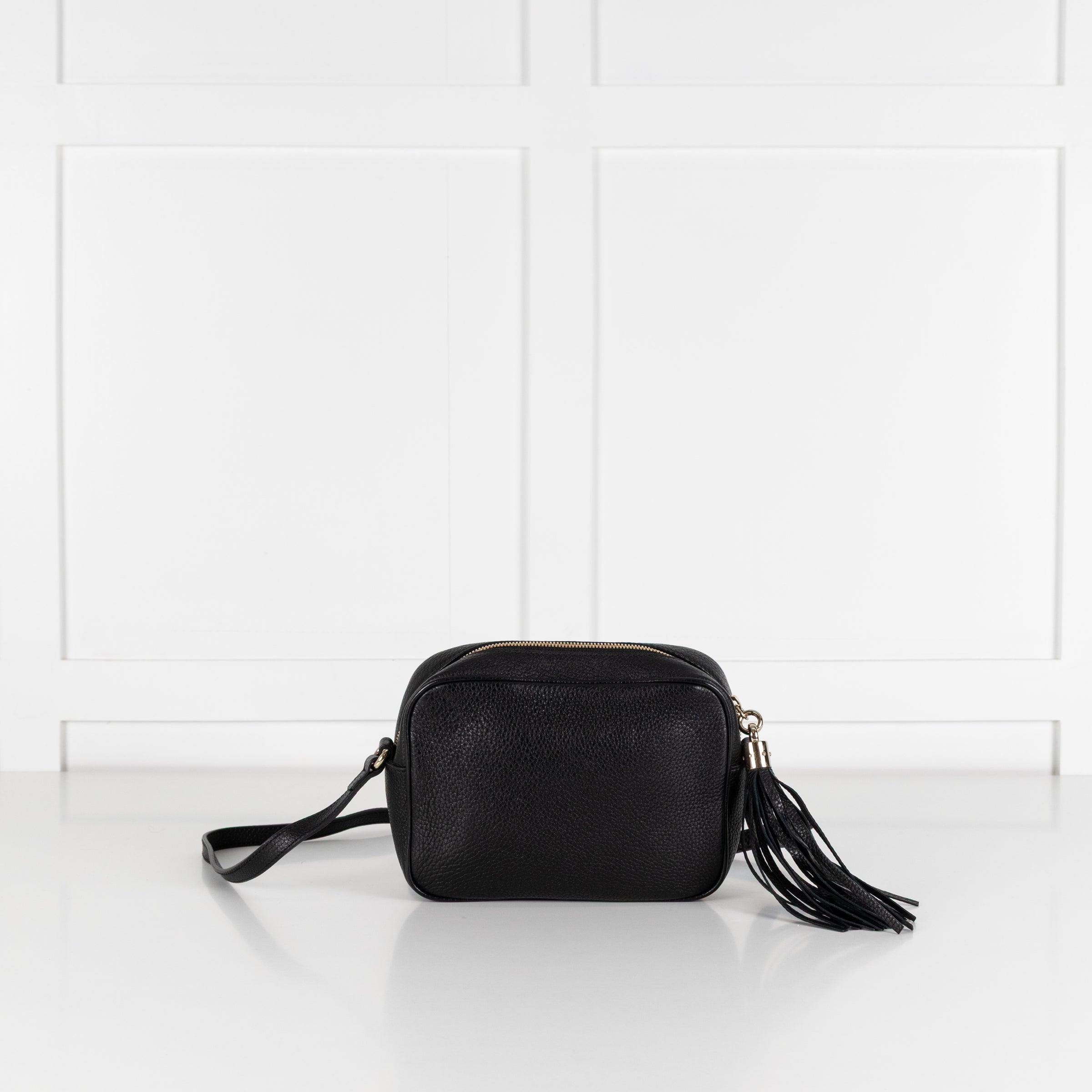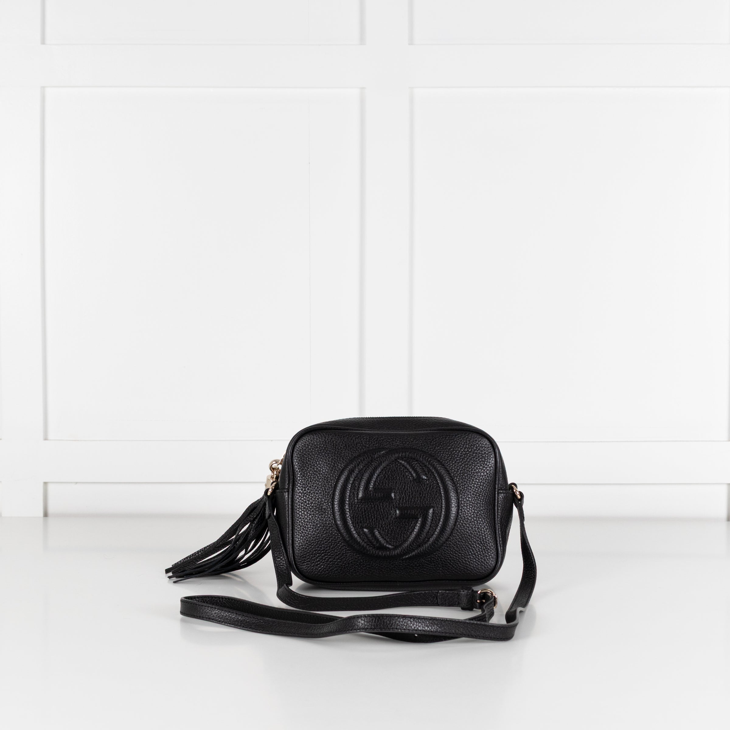 Gucci black Soho disco bag in grained leather with an embossed large front logo and top gold-tone metal zip closure. Features a large tonal tassel zip and a long shoulder strap with buckle adjustment. Has a cream canvas lining with two internal side slip pockets. Accompanied by its original dustbag.
