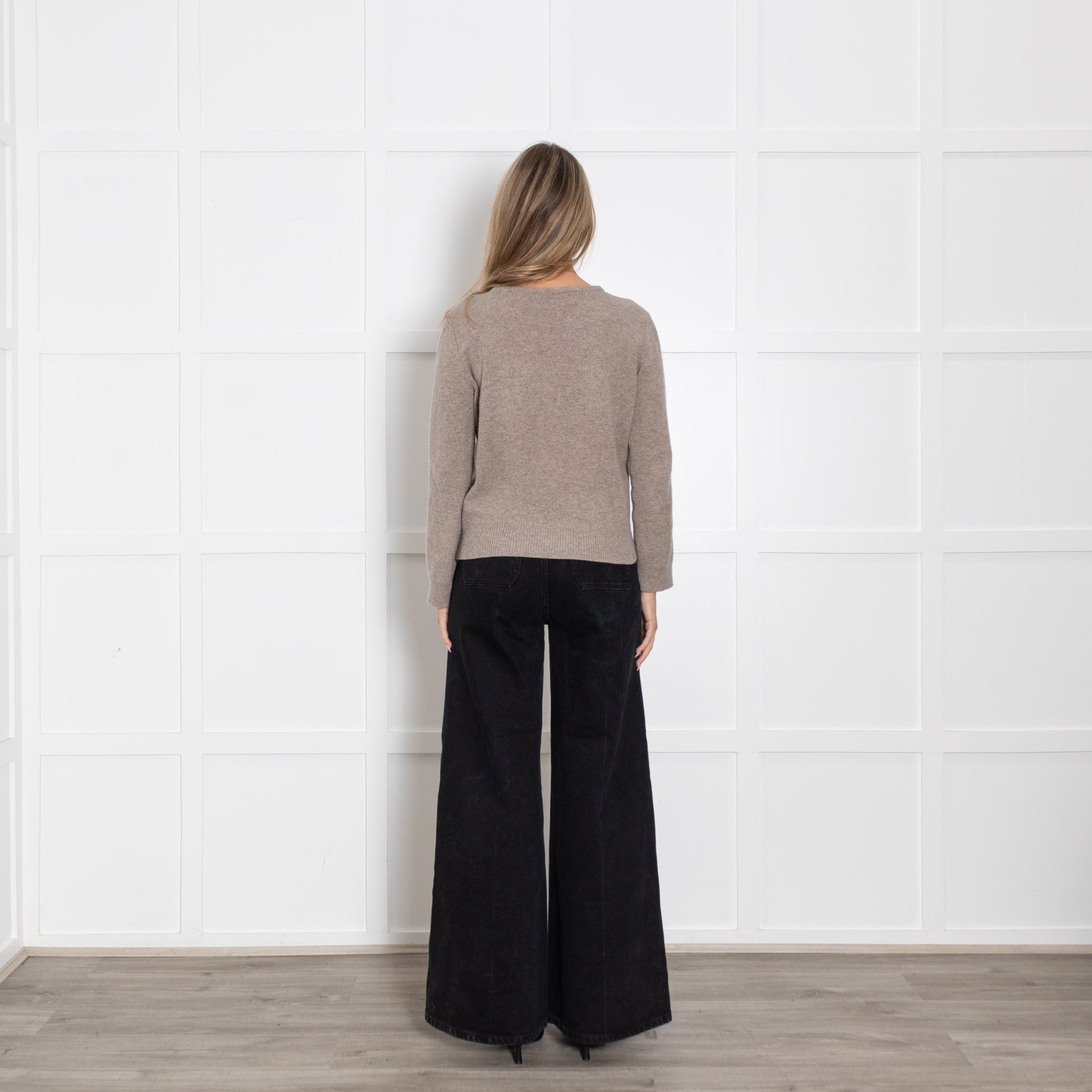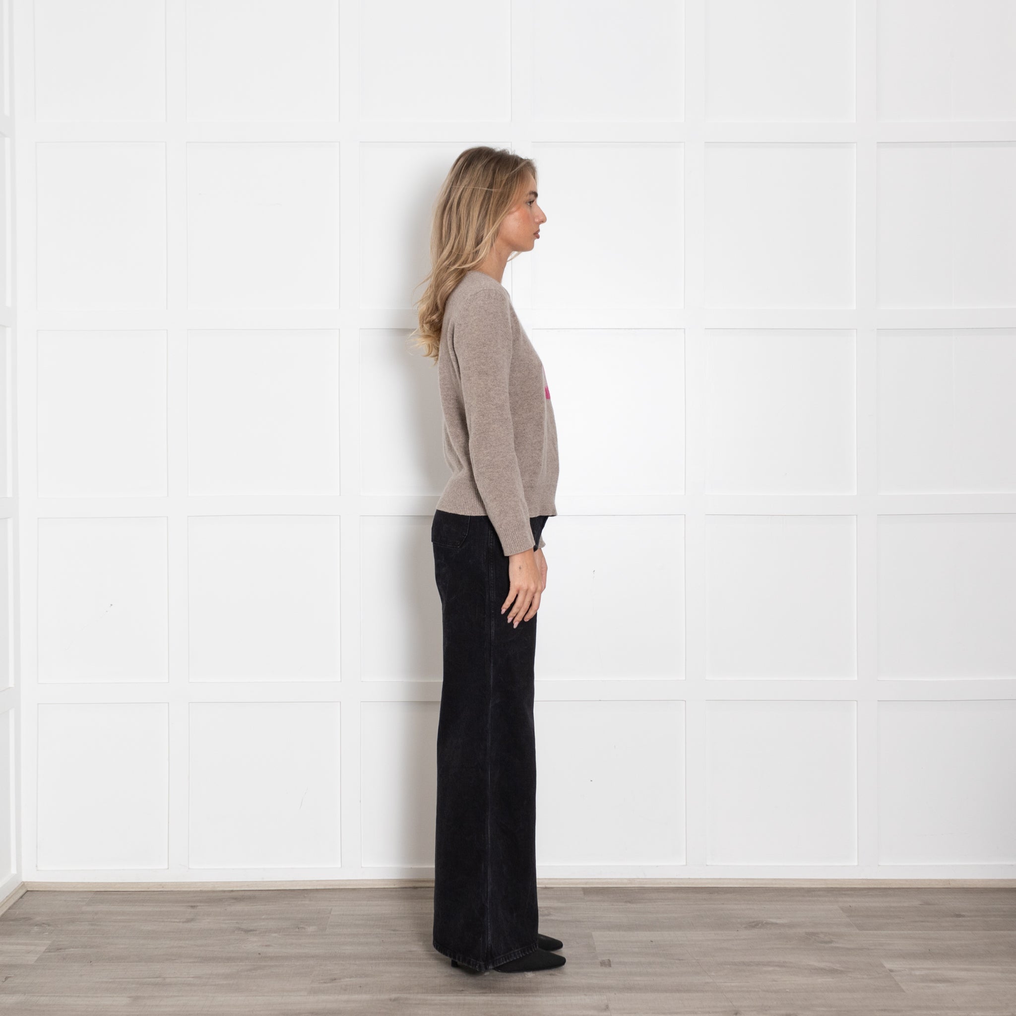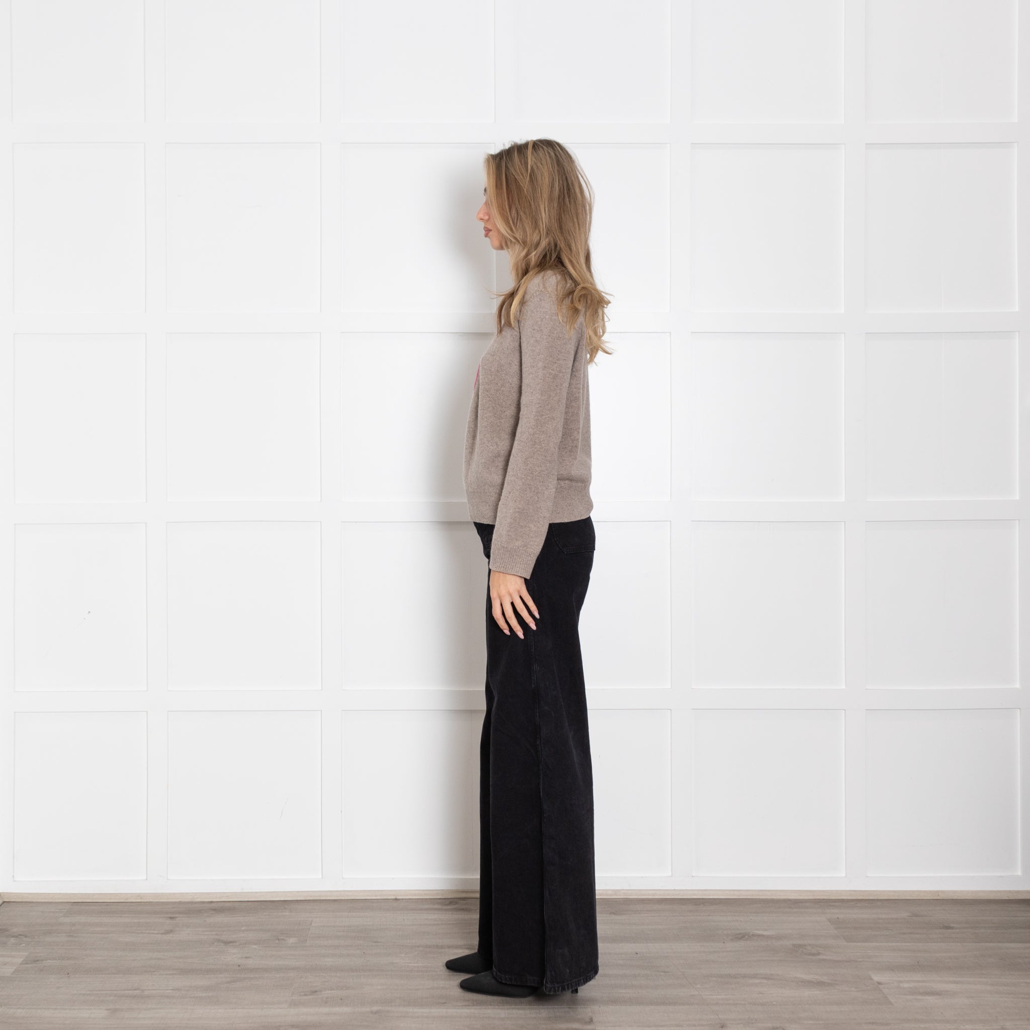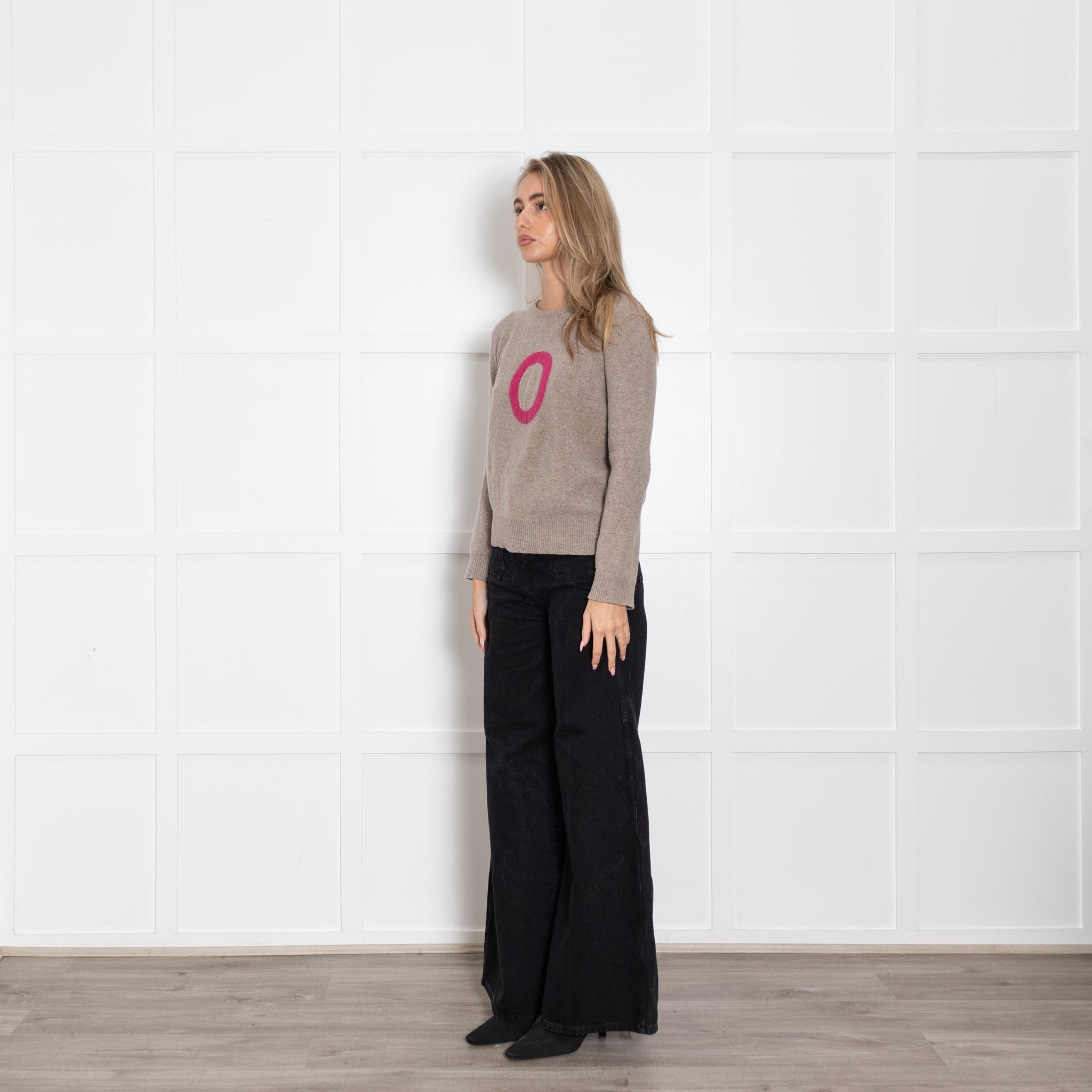 Hades taupe long-sleeve wool jumper, featuring a stunning pink embroidered front 'O' design, with a classic rounded neckline.