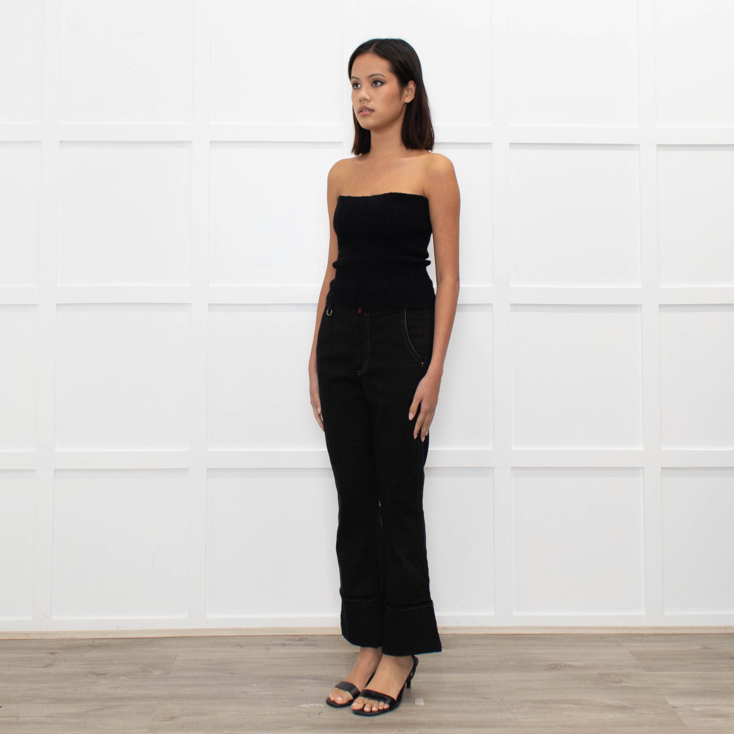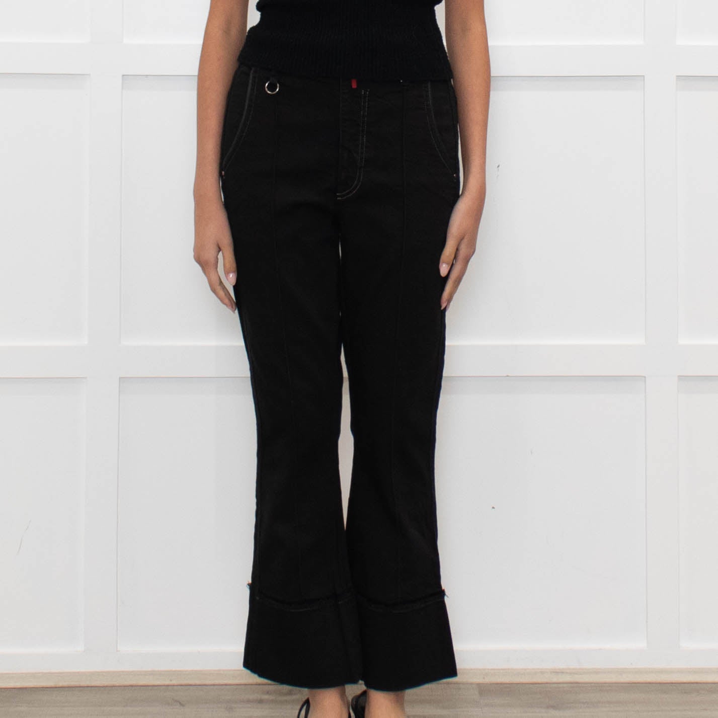 High black denim flared trousers with rolled-up frayed edge hems and logo detailing. These jeans feature concealed front zip and metal button flies, belt loops, and five pockets.