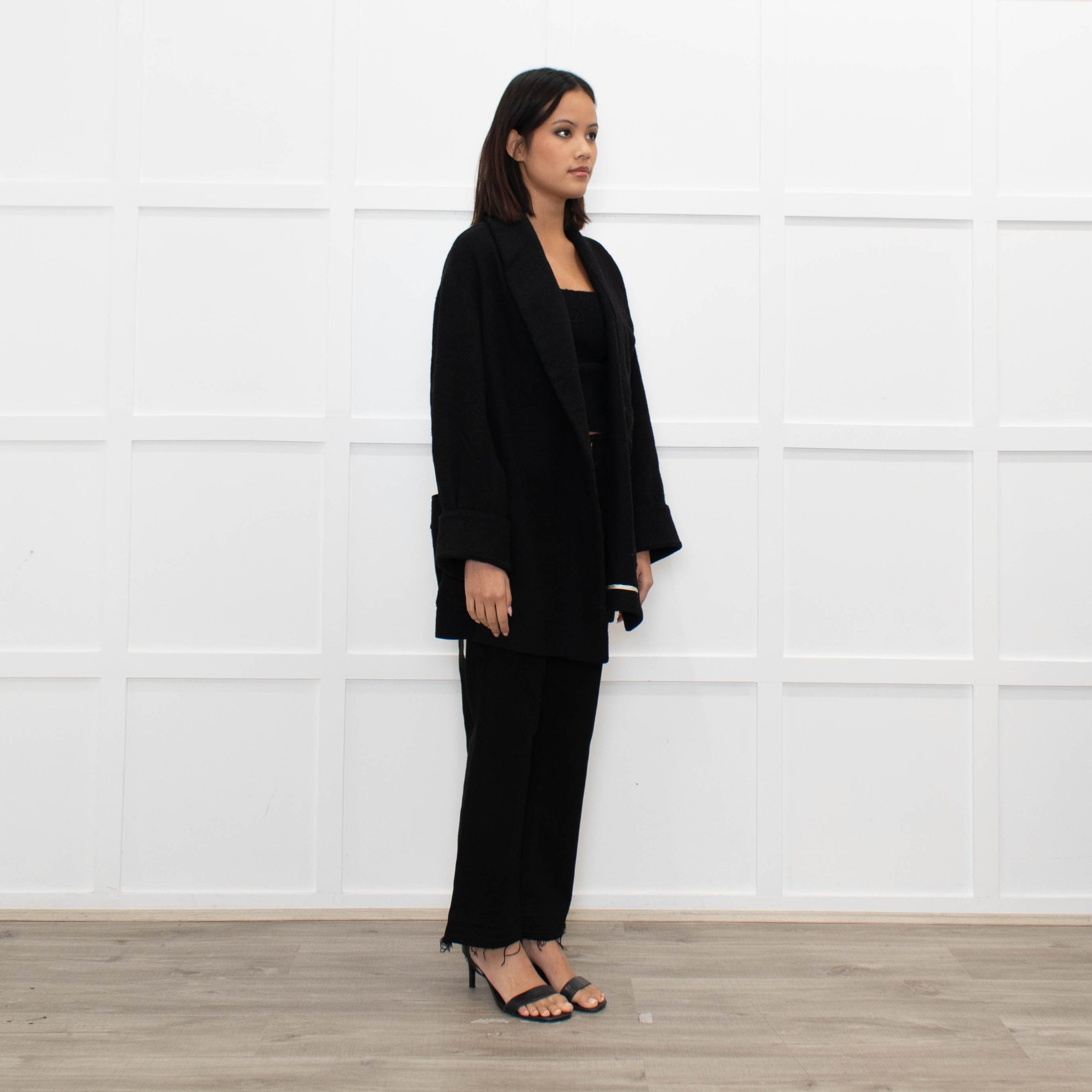 Isabel Marant Etoile black gauzy weave wool soft unlined jacket with a belted waist, shawl style collar, and three front patch pockets.