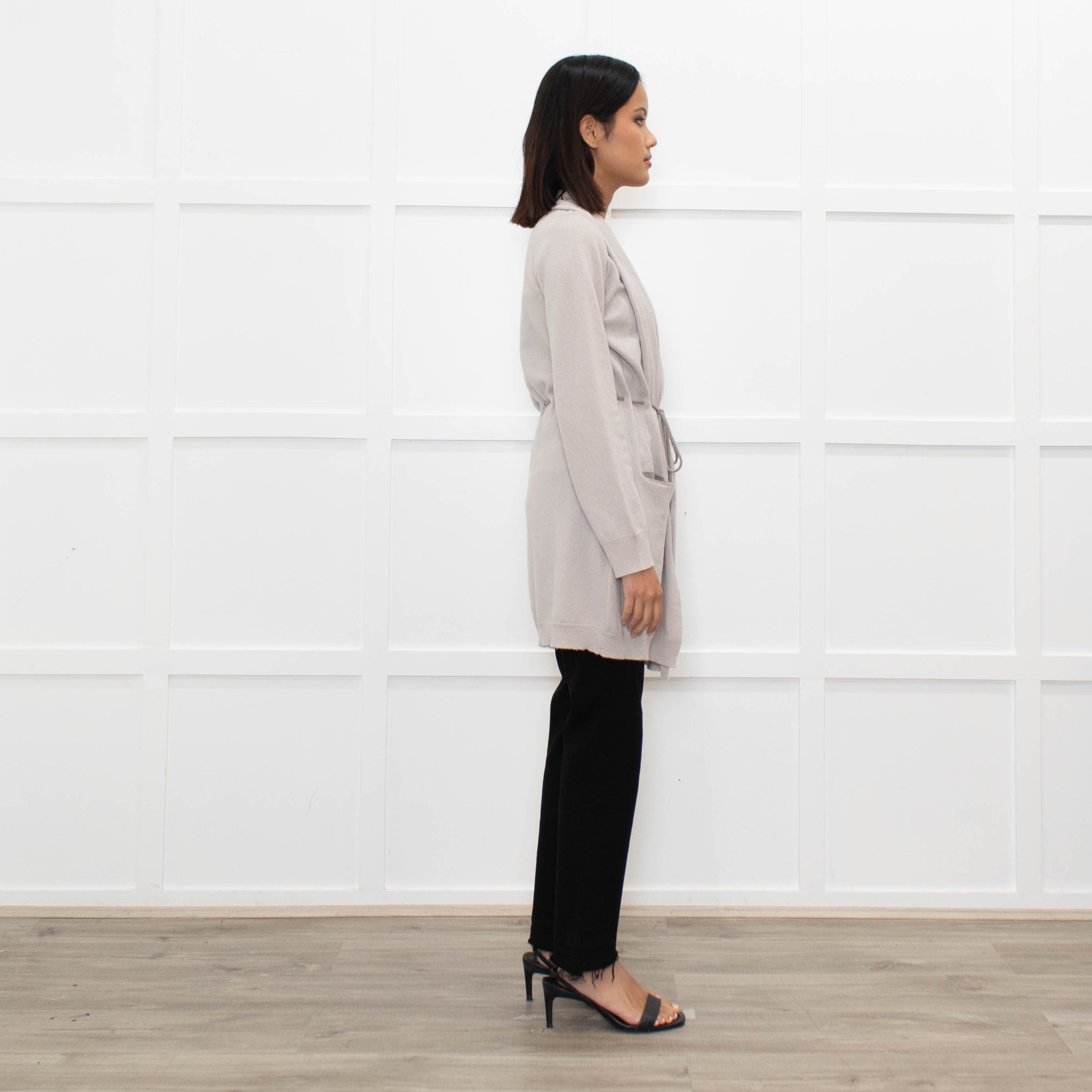Johnstons Of Elgin taupe cashmere long cardigan with a drawstring waist effect, two front slip pockets, and ribbed trims.
