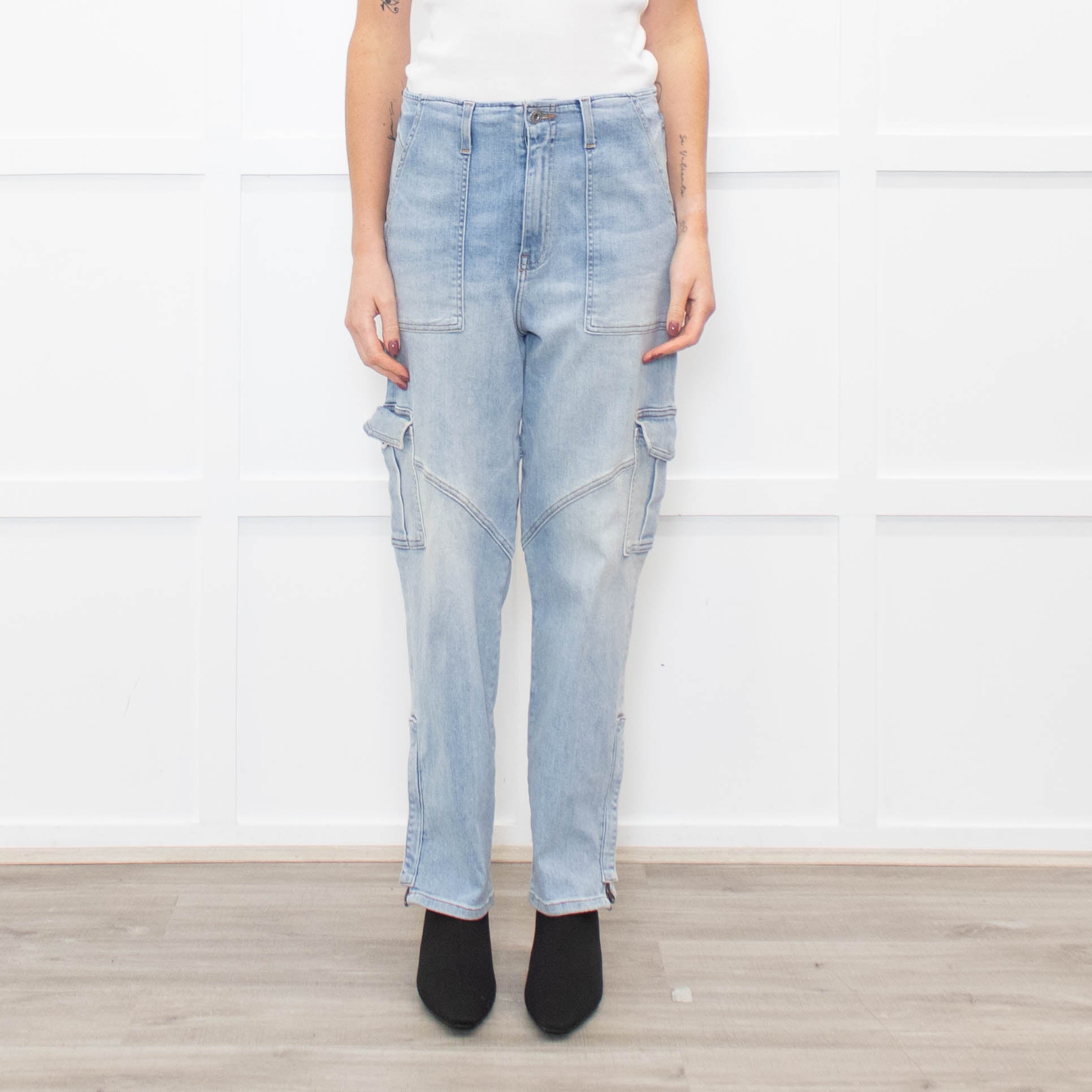Jonathan Simkhai pale blue wash jeans in a cargo style with side pockets on the legs, belt loops, contrast top stitching, side slip pockets, and zips at the ankle.
