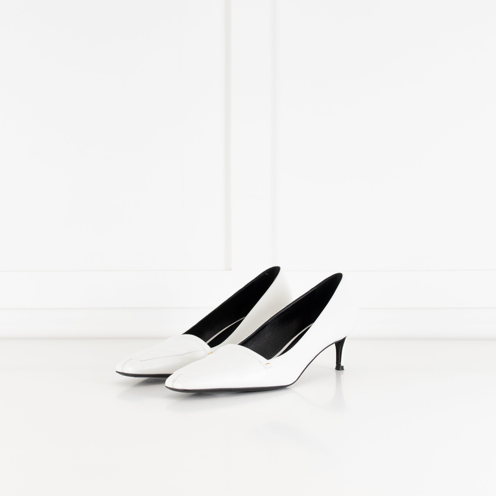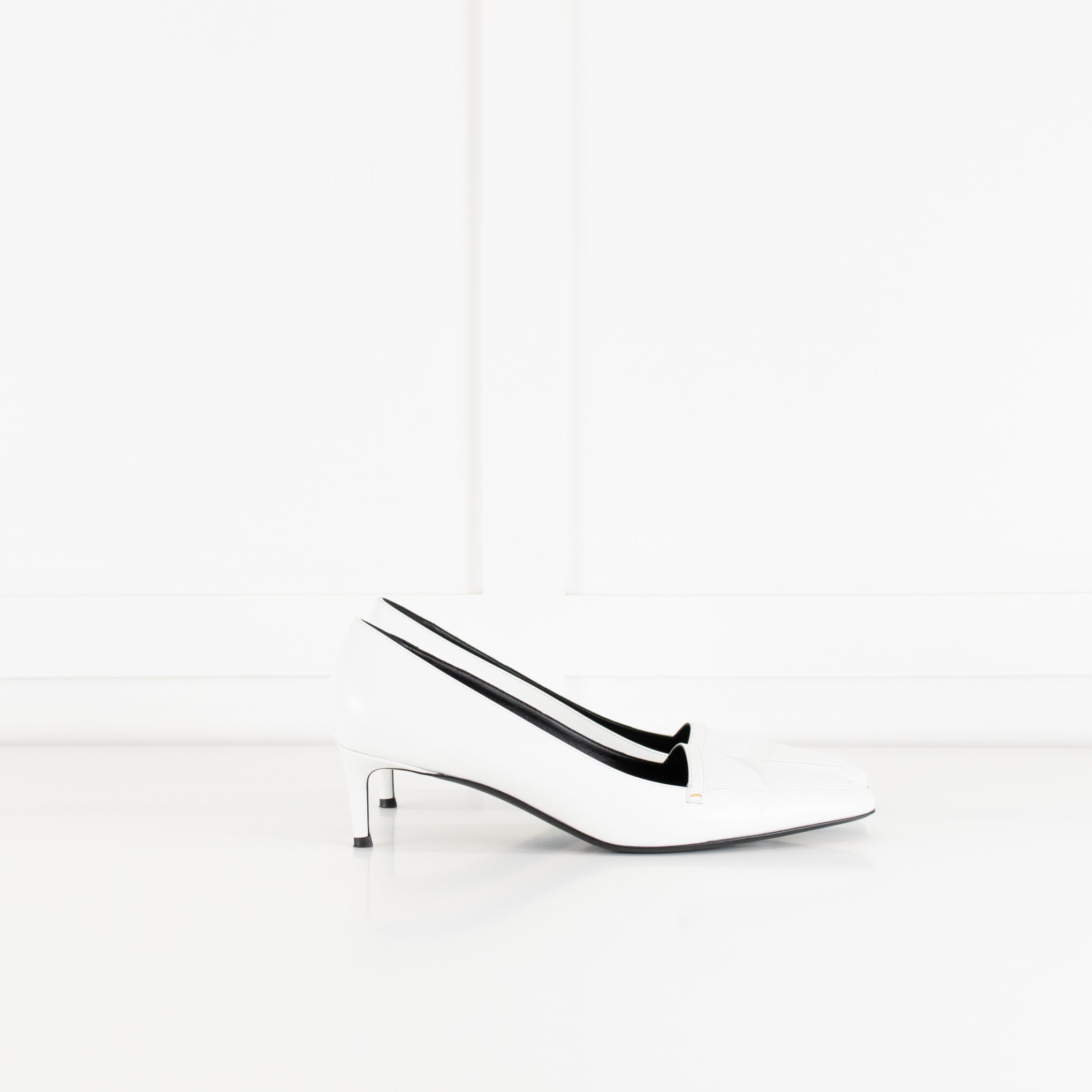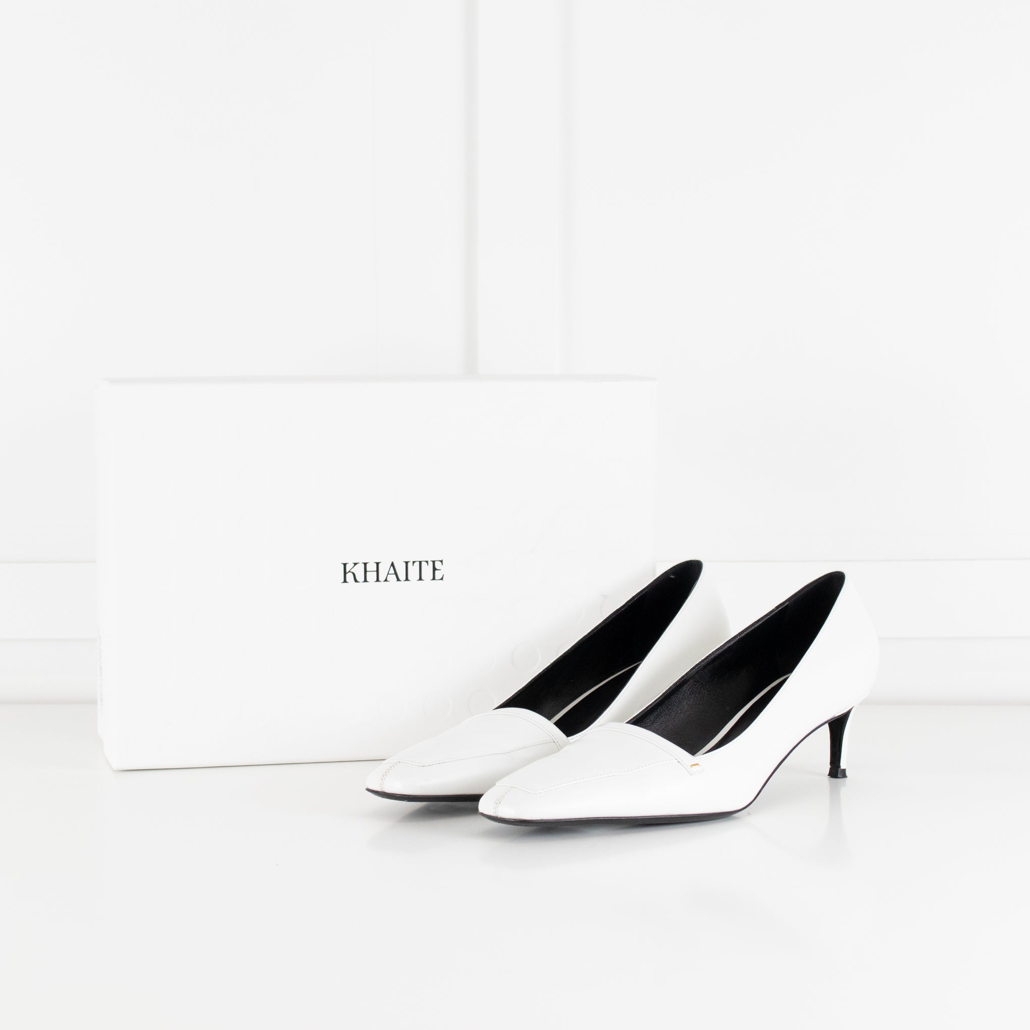 Khaite white smooth leather Celia kitten heeled court shoes with subtle gold-tone metal detailing, a squared off toe, and tonal top stitching. Accompanied by the original dust bag and box. Current season RRP £830.