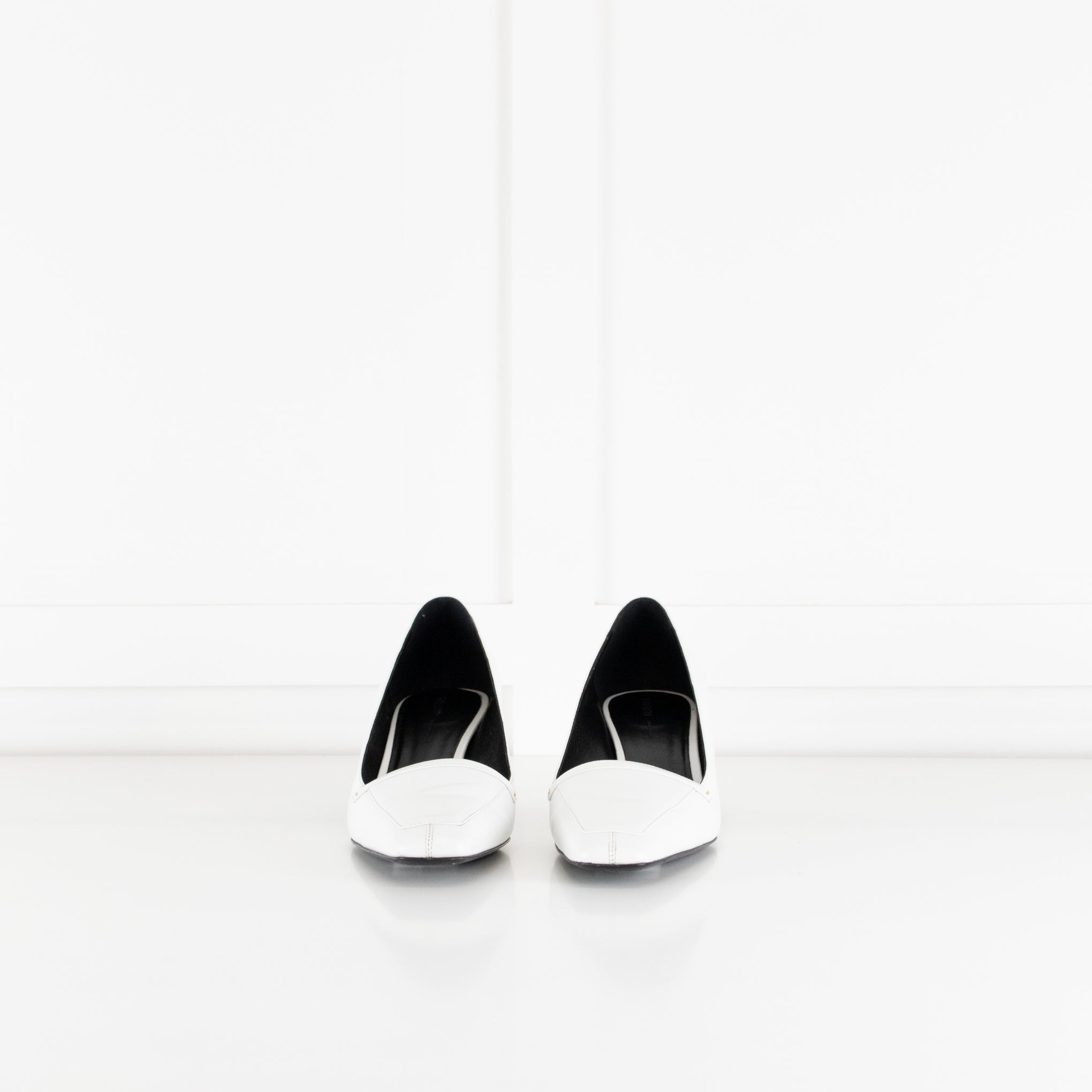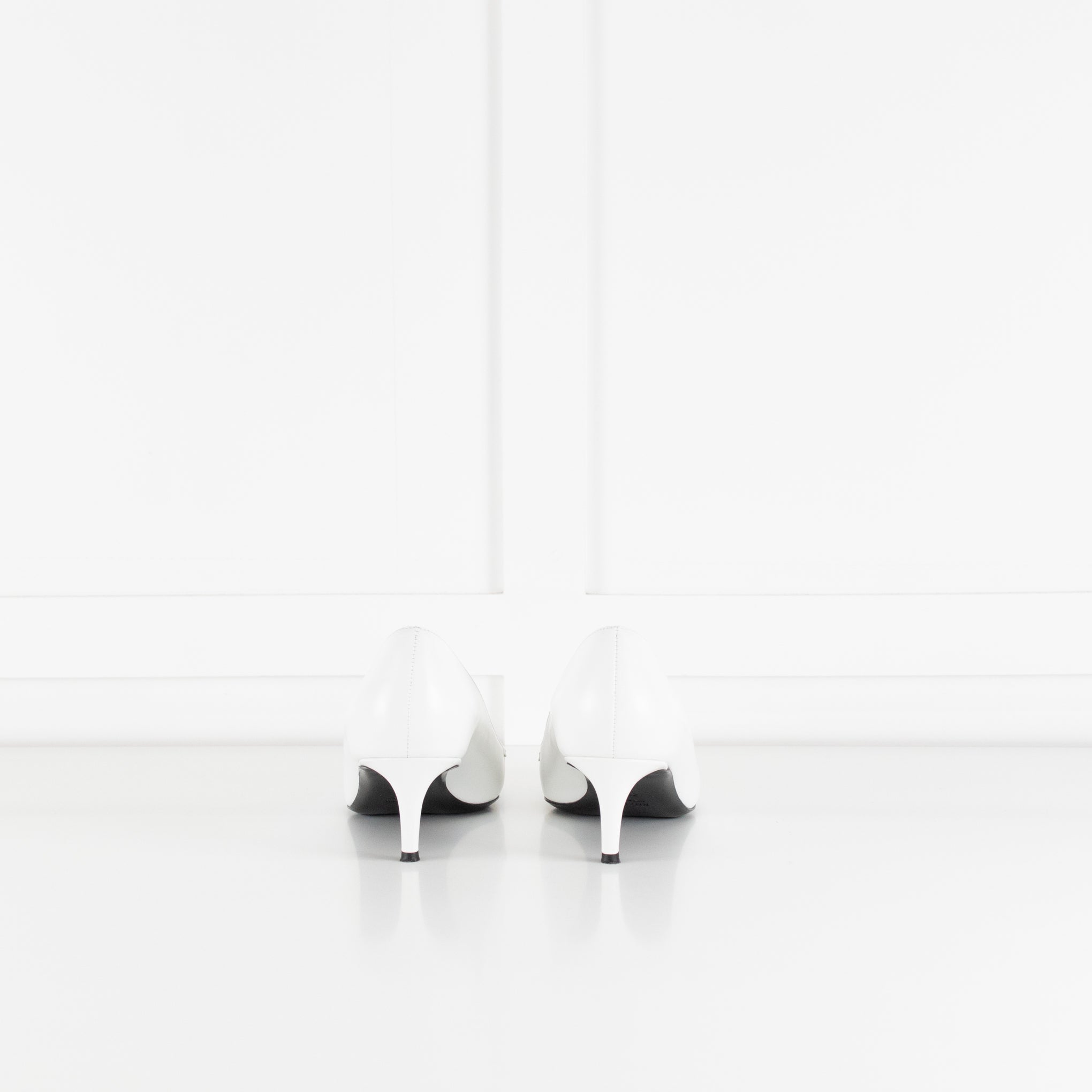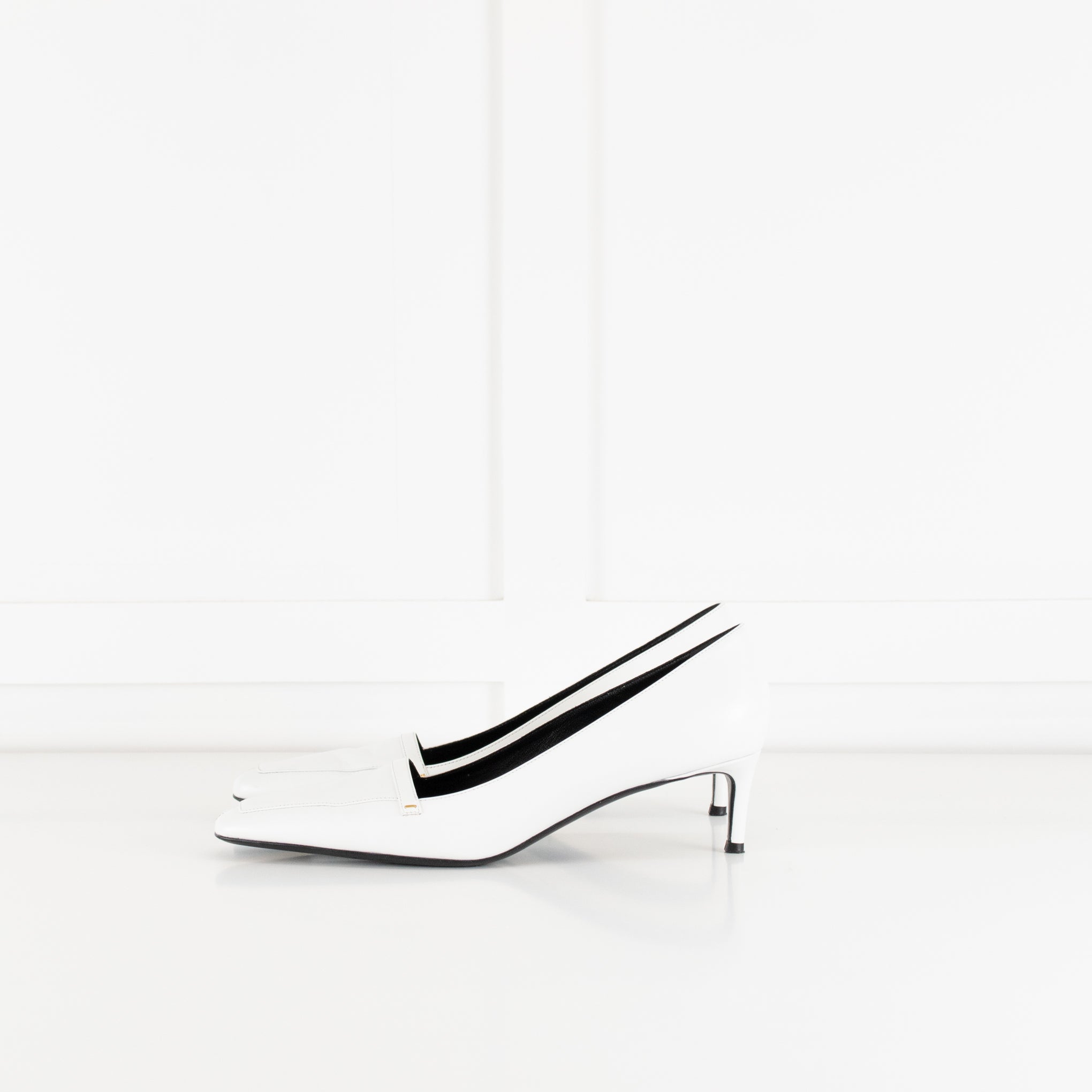Khaite white smooth leather Celia kitten heeled court shoes with subtle gold-tone metal detailing, a squared off toe, and tonal top stitching. Accompanied by the original dust bag and box. Current season RRP £830.