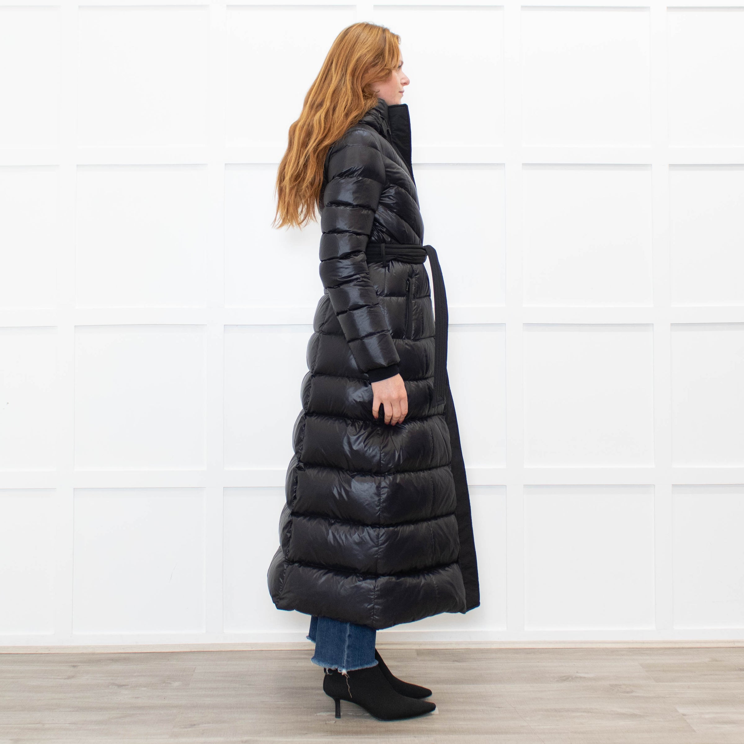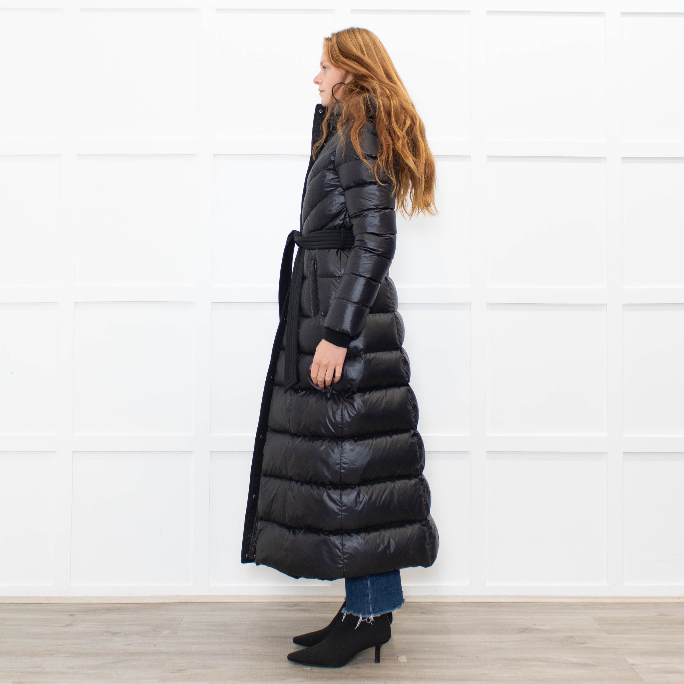 Mackage black nylon quilted long puffer coat with a matching belt a zip up front, long sleeves, side zipped pockets,