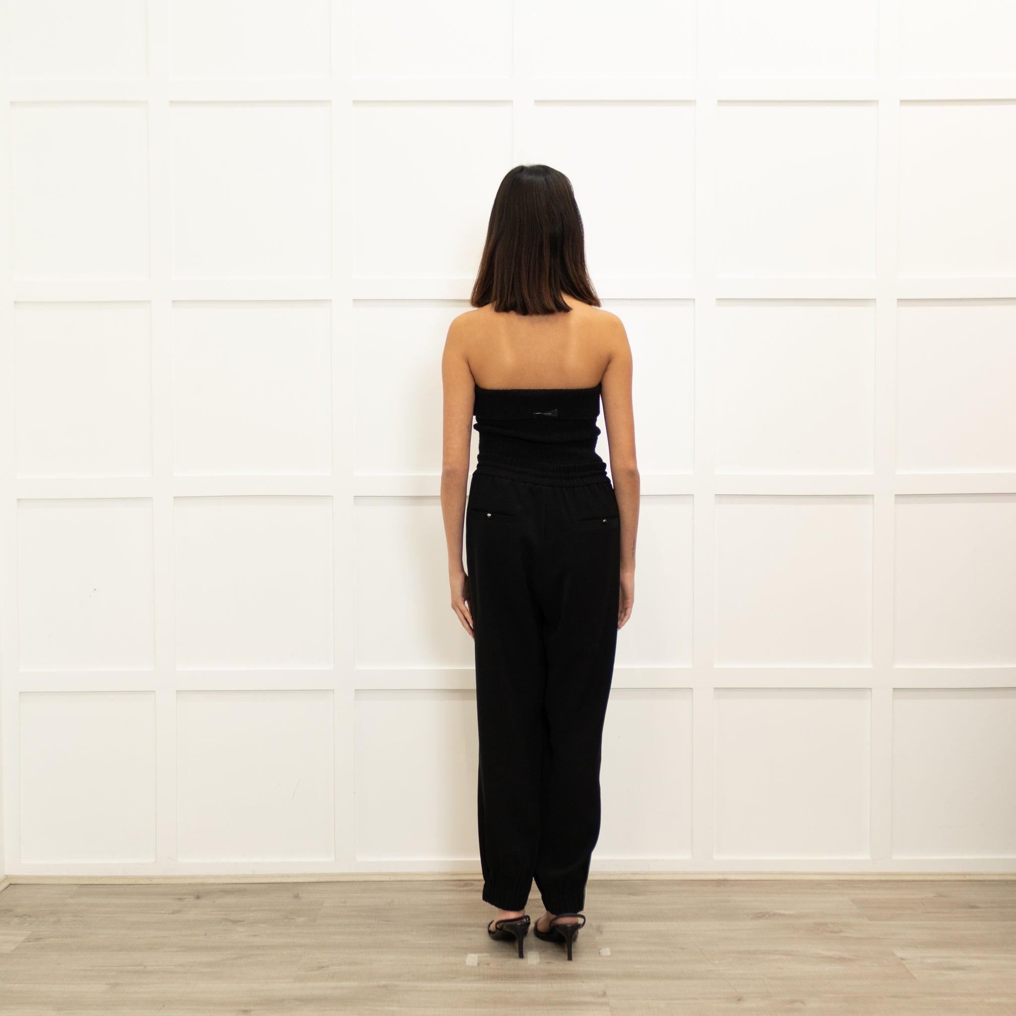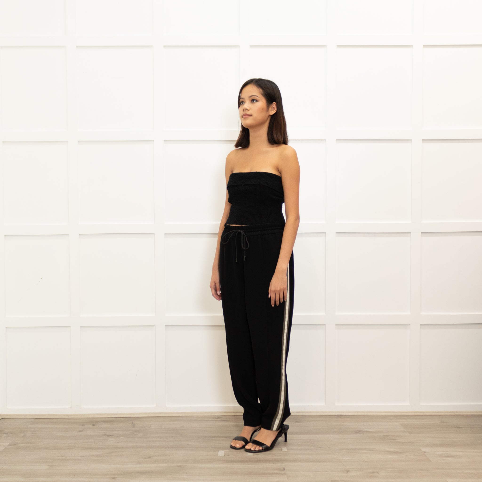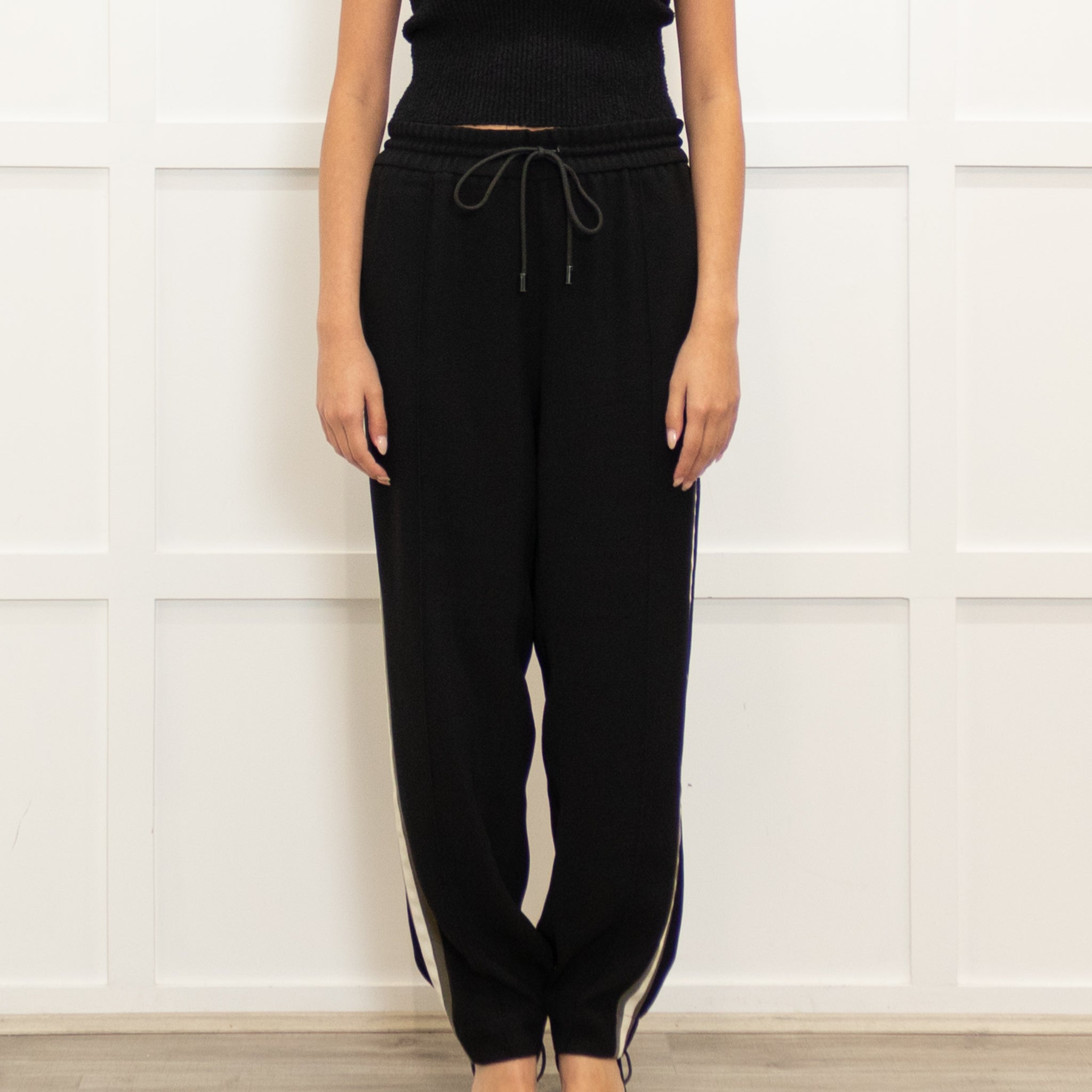 Me + Em black and cream joggers, featuring a side stripe design, with two back button pockets, two front pockets, and a drawstring waist tie.