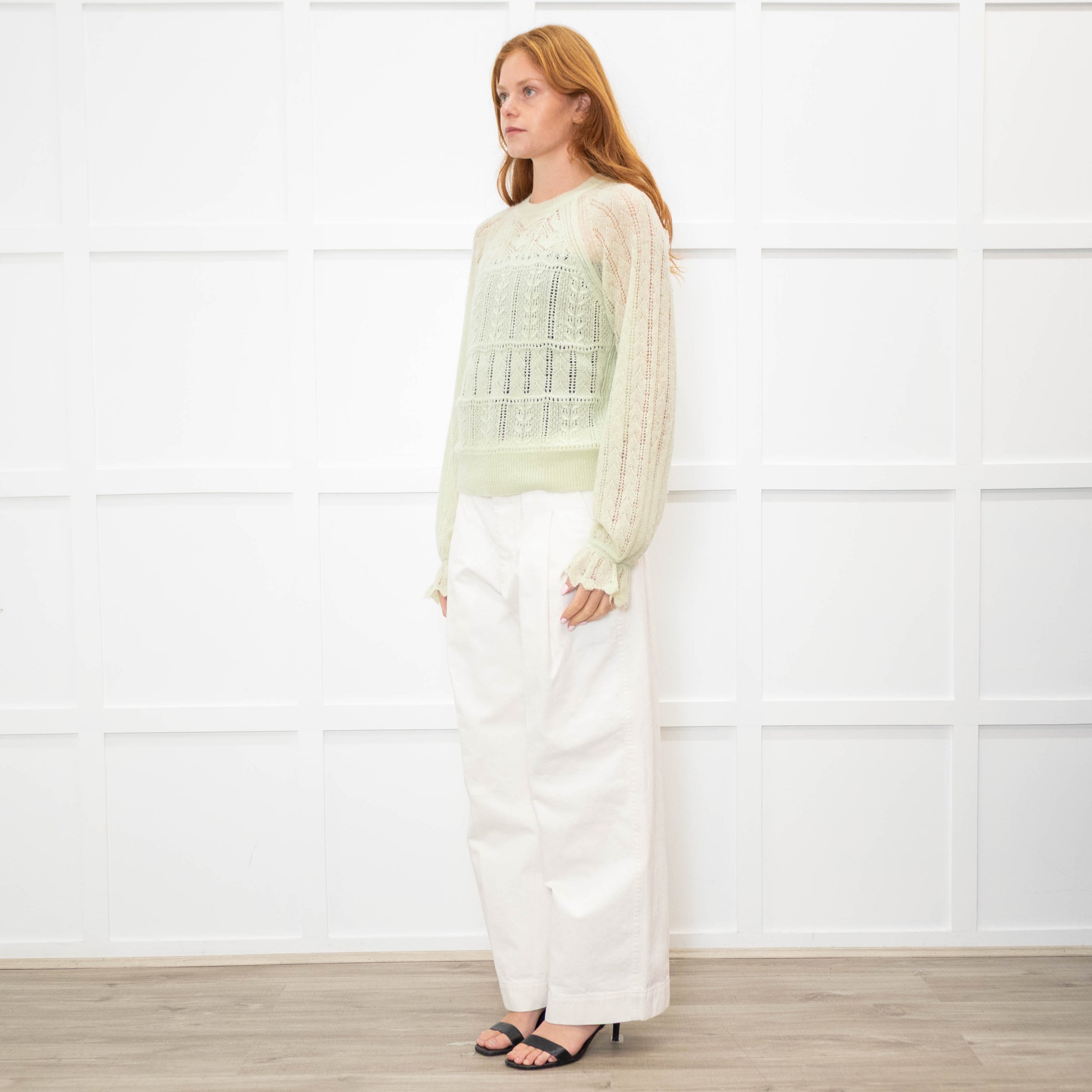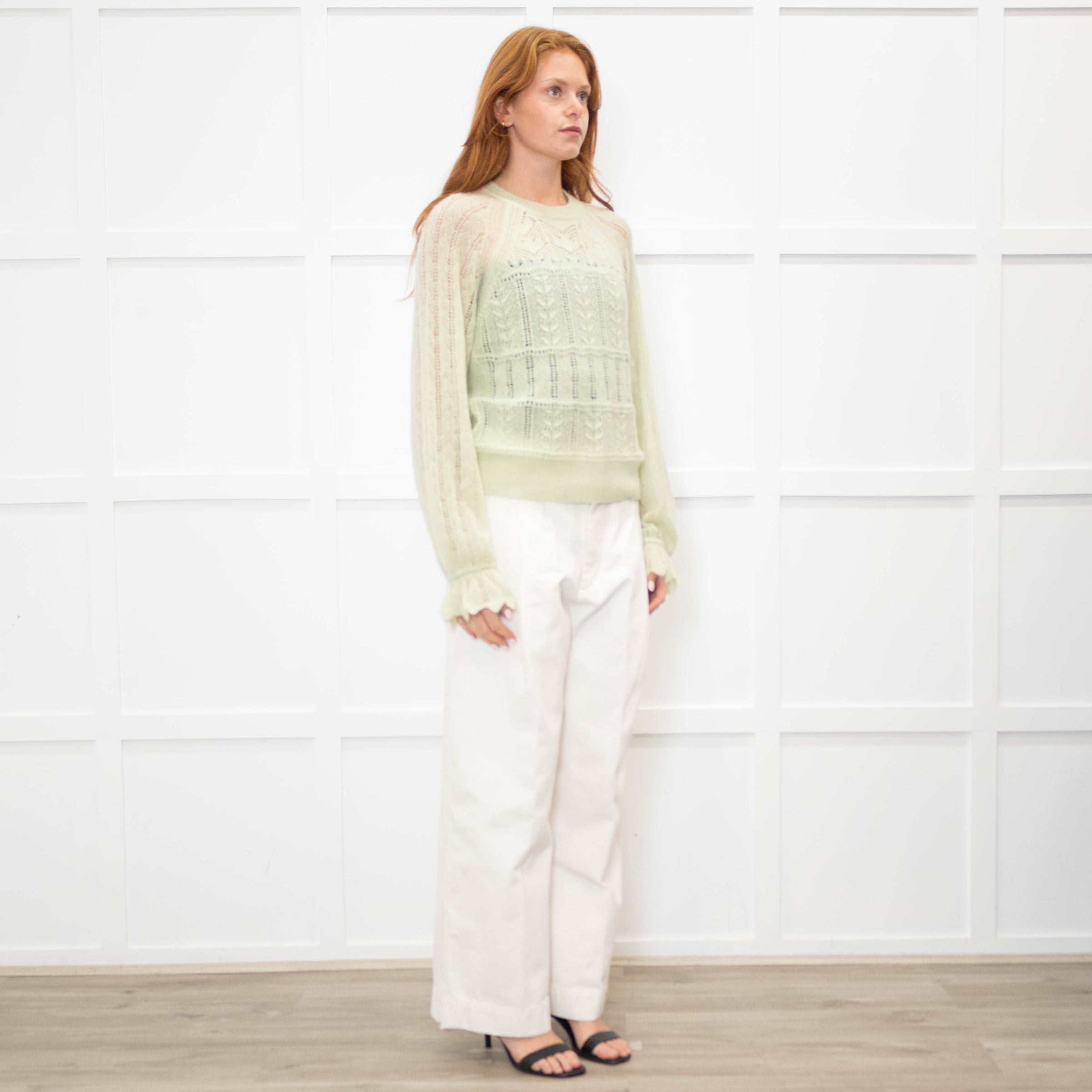 Me + Em mint green crochet knit jumper with ribbed trims and a fluted cuff.