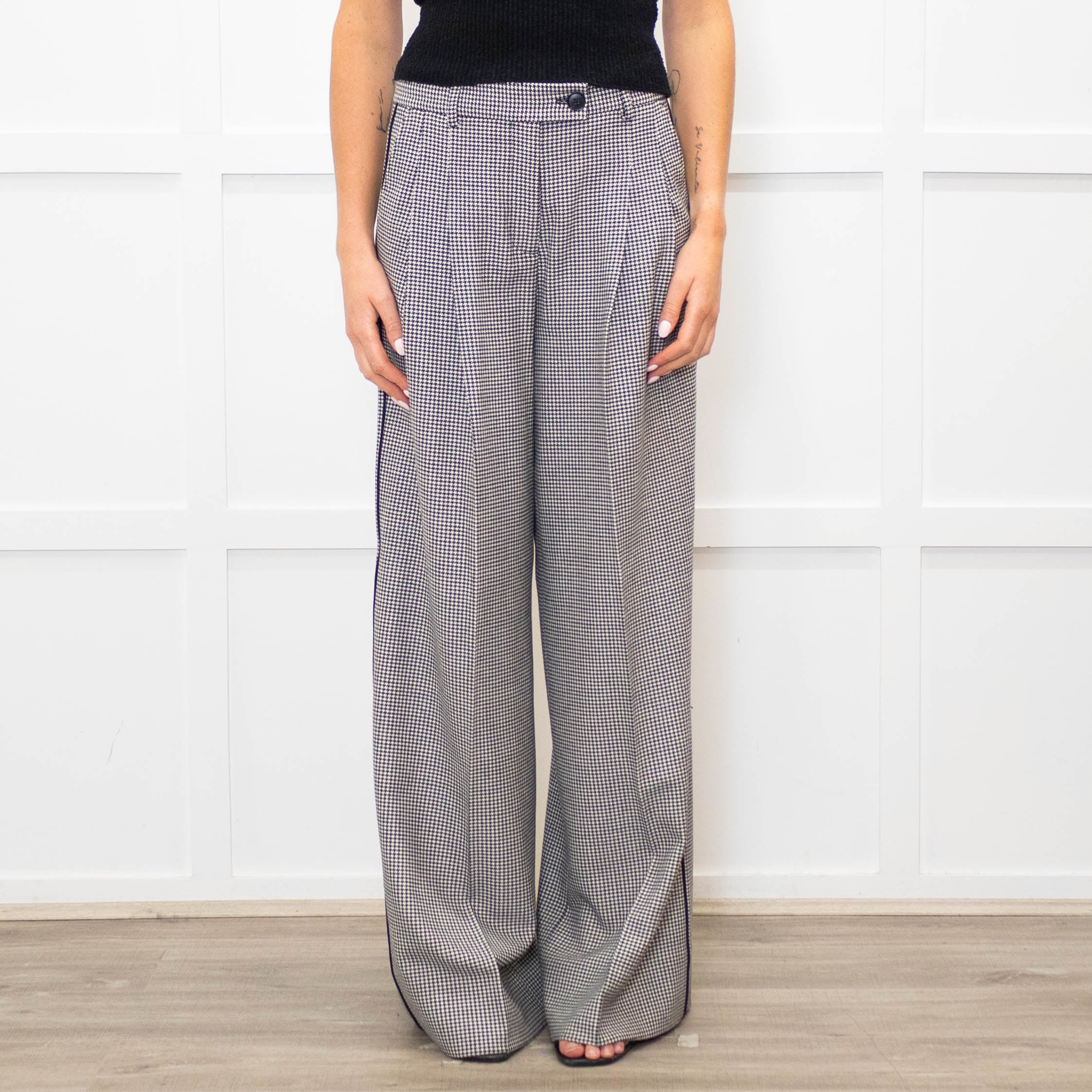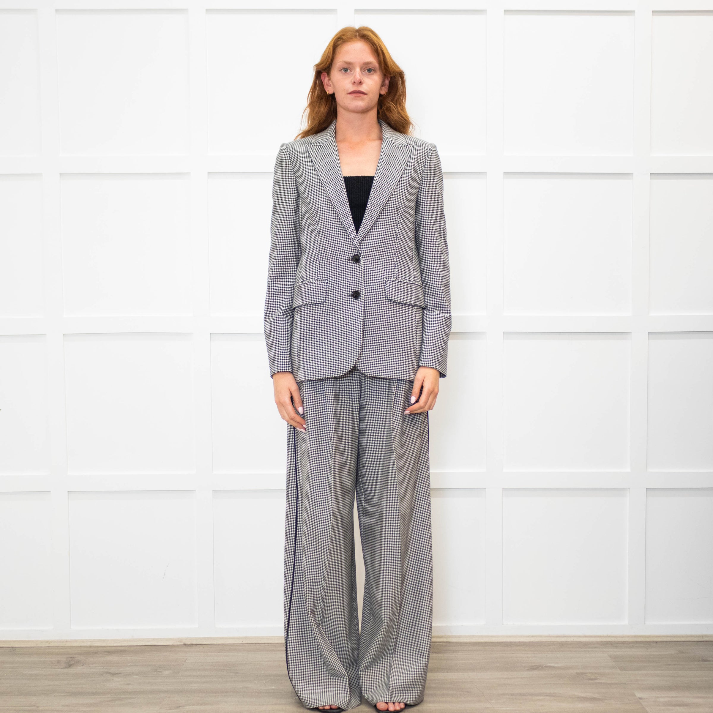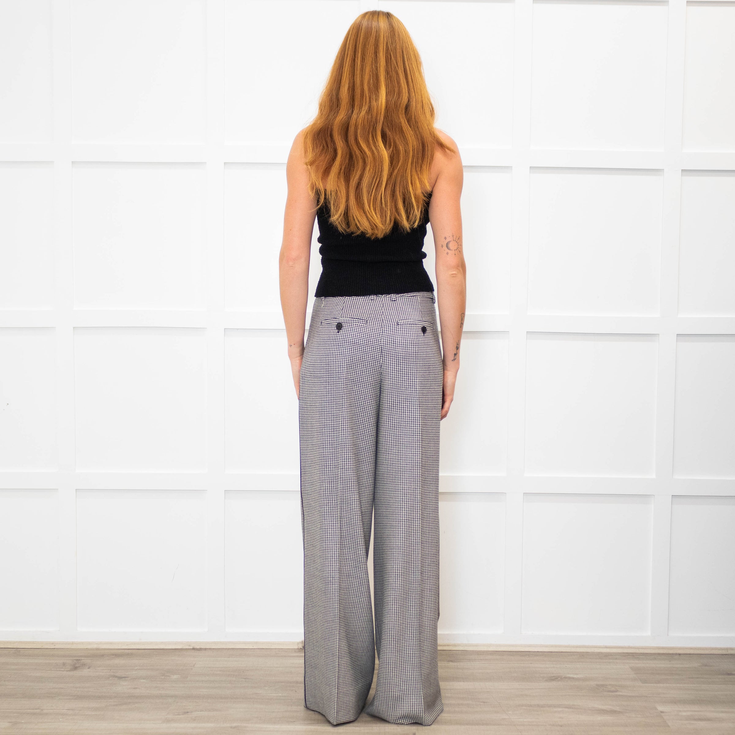 Me + Em black and white small houndstooth pleated front wide leg trousers with a tailored waistband, belt loops, side slip pockets, and a small black side stripe. The matching jacket is available separately.