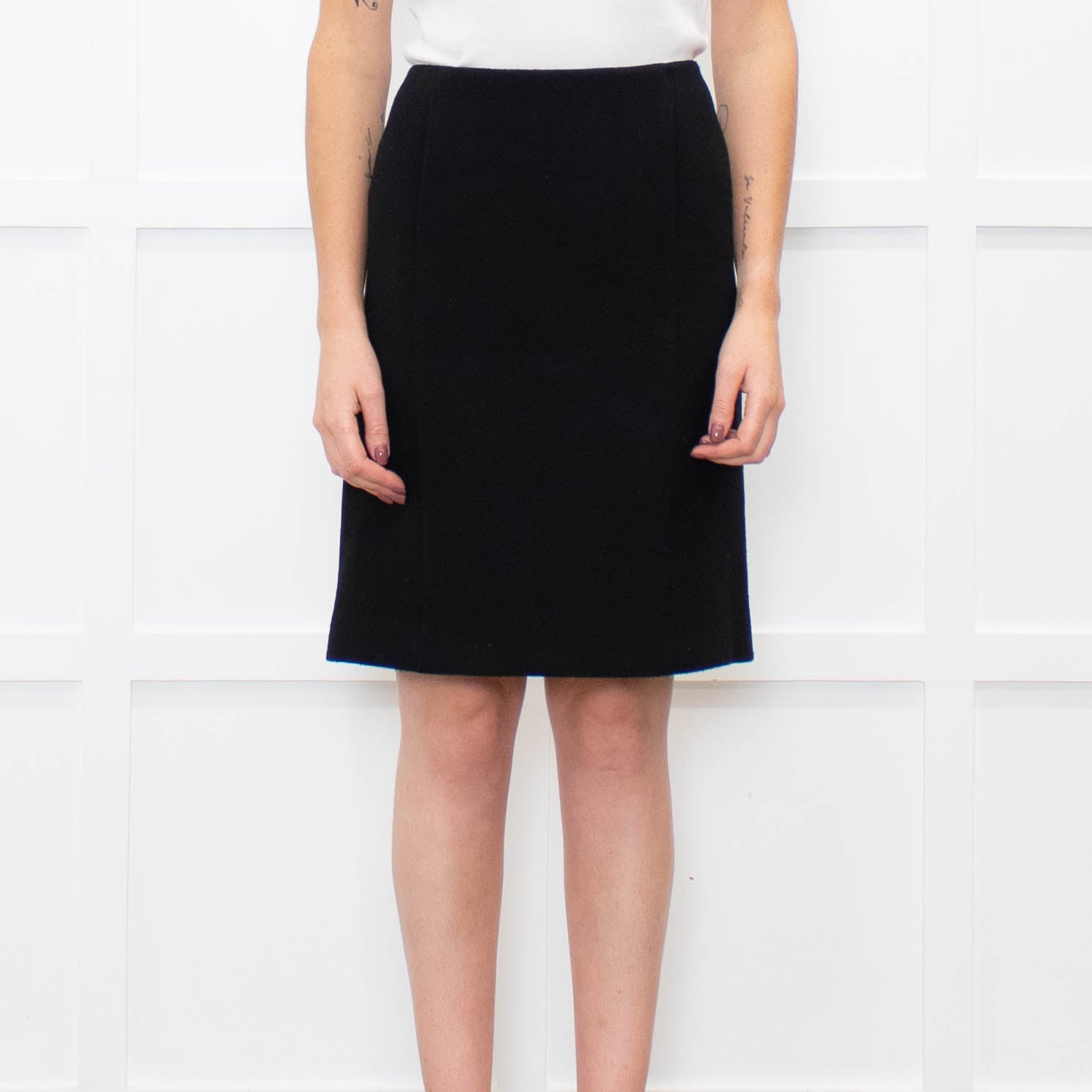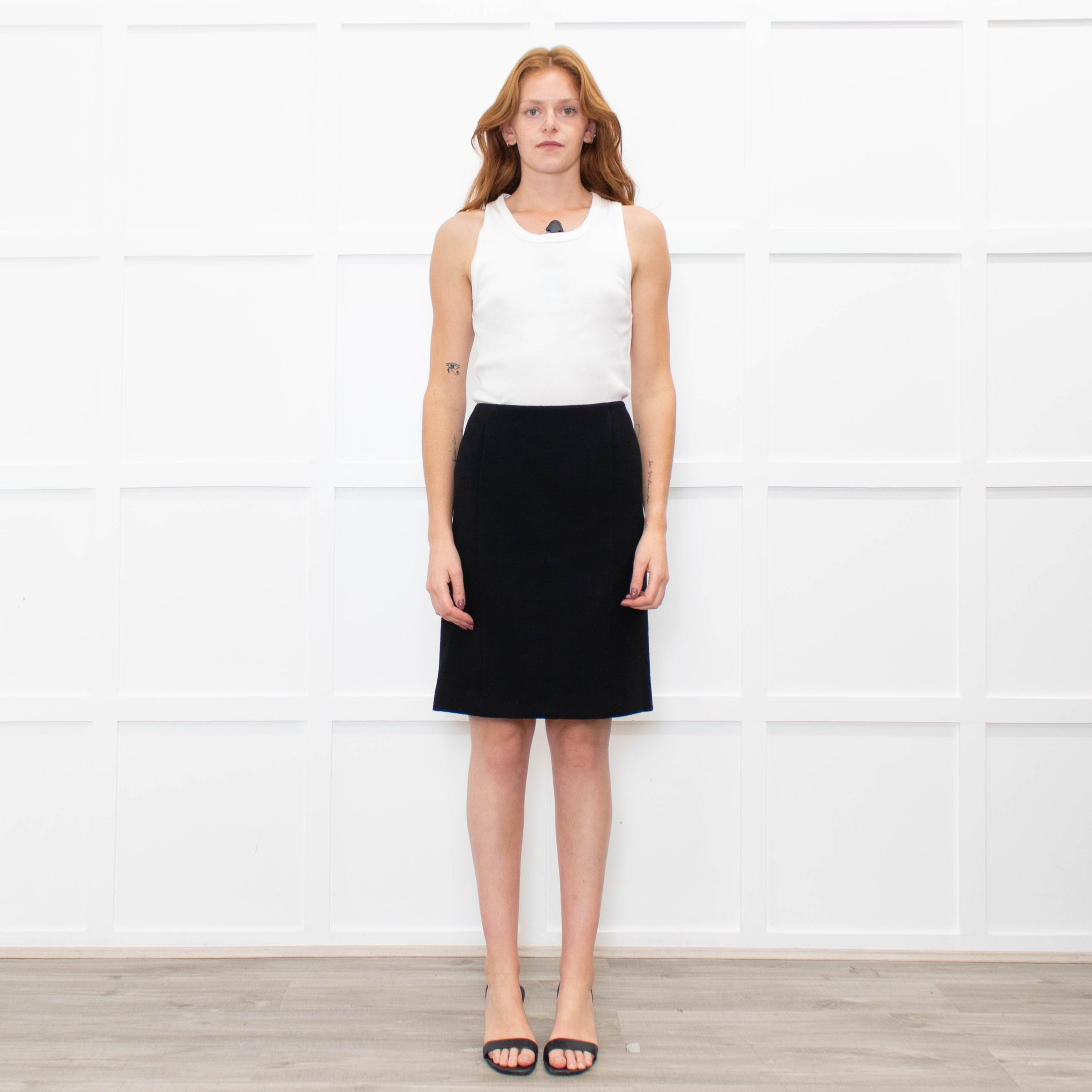 Miu Miu black wool pencil skirt with a fixed waistband, two slip pockets in the front panel of the skirt, a rear hem split, full lining, and a rear zip fastener.