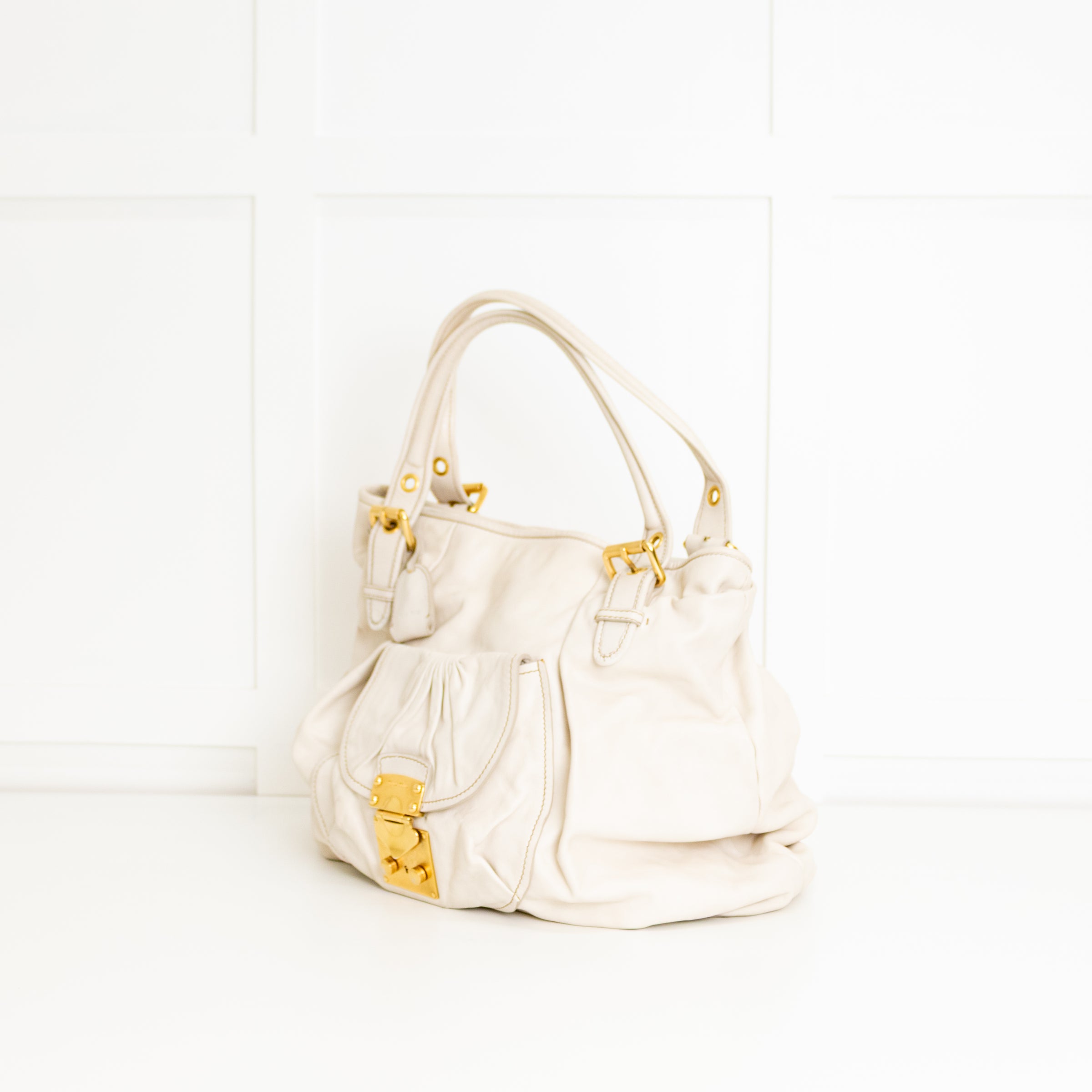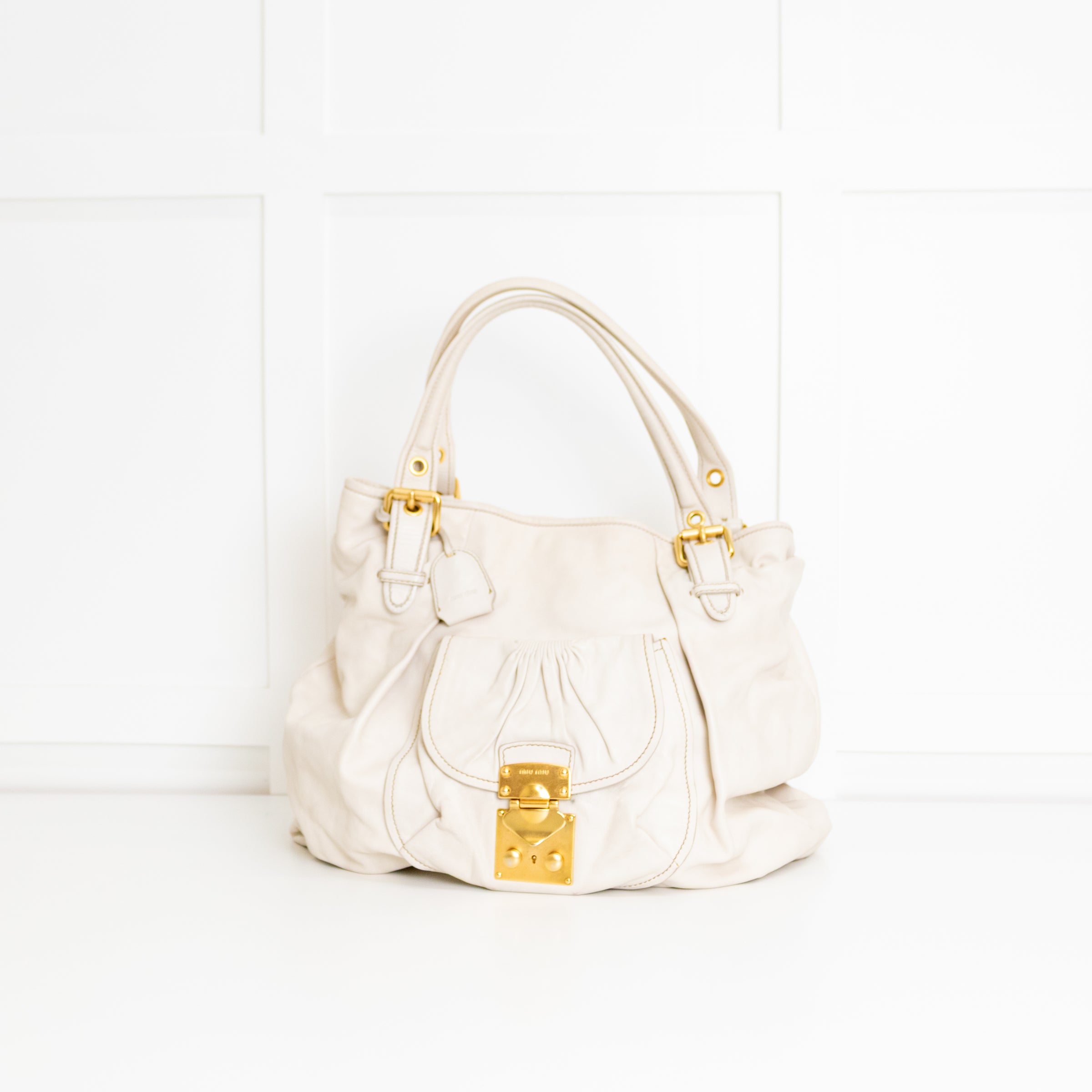 Miu Miu large slouchy cream leather tote bag with gold-tone hardware, buckled shoulder straps, a front patch pocket, and a magnetic top closure.