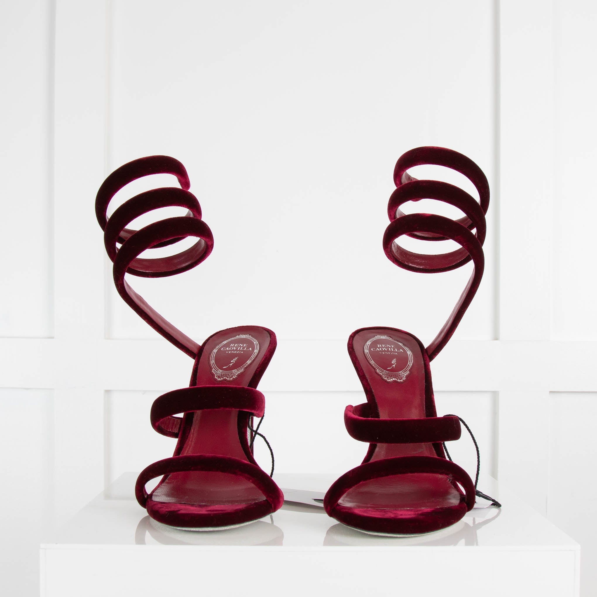 Rene Caovilla Cleo 105 velvet sandals in burgundy. The Cleo sandals are the brand's most renowned style, with signature wrap-around ankle straps, stiletto heels of approximately 105mm, almond-shaped open toes, silver sparkle soles, and branded leather footbeds.
