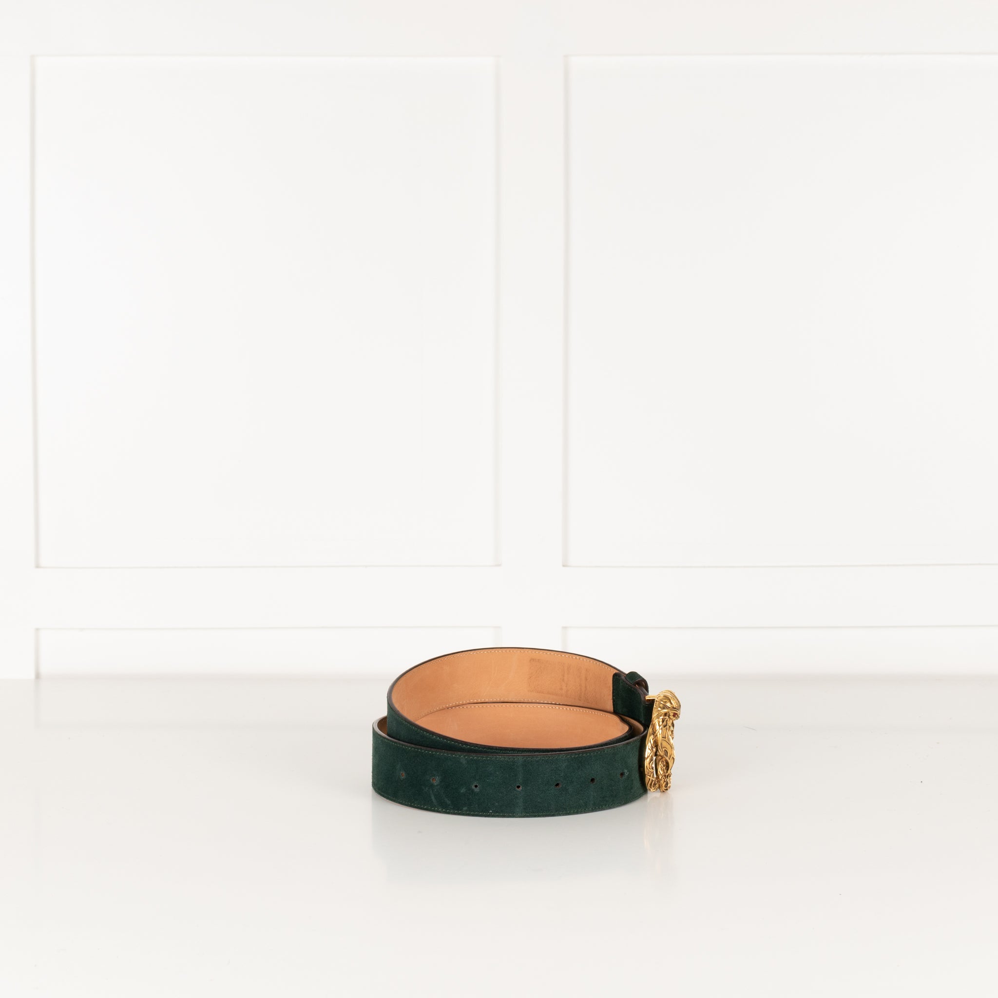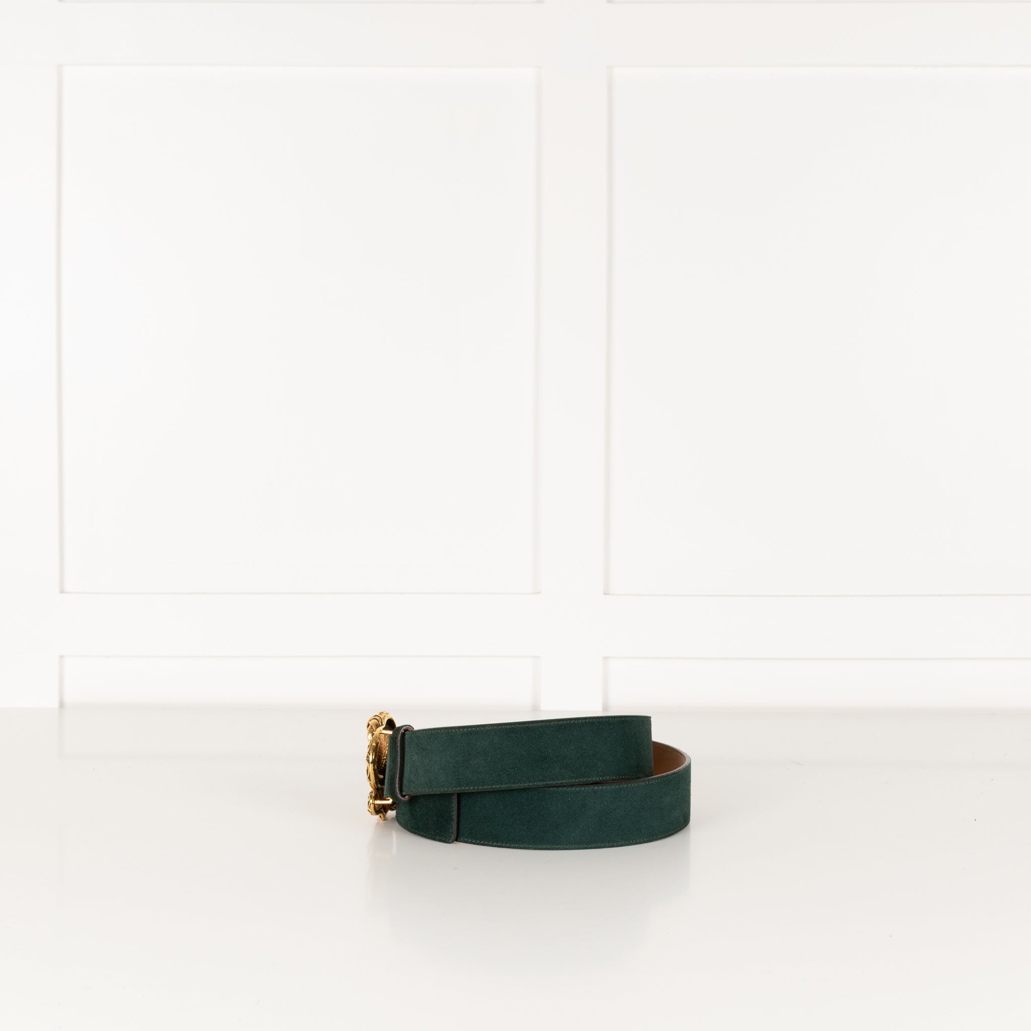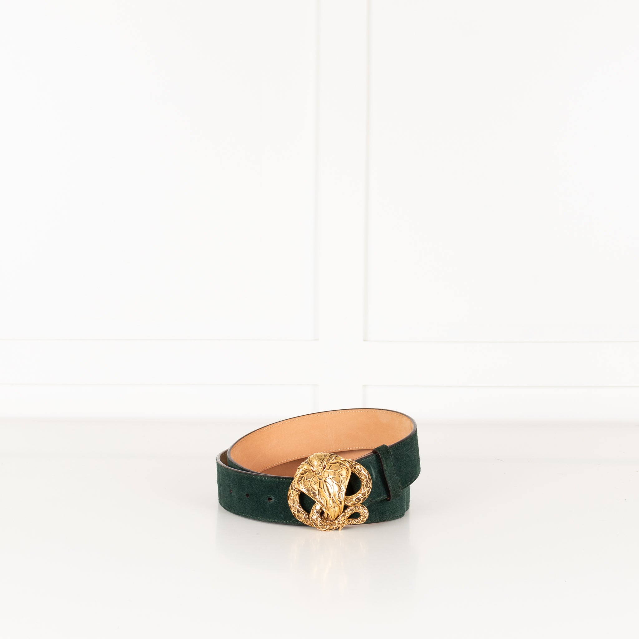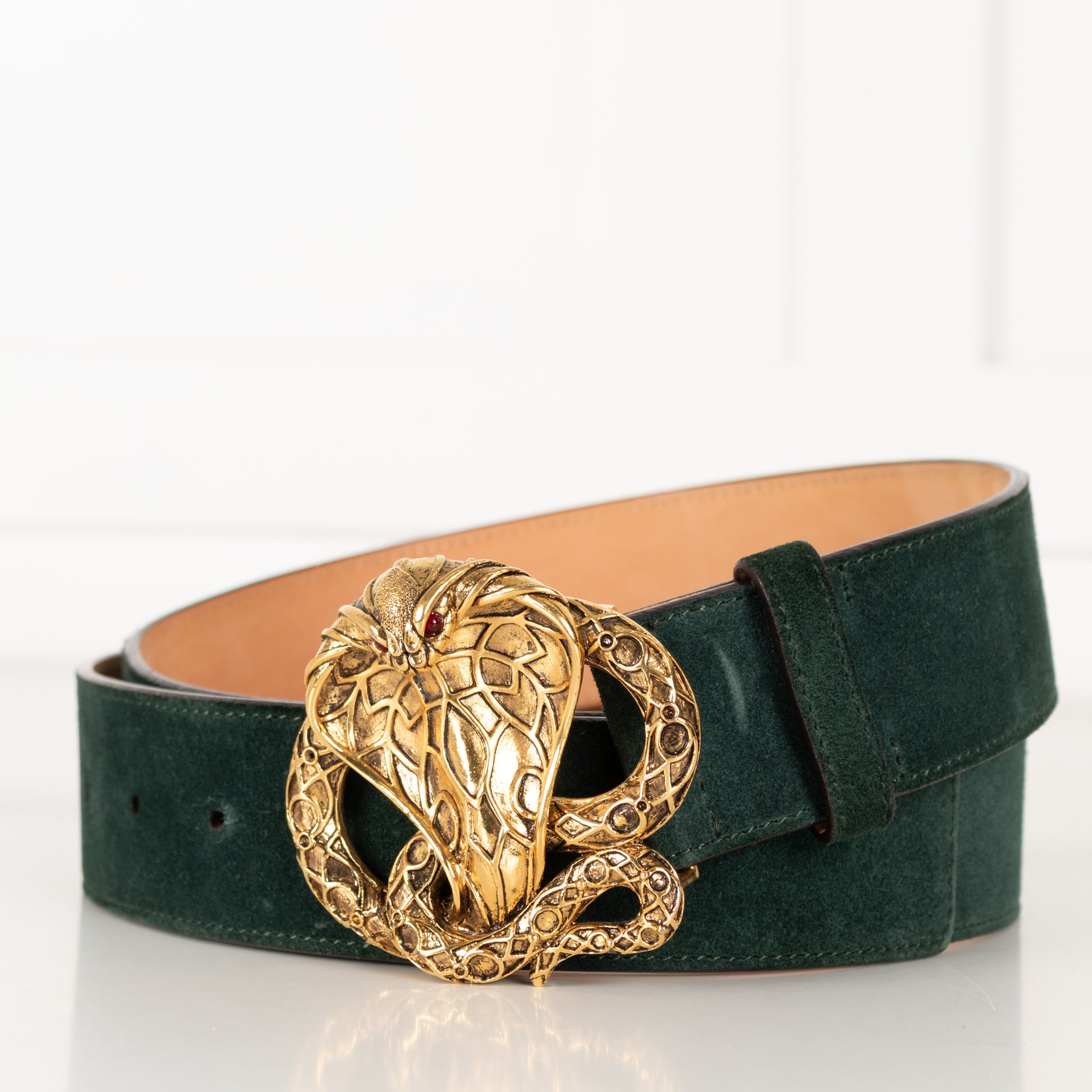 Roberto Cavalli green adjustable belt, crafted with a beautiful suede interior, with a large front gold snake design logo buckle, with a bright red eyes for a unique, elegant look.